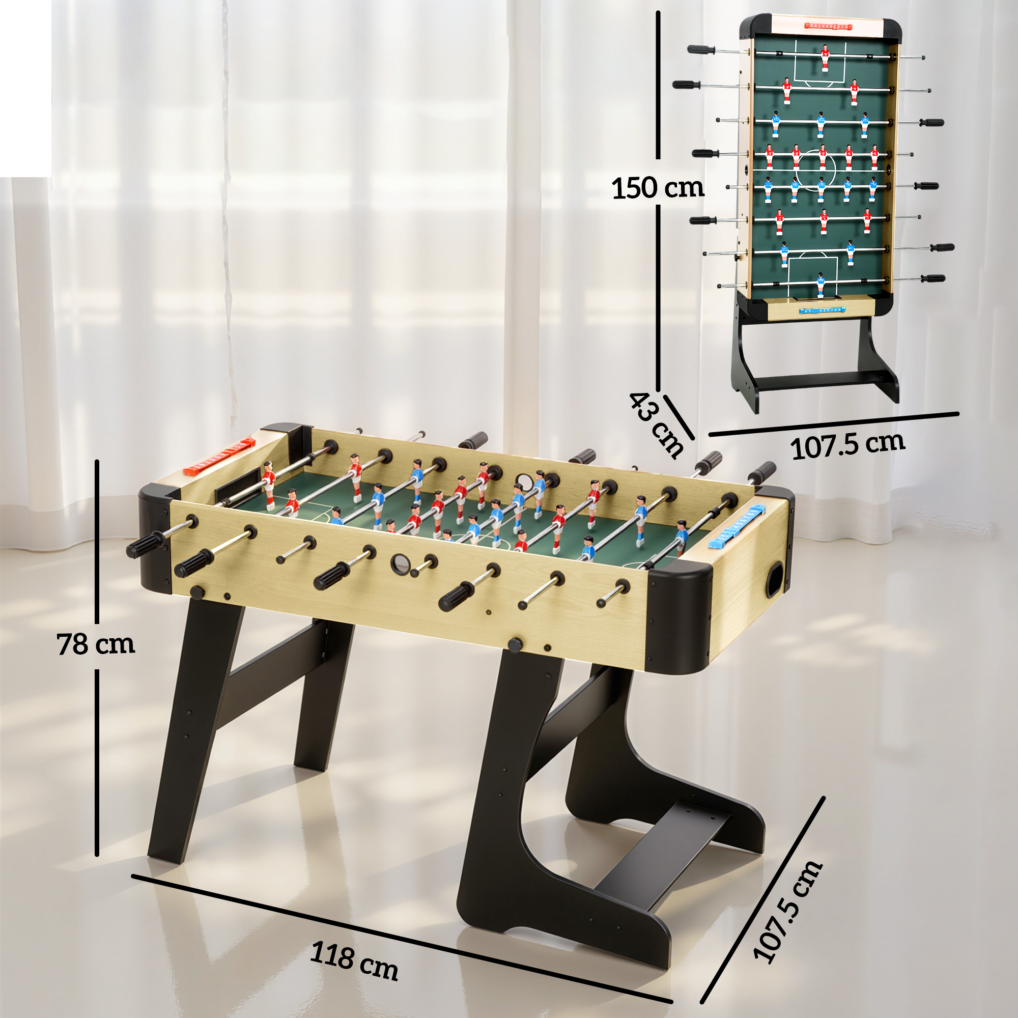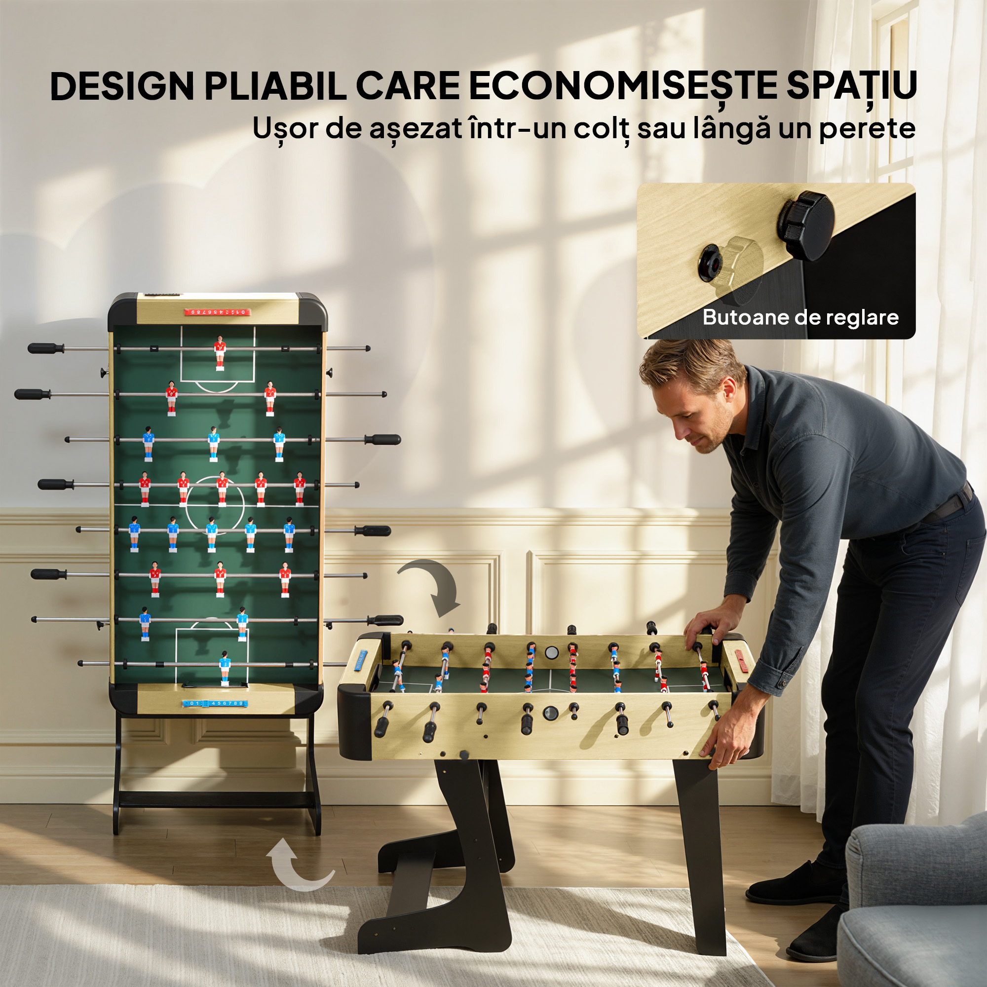 Invita prietenii sa se intreaca in sufragerie sau in sala de jocuri cu fotbalul de masa pliabil [BRAND NAME]. Structura este realizata din MDF robust cu aspect de lemn si picioare intarite care asigura stabilitate, iar pachetul include 22 de jucatori si 8 tije antiderapante din otel pentru a oferi meciuri pline de adrenalina pentru 2 sau 4 persoane. Dupa ce ai terminat de jucat, poti plia masa si depozita usor, economisind spatiu. Mentine casa ordonata si distractia mereu la indemana.