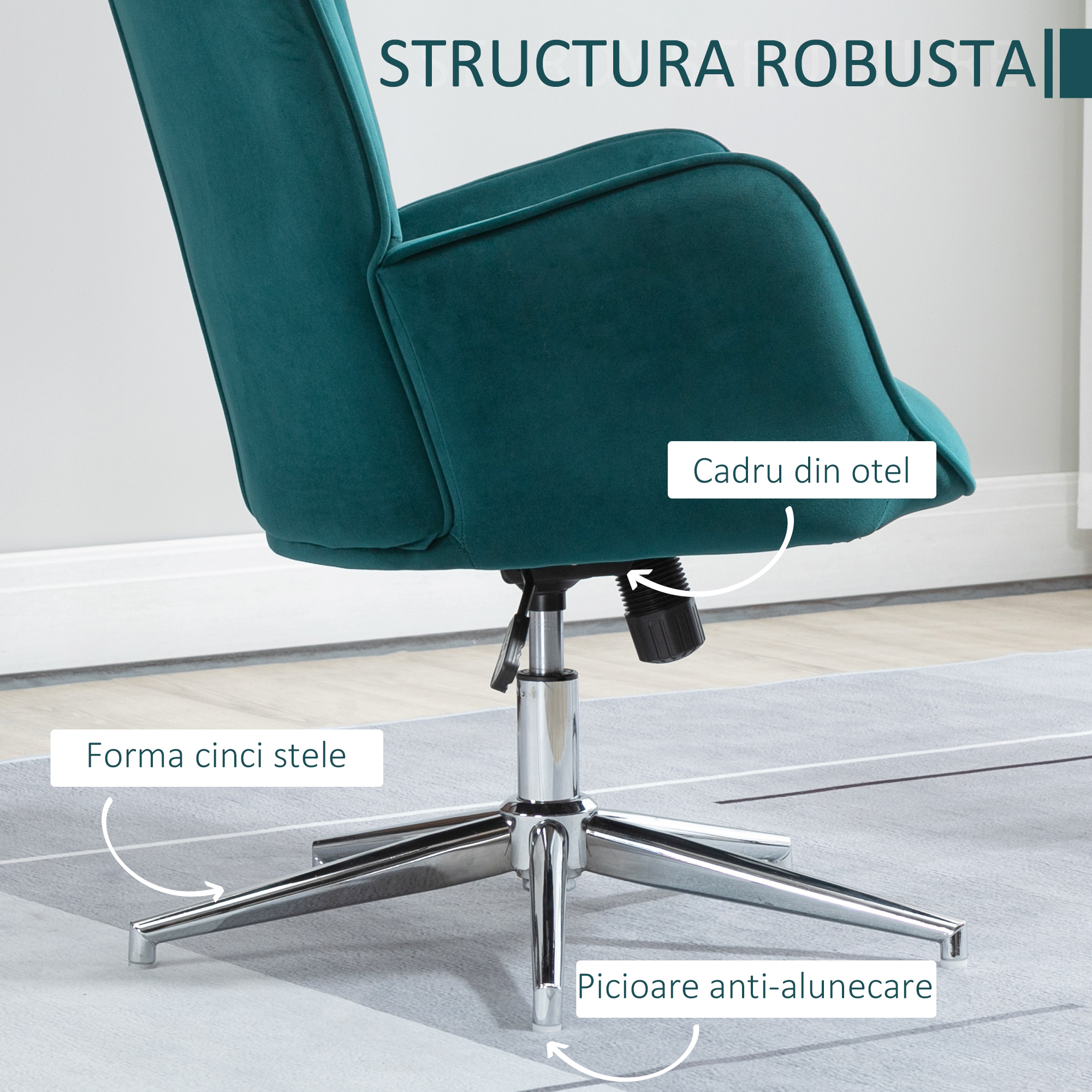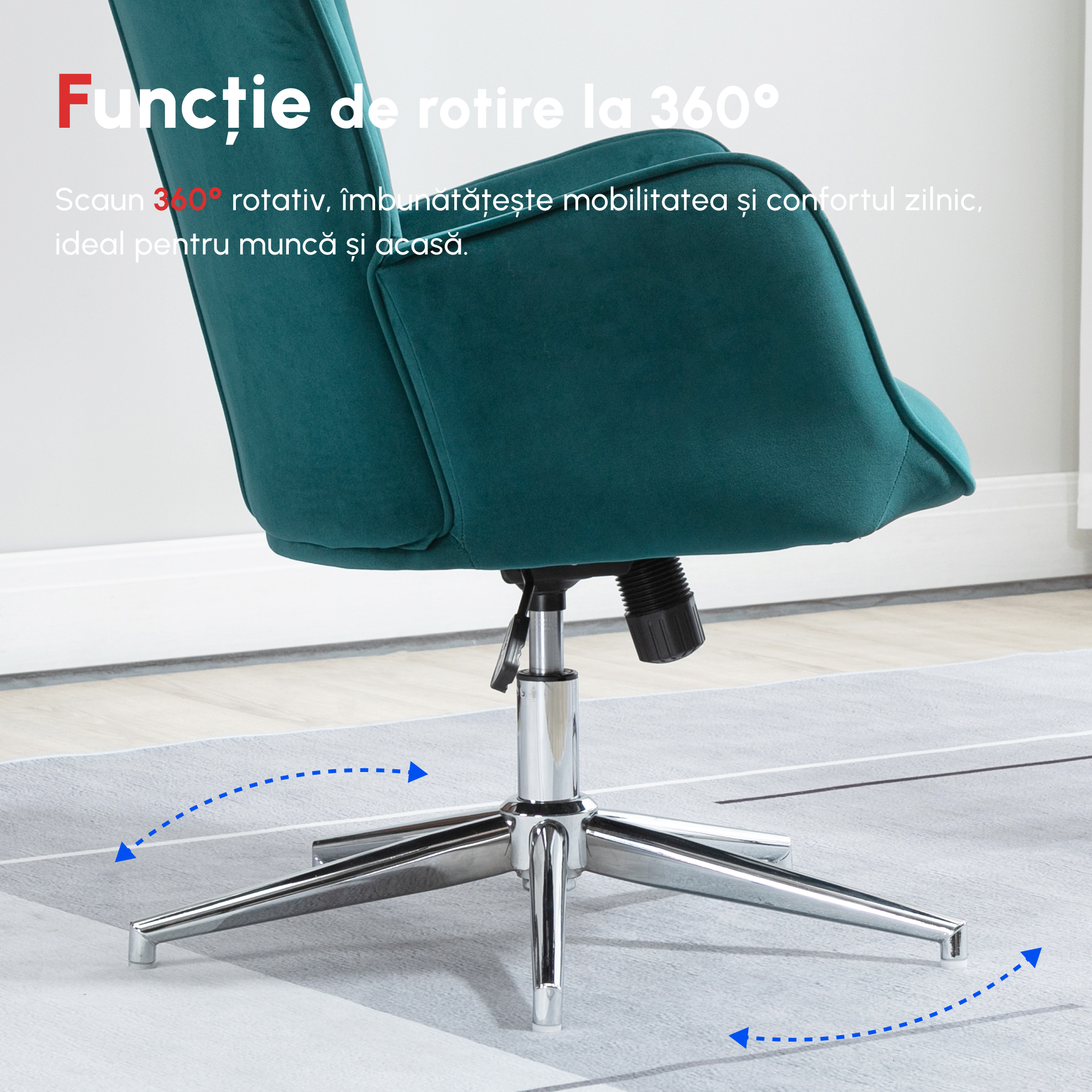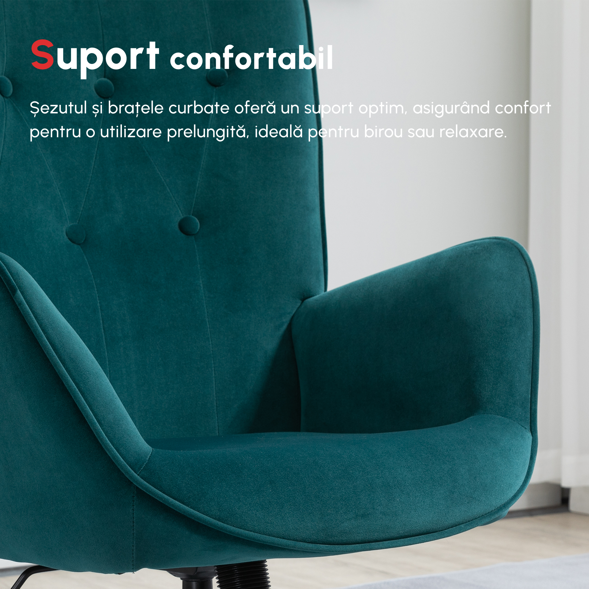 Inunda-te in confortul scaunului nostru de birou [BRAND NAME]. Are un design elegant, cu o captuseala cu efect de catifea de culoare atractiva. Baza cu 5 brate asigura stabilitate si siguranta in utilizare, in timp ce inaltimea reglabila iti permite sa o reglezi la nivelul care se potriveste cel mai bine nevoilor tale. Perfect pentru orice spatiu, pentru serviciu sau pentru un moment de pauza, fotoliul nostru nu poate lipsi din casa ta!