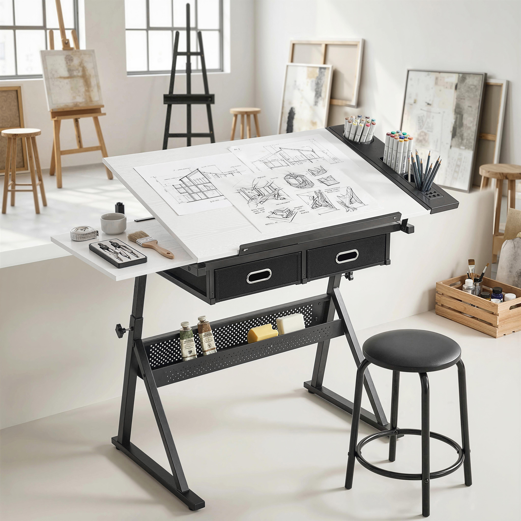 Transforma-ti spatiul cu aceasta masa de desen [BRAND NAME] inclinabila si reglabila pe inaltime. Oferind 16 niveluri de inclinare, spatii de depozitare practice - suport pentru pensule, locasuri pentru creioane, sertare spatioase si masa laterala - pastreaza uneltele organizate. Ideala pentru artisti si multitasking, combina stilul cu functionalitatea pentru studio sau birou.