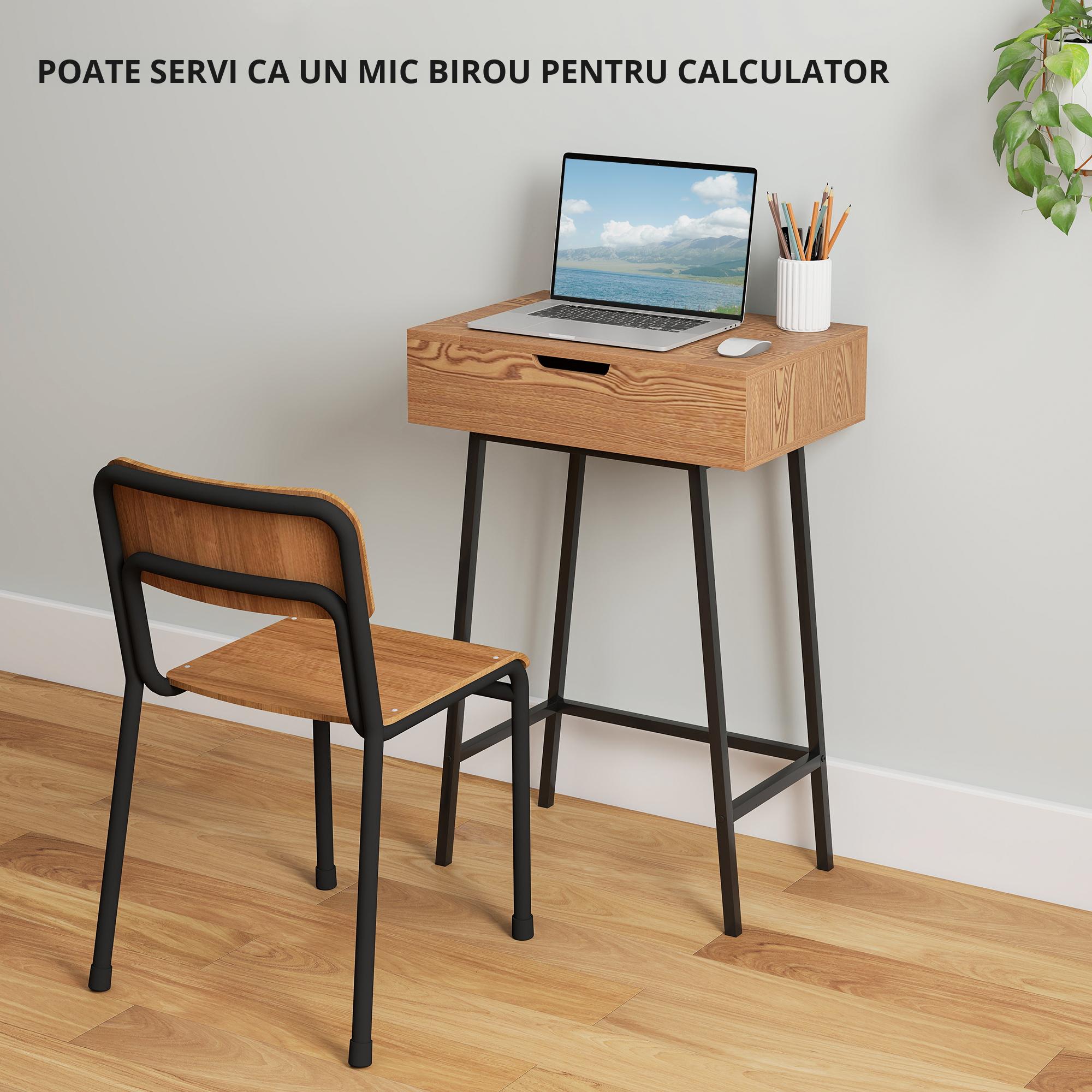 Transforma-ti rutina zilnica cu masa de toaleta [BRAND NAME], echipata cu o oglinda HD rabatabila care se converteste intr-un birou compact. Descopera 16 compartimente secrete sub oglinda pentru a-ti organiza cosmeticale si accesoriile, garantand dimineti organizate. Designul industrial cu finisaje din lemn natural si picioare negre sofisticate, completeaza armonios decorul locuintei, adaugand stil si utilitate.