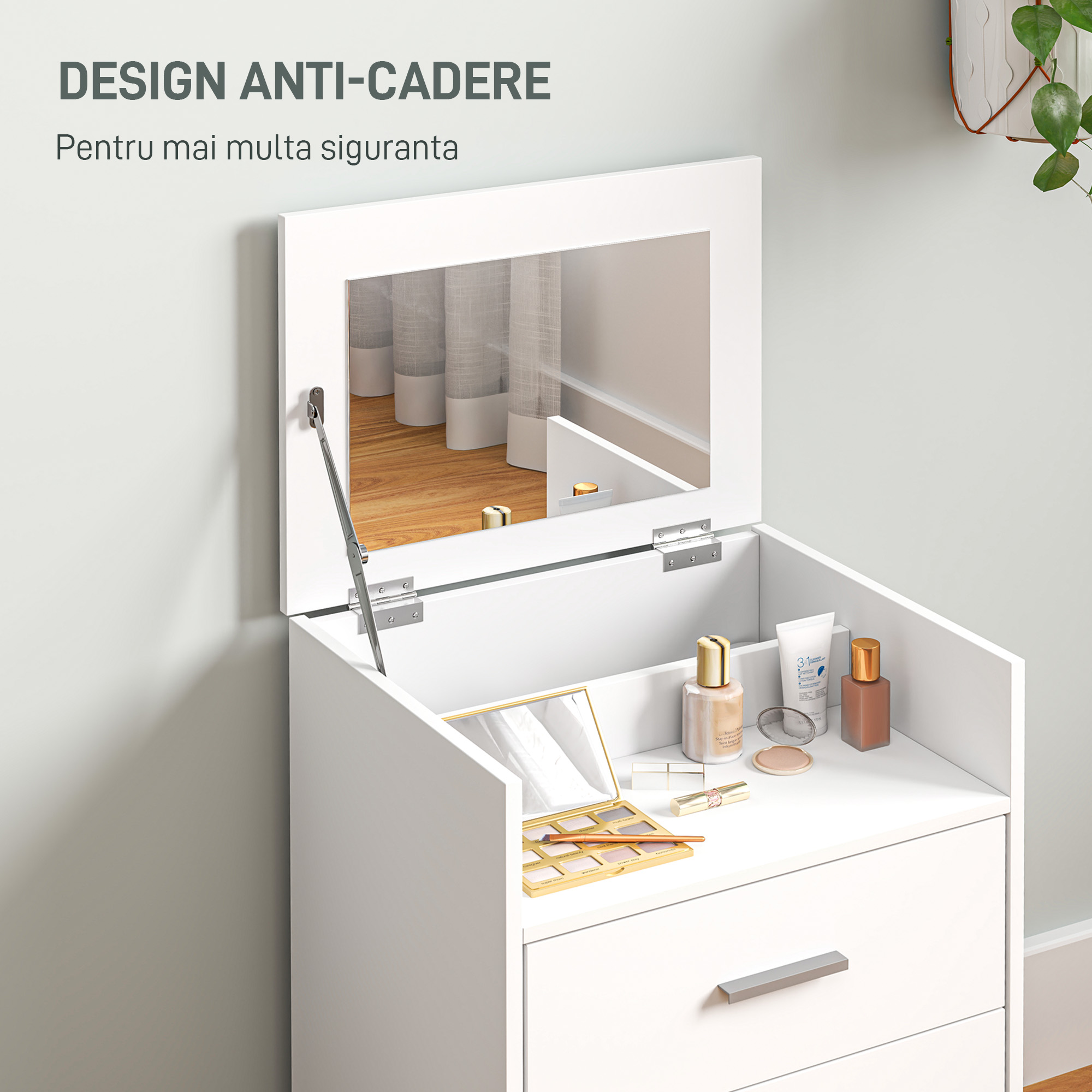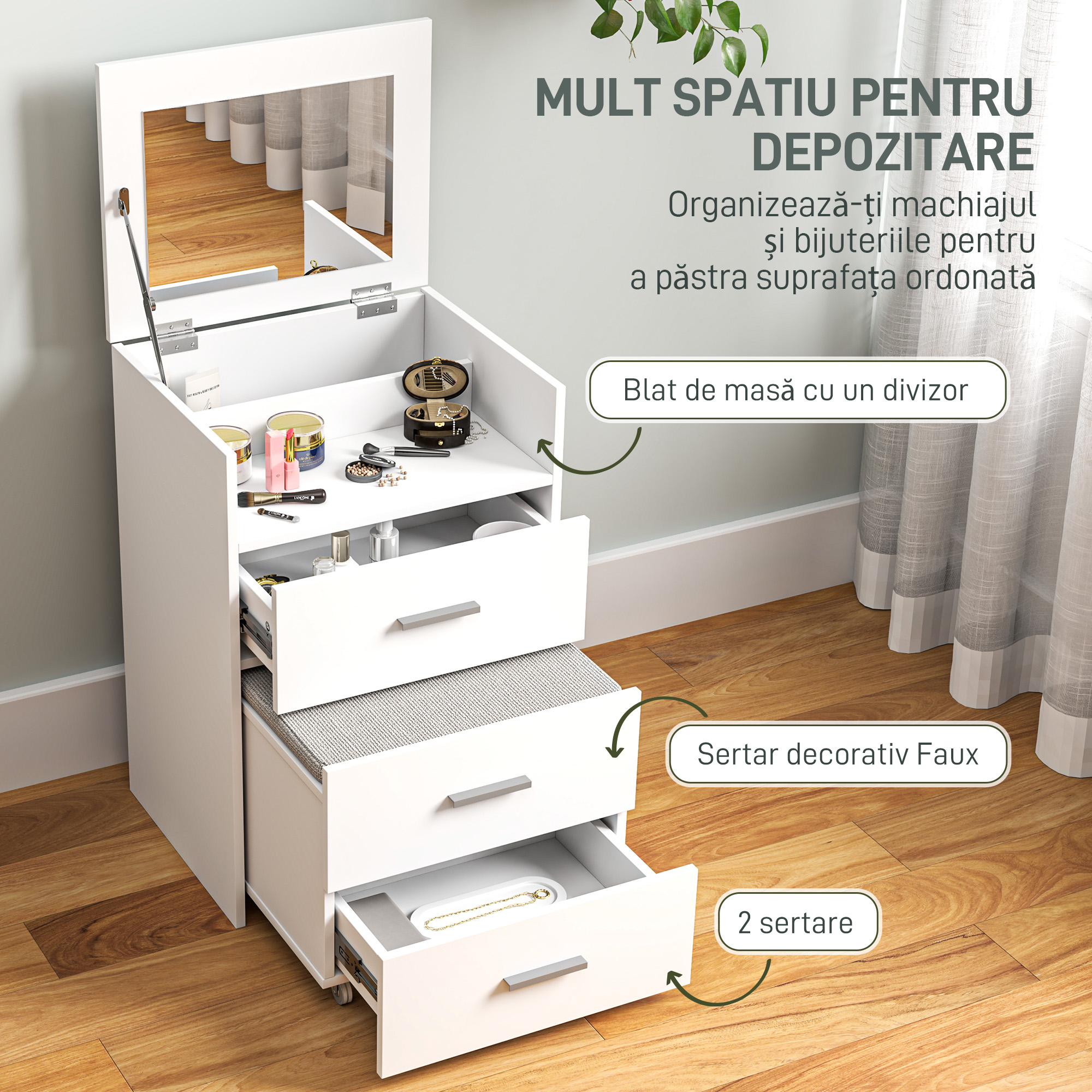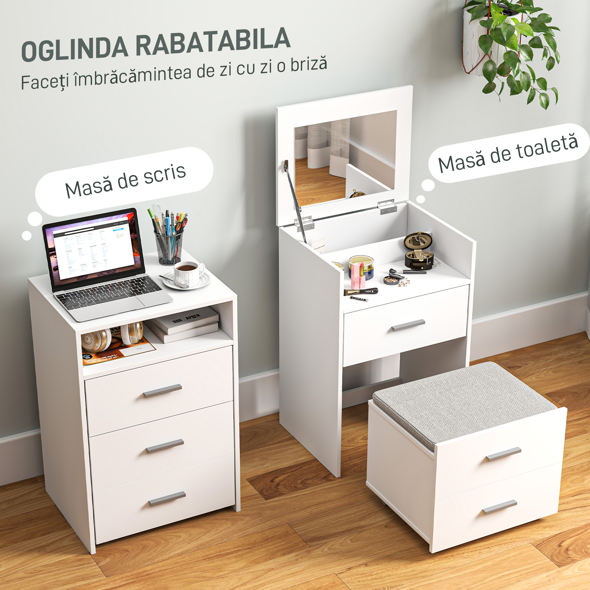 Masa de toaleta [BRAND NAME] este conceputa pentru organizarea produselor de machiaj. Dispune de oglinda rabatabila si taburet cu perna detasabila si lavabila. Designul compact este ideal pentru dormitoare mici. Blatul ofera spatiu pentru accesorii. Structura stabila asigura utilizare zilnica sigura. Culoarea alba adauga un aspect elegant. O piesa practica pentru rutina zilnica de ingrijire.