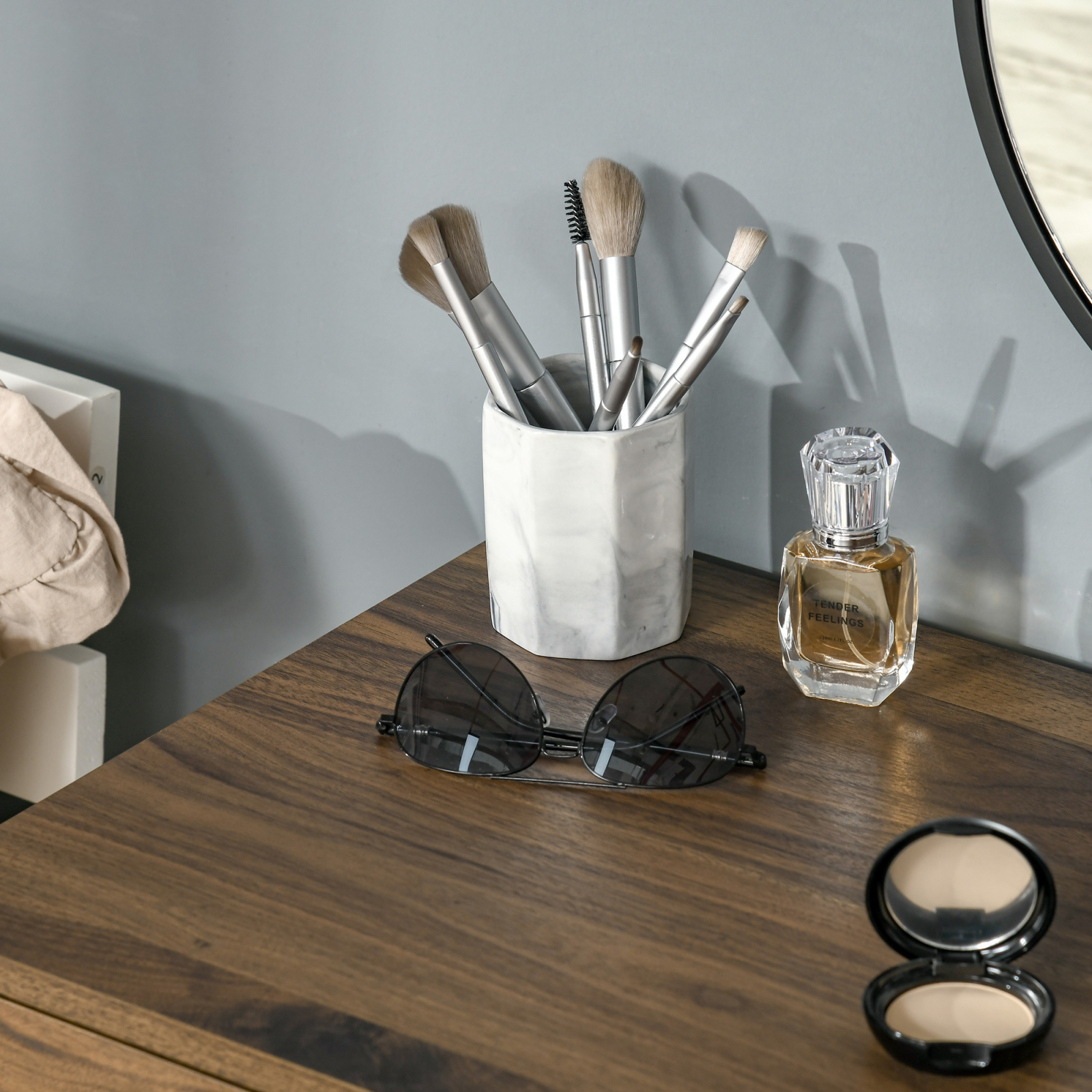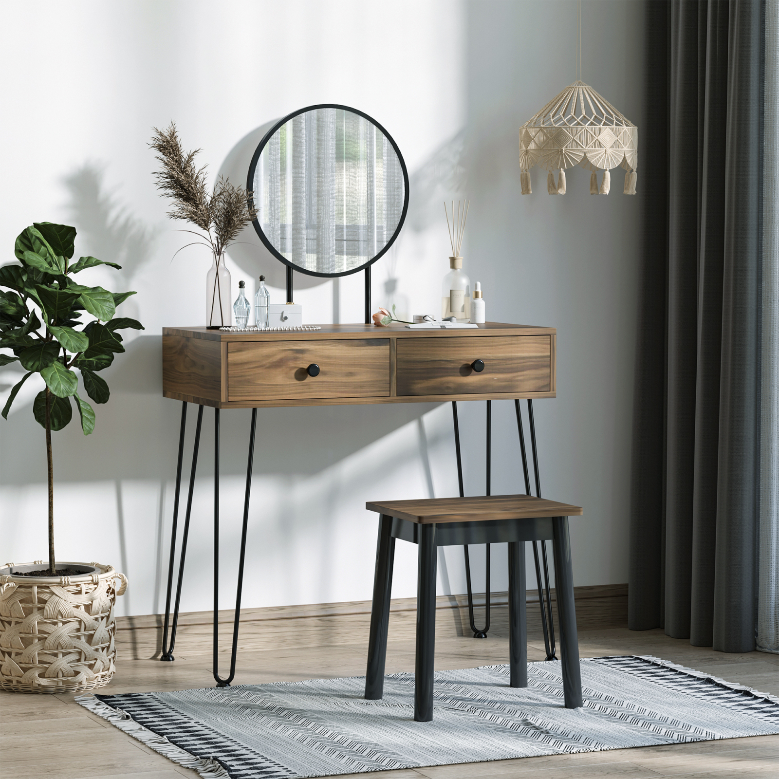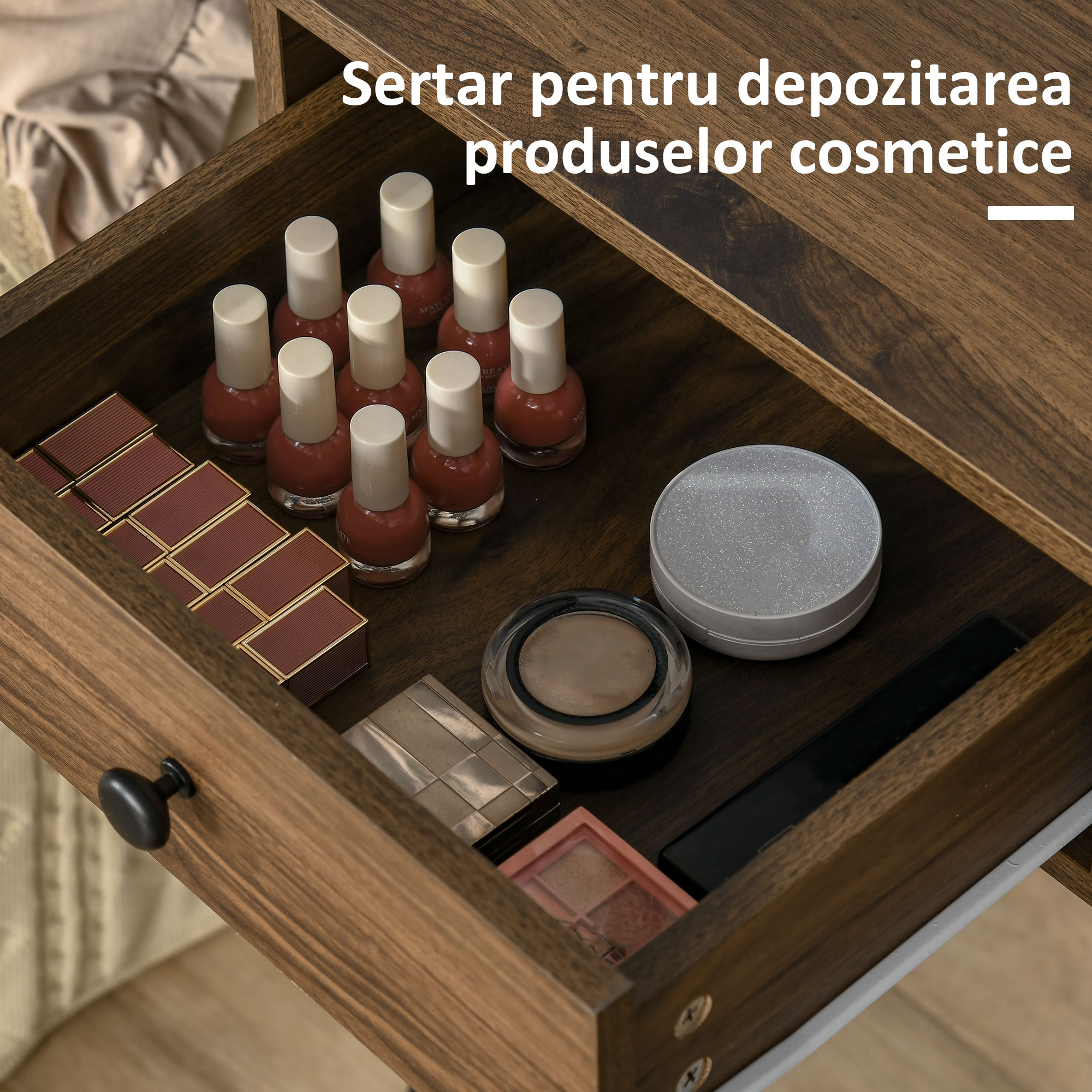 Oferiti-va moment de agaz si aveti grija de corpul dvs.cu aceasta masa de machiaj de la [BRAND NAME]. Eleganta si rafinata, este inspirata din designul industrial datorita fuziunii picioarelor metalice si blatului din lemn. Masuta de toaleta este dotata cu 2 sertare mari, si este insotita de o oglinda si un taburet confortabil asortat: indispensabile pentru completarea setului.