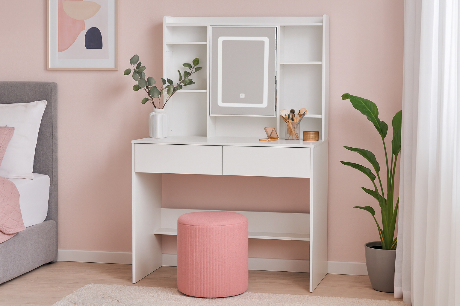 Masuta cosmetica este ideala pentru machiaj si ingrijire, oferind un spatiu bine organizat si iluminare LED reglabila. Oglinda rabatabila permite acces la compartimentul interior pentru bijuterii, iar rafturile si sertarele asigura depozitare eficienta. Designul modern si materialul MDF ofera eleganta si functionalitate in dormitor sau dressing.