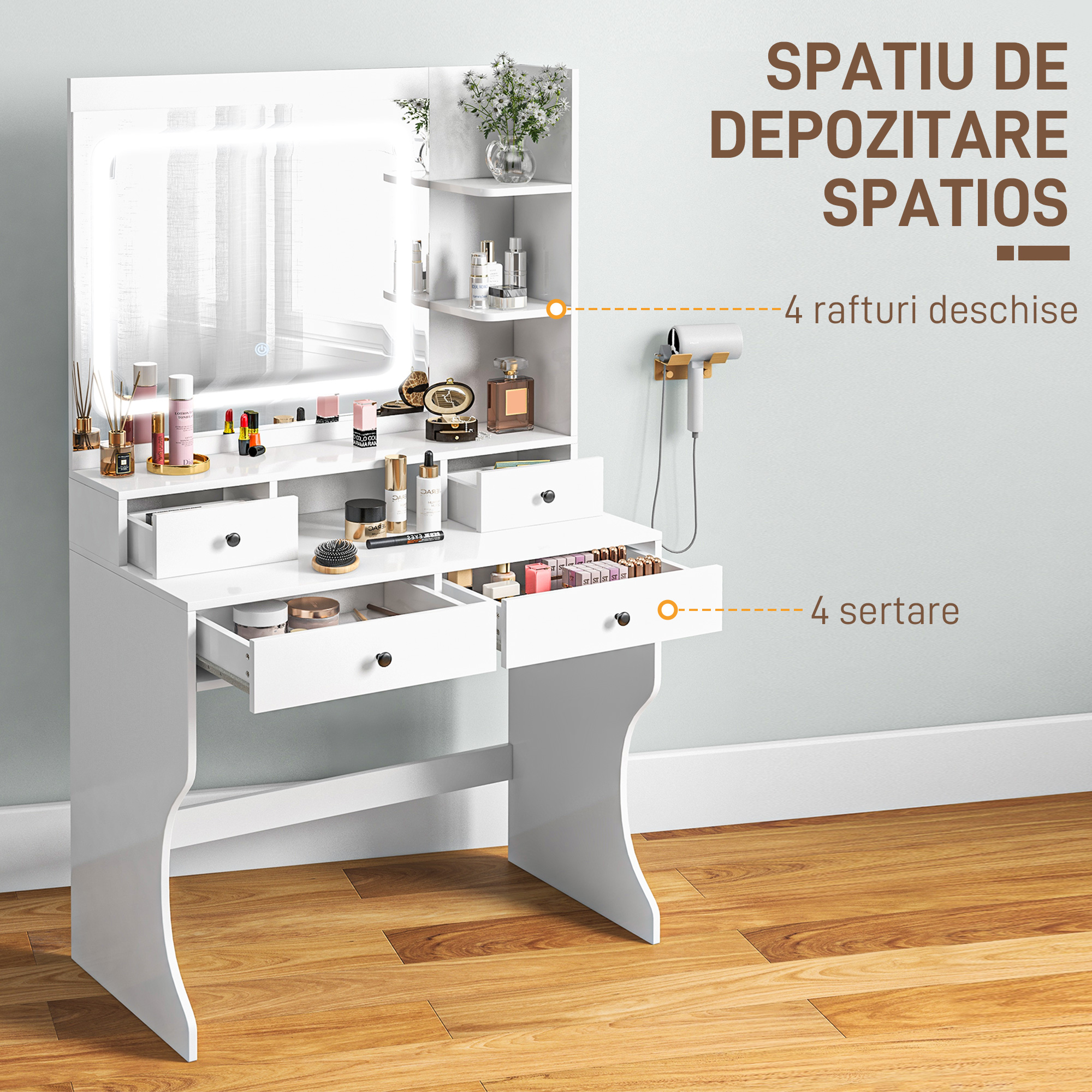 - OPtIUNI DE DEPOZITARE SPAtIOASa: Acest birou de toaleta are patru sertare si patru rafturi deschise, oferind mult spatiu pentru organizarea machiajului, bijuteriilor si accesoriilor.