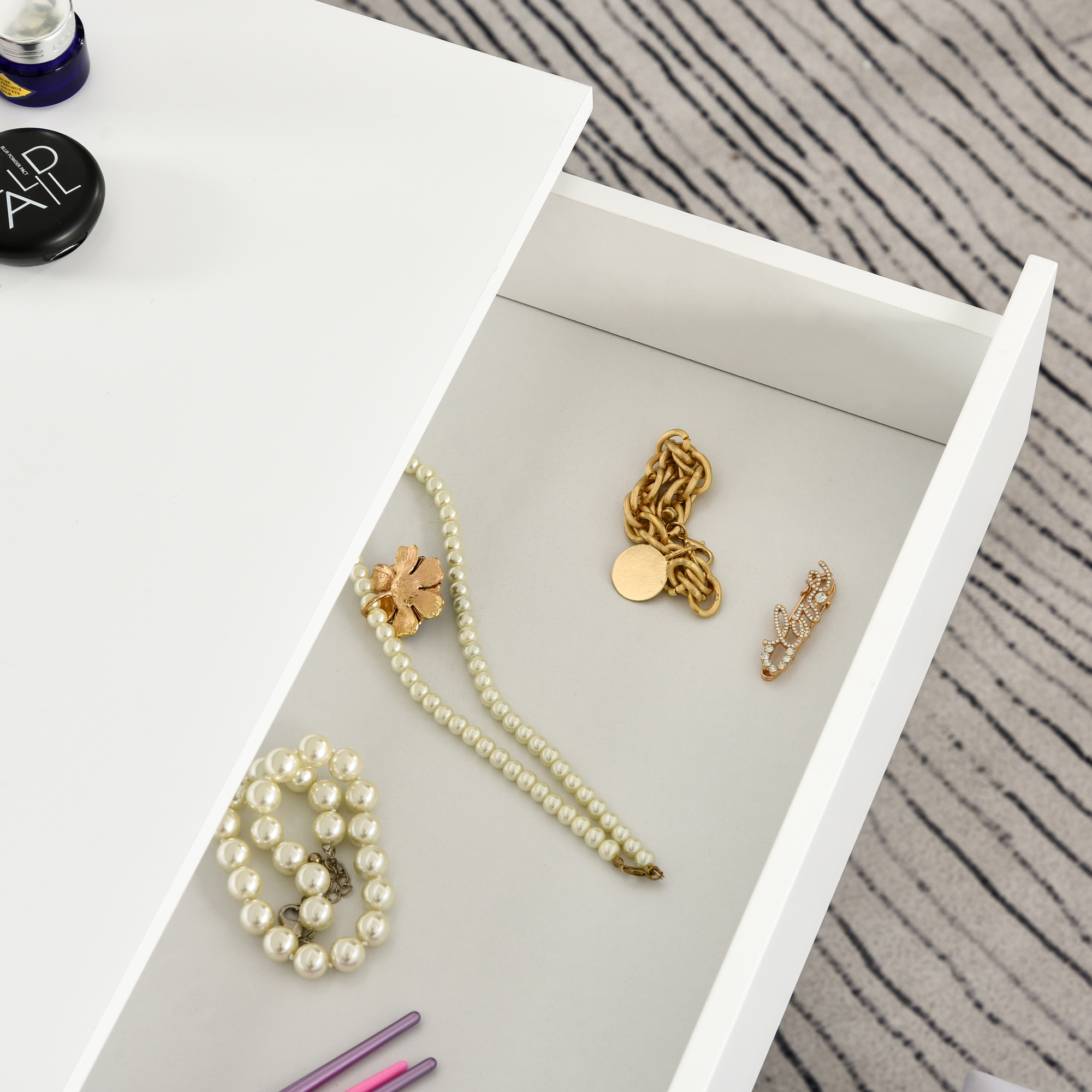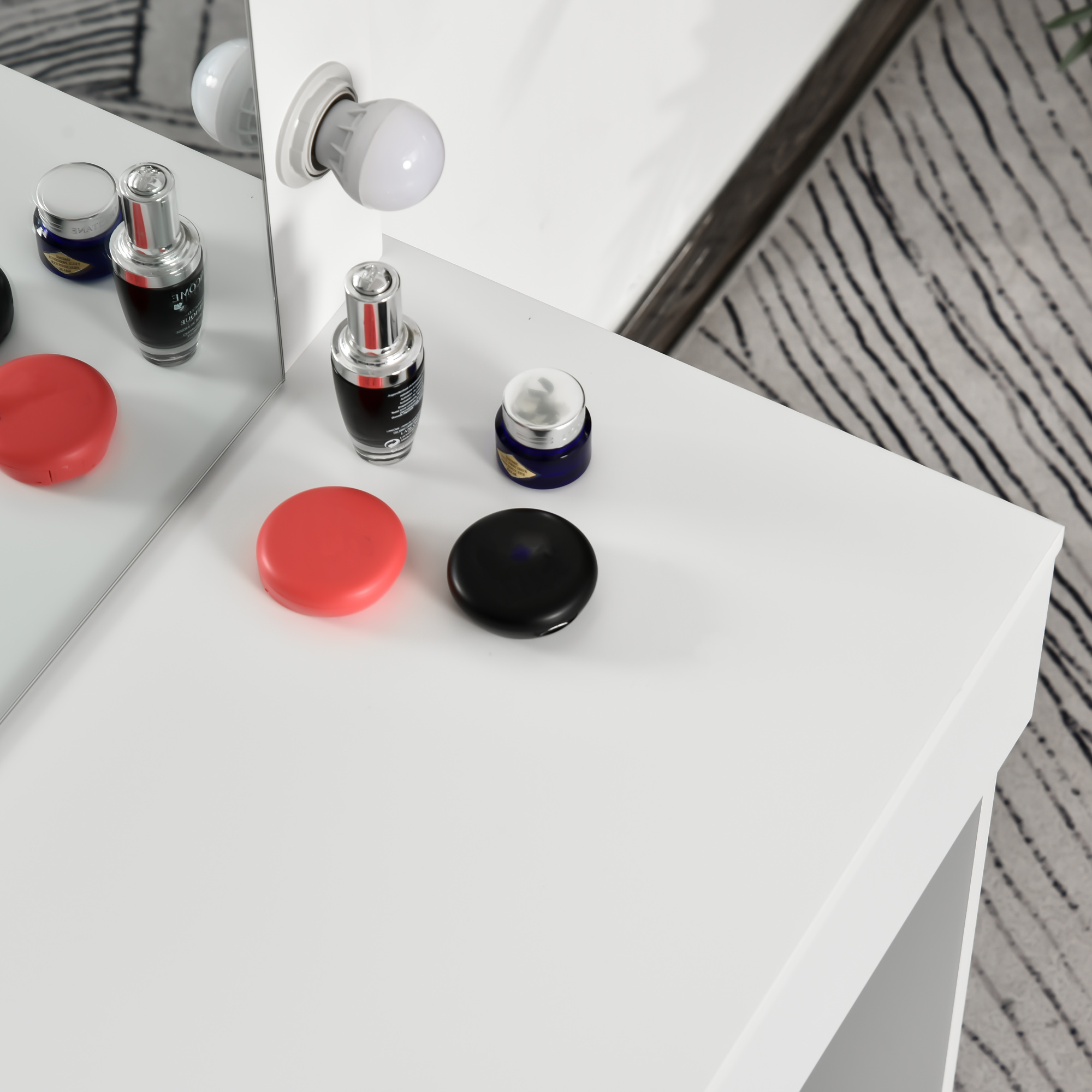 Transforma-ti rutina de beauty intr-un moment de rasfat cu masa de machiaj [BRAND NAME]. Dotata cu o oglinda mare iluminata cu 12 becuri LED, acest set elegant iti ofera iluminare ideala pentru machiaj, coafat sau ingrijire. Sertarul generos iti pastreaza la indemana toate cosmeticele, iar scaunul tapitat asigura confort in timpul utilizarii. Designul sau alb, minimalist, se potriveste perfect in dormitoare moderne, dressinguri sau studiouri de frumusete. Este alegerea ideala pentru orice pasionata de beauty.