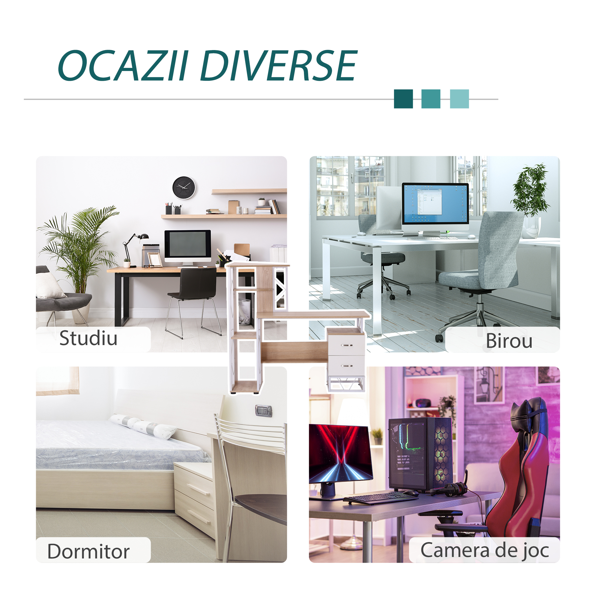 Creati un spatiu de lucru practic si coordonat! Datorita designului simplu si modern se adapteaza oricarui decor de casa. Biroul mare ofera spatiu pentru computere, monitoare si multe altele. Ideal pentru casa si birou!