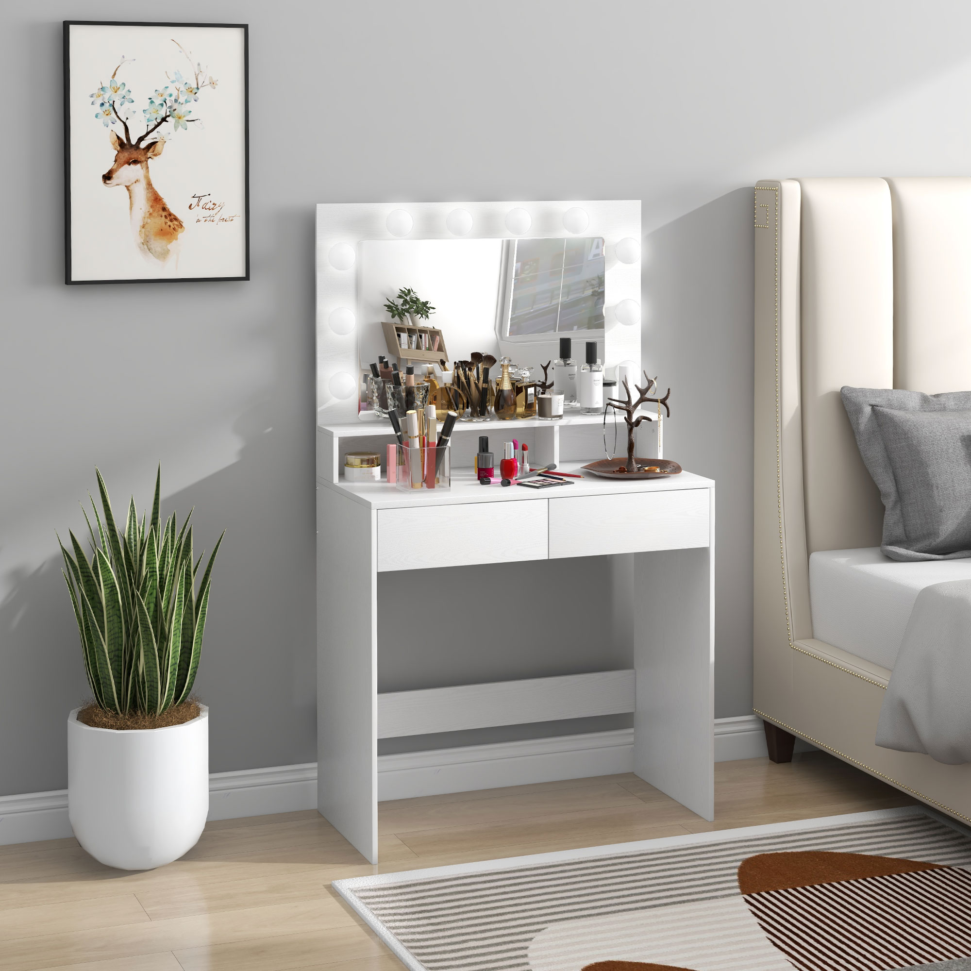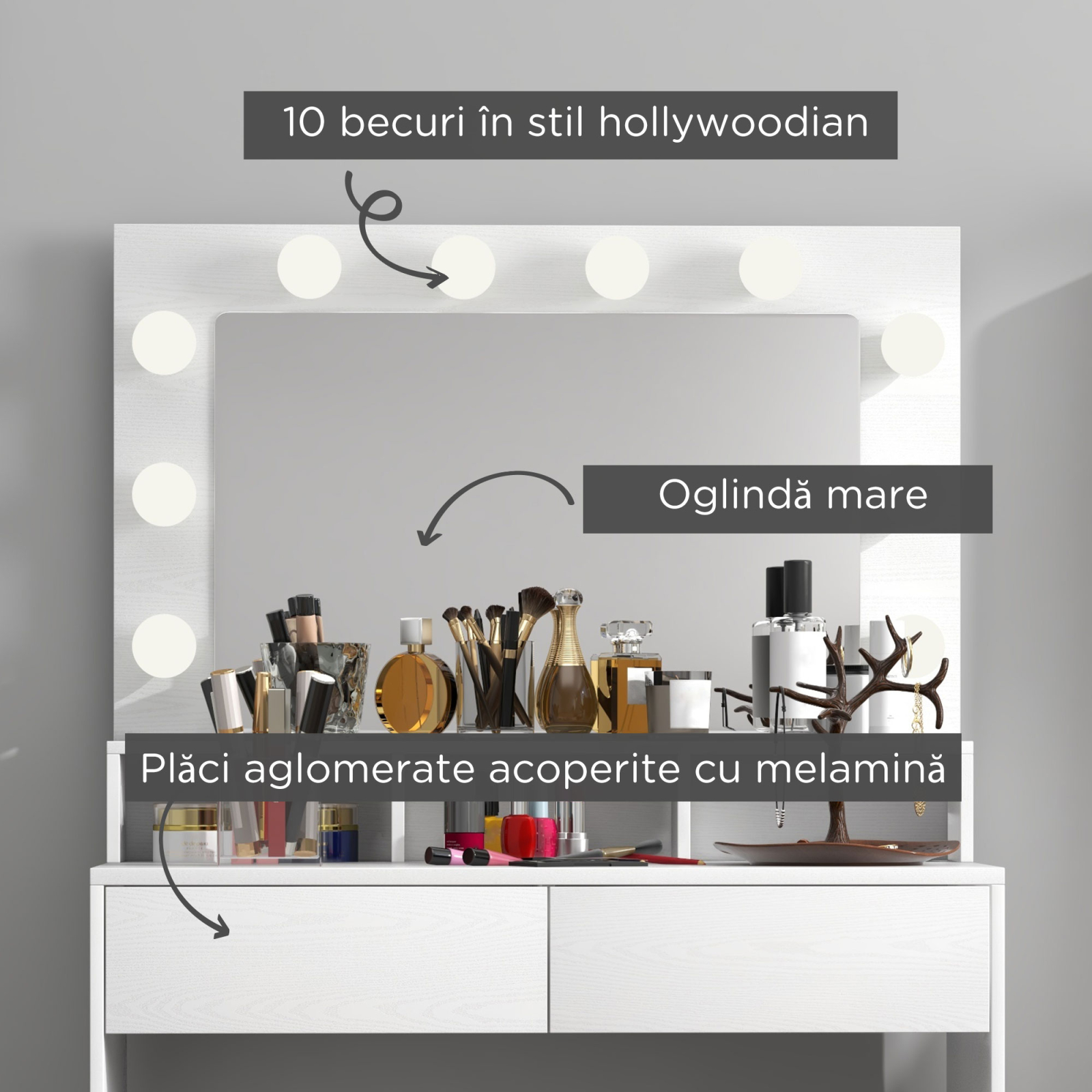Revigoreaza-ti ritualul de frumusete cu masa de machiaj [BRAND NAME] cu oglinda! Cu o oglinda mare si 10 becuri in stil Hollywood, aceasta toaleta ofera lumina reglabila in trei moduri, ideala pentru fiecare nevoie. Masa de machiaj are o suprafata generoasa, doua sertare glisante si trei compartimente, intr-un stil nordic rafinat care imbogateste orice spatiu.