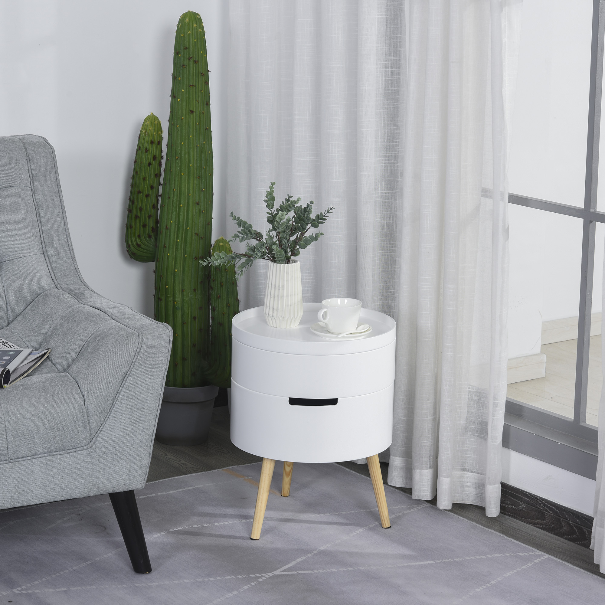 Daca doriti sa va completati designul din locuinta dumneavoastra cu un obiect care atrage atentia va recomandam [BRAND NAME] masuta de cafea rotunda, Φ38 x 48,3cm, lemn, alb. Este versatila si poate fi asamblata in orice spatiu precum living, camera de zi, dormitor, sali de asteptare, balcon sau birou. Partea de sus si de jos a mesei sunt detasabile, deci o puteti face de dimensiuni diferite, in functie de preferinte si nevoi. Ideala pentru a putea fi utilizata ca masuta de cafea sau noptiera. [BRAND NAME] masuta de cafea rotunda, Φ38 x 48,3cm, lemn, alb este realizata din panouri MDF si picioare din lemn de pin pentru o stabilitate si durabilitate indelungata. Este vopsita cu vopsea rezistenta la apa, la uzura, nu se decoloreaza. Masa are o capacitate de greutate de pana la 15 kg. Are un design elegant, modern ce se adapteaza oricarui decor. Picioarele antiderapante impiedica zgarierea podelei.