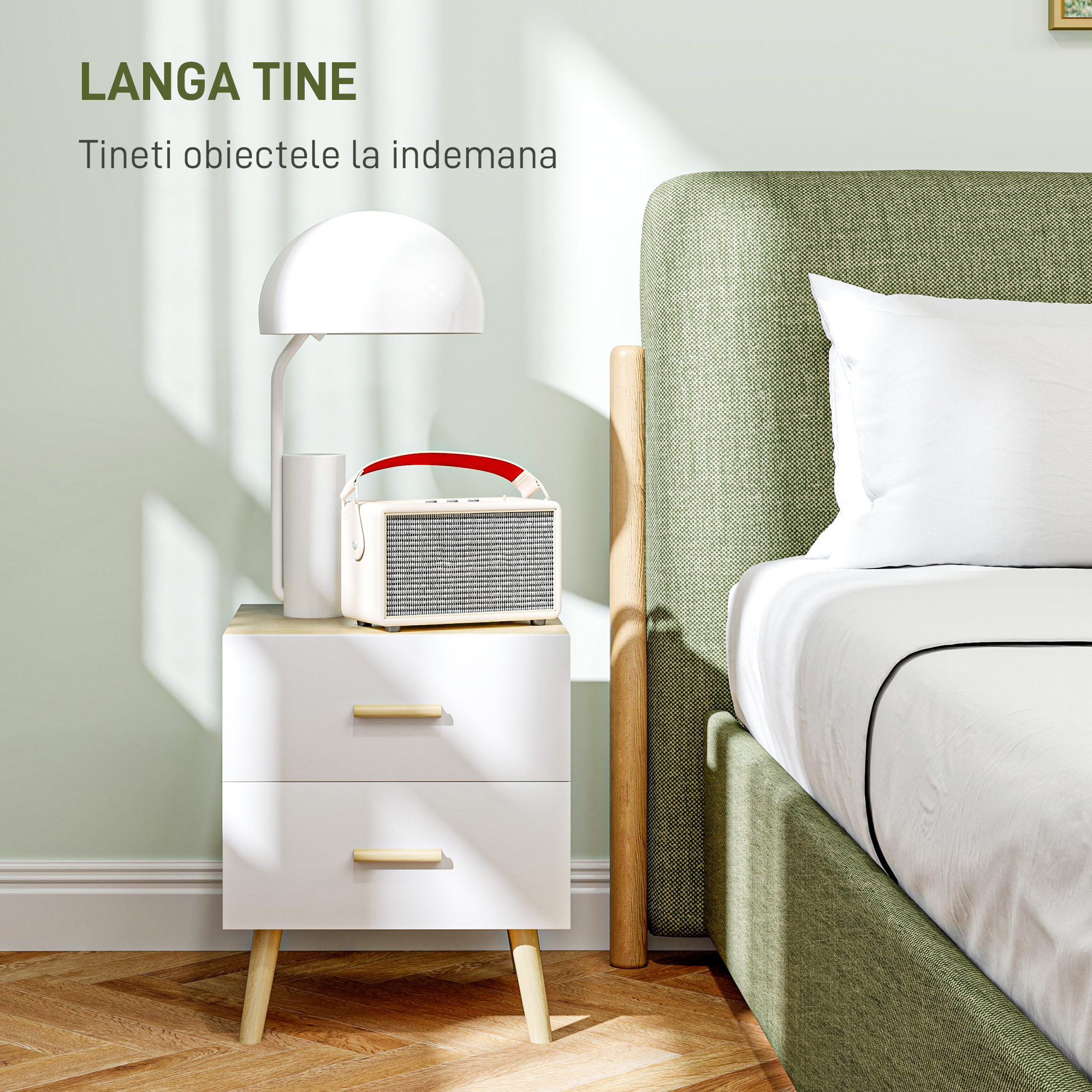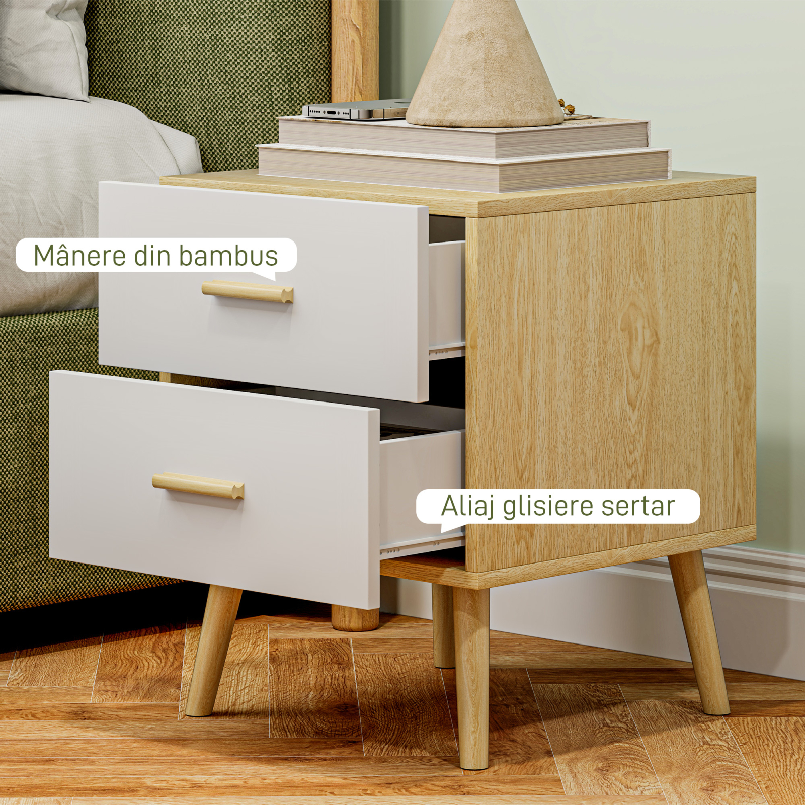Descopera eleganta functionala a noptierei moderne [BRAND NAME]. Cu doua sertare spatioase pentru organizarea obiectelor mici, aceasta noptiera din lemn ofera o suprafata superioara larga, perfecta pentru a aseza decoratiuni si carti. Creata cu manere rafinate din bambus si sine solide din aliaj pentru o alunecare lina a sertarelor, este ideala atat ca masuta laterala in sufragerie langa canapea, cat si ca suport pentru telefon.