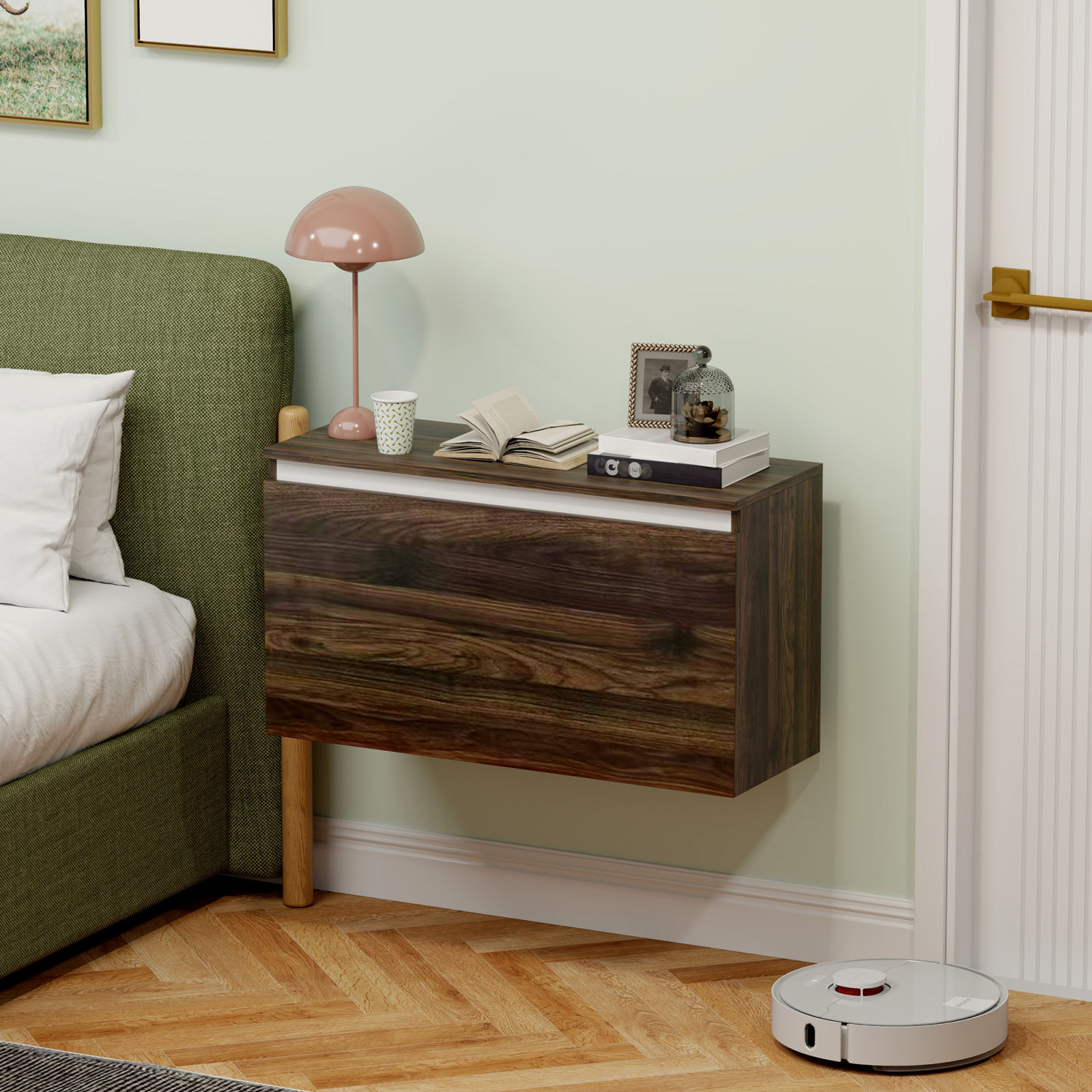 Aceasta noptiera suspendata ofera o solutie practica si estetica pentru spatiile moderne. Se monteaza direct pe perete, eliberand podeaua si oferind un aspect aerisit. Sertarul generos permite organizarea discreta a obiectelor personale, iar blatul poate fi folosit pentru veioze, ceasuri sau decoratiuni. Finisajul maro adauga o nota calda si eleganta in dormitor.