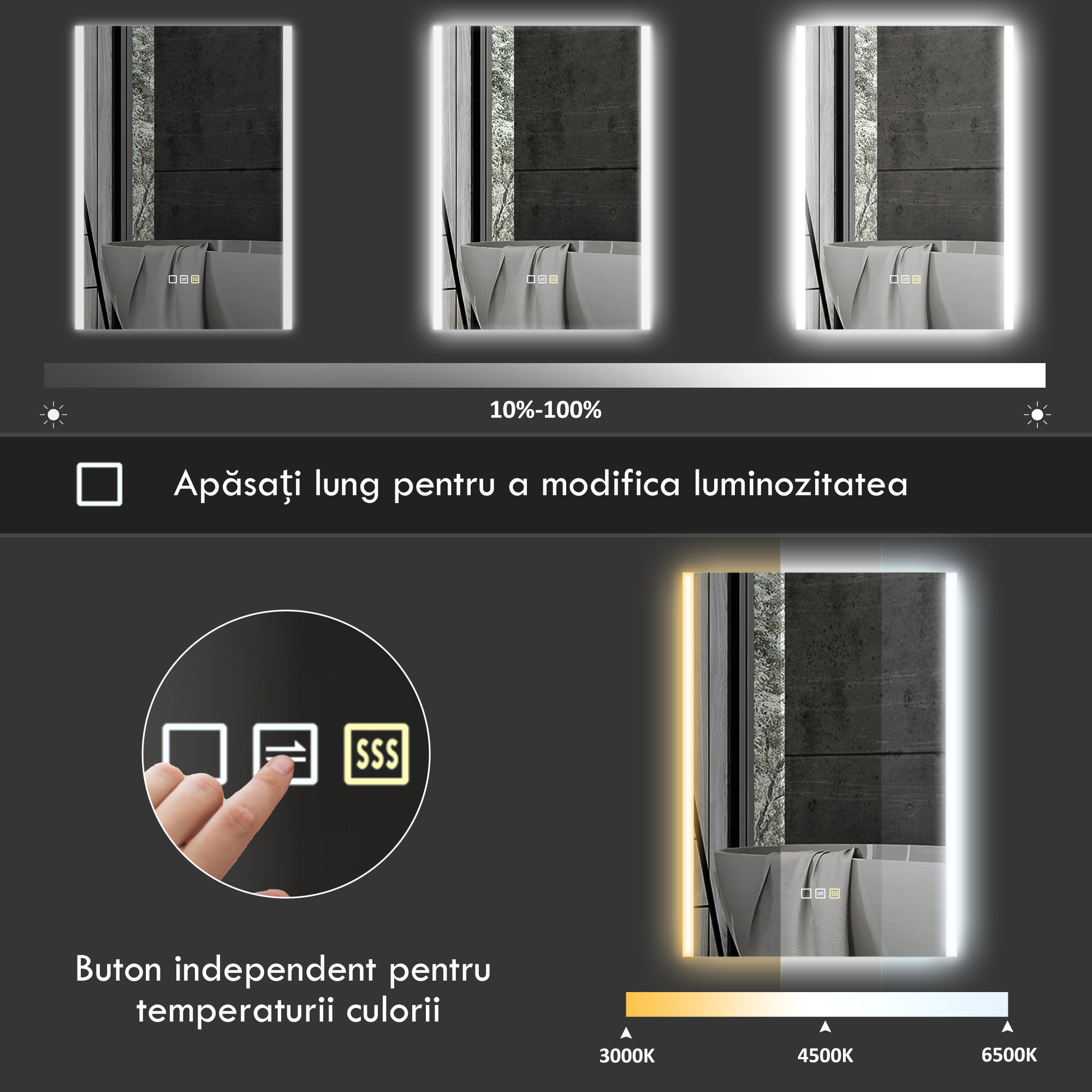 Creeaza atmosfera perfecta cu o simpla atingere! Fie ca preferi o lumina calda pentru relaxare, una stralucitoare pentru a incepe ziua sau una alba pentru a evidentia detaliile, aceasta oglinda de baie cu lumina [BRAND NAME] este un accesoriu practic si elegant. Tehnologia antiaburire ofera o vizibilitate mereu clara, in timp ce controlul tactil inteligent si functia de memorie iti fac rutina zilnica mai confortabila si moderna.