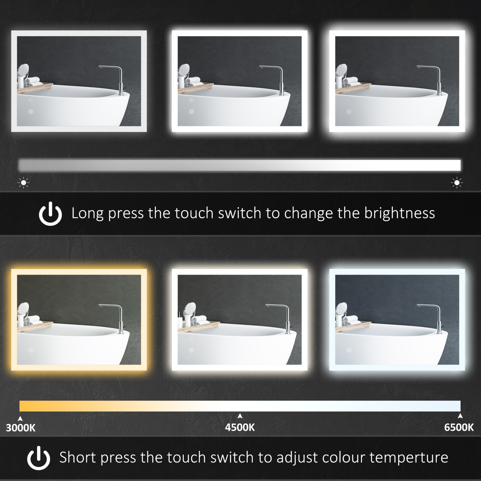 • Lumini LED reglabile: Aceasta oglinda luminata are luminozitate reglabila si 3 culori de lumina, inclusiv Calda (3000K), Naturala (4500K) si Alba (6500K). Trebuie doar sa atingeti comutatorul cu o apasare lunga pentru a schimba luminozitatea si o apasare scurta pentru a regla culoarea luminii.