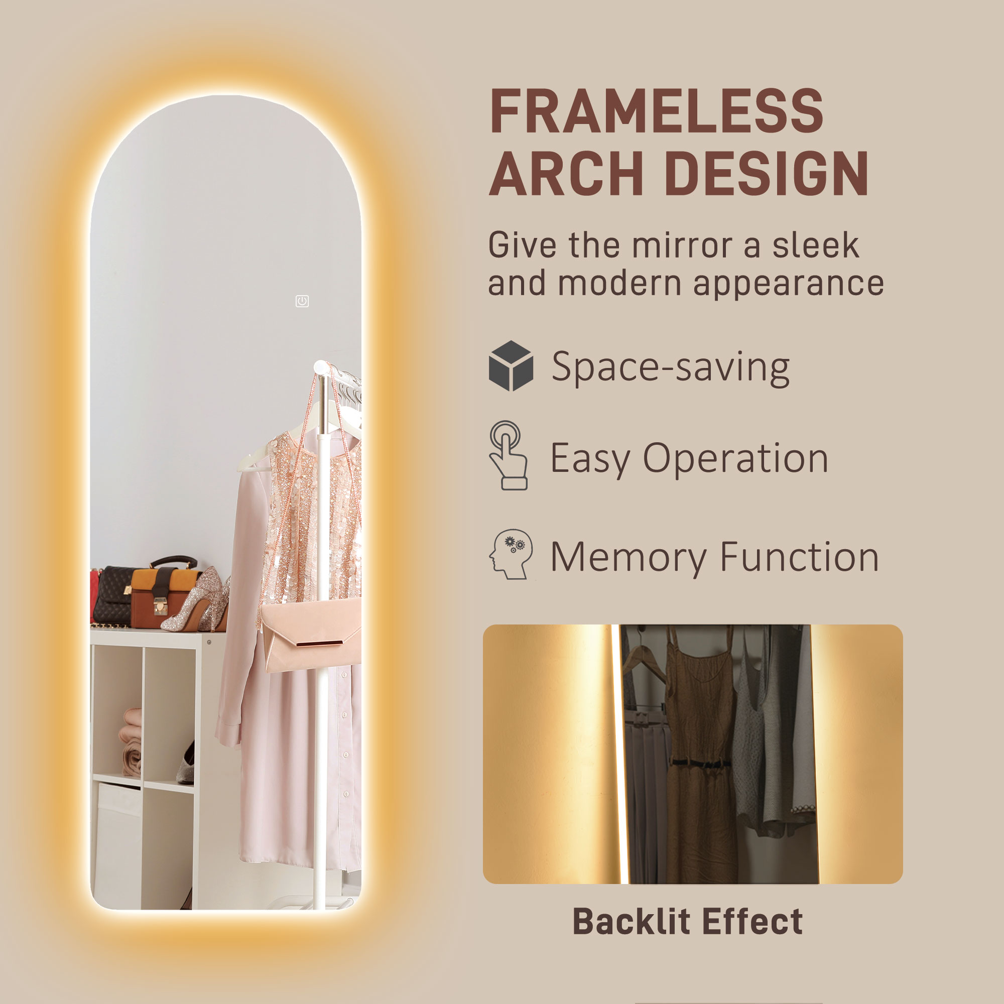 Pregatirea va deveni usoara si rapida la orice ora datorita oglinzii noastre iluminate [BRAND NAME]. Iluminarea LED iti va permite sa te vezi clar, putand alege intre o lumina calda, naturala sau rece cu intensitate reglabila, in timp ce iluminarea din spate creeaza o atmosfera calda si primitoare. Monteaza-l vertical pentru a optimiza spatiul din jur.