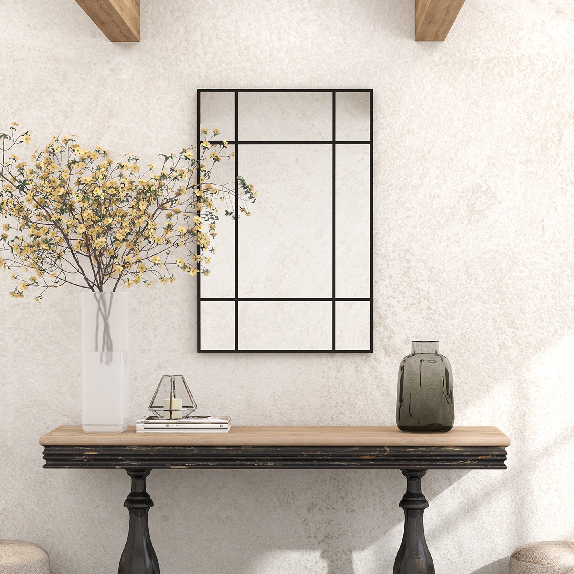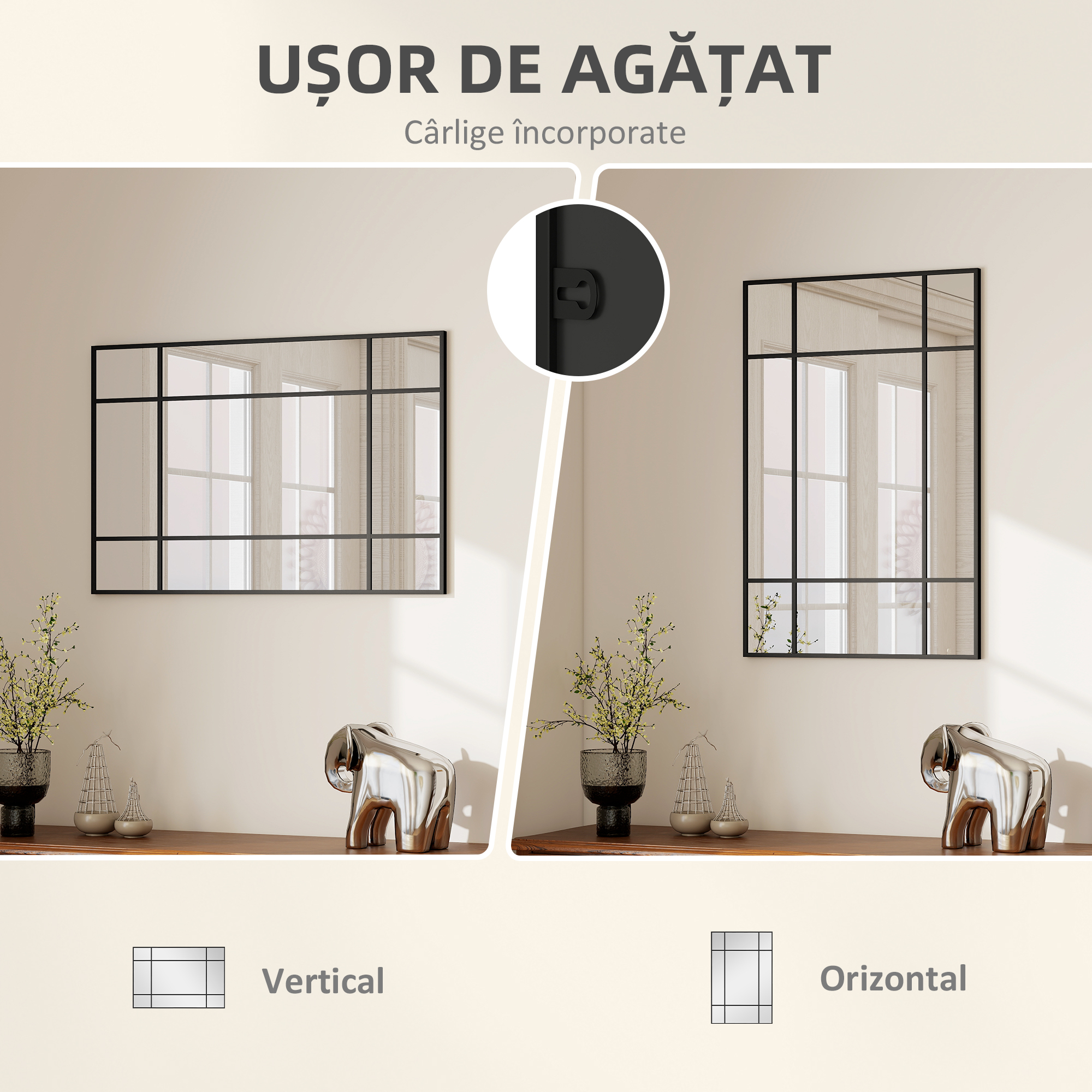 Pune in valoare orice incapere cu oglinda de perete [BRAND NAME], cu un design in stil fereastra. Nu doar ca decoreaza spatiul, ci si il lumineaza si creeaza un efect de marire a spatiului, fiind o adaugare perfecta in orice camera. Cu 4 carlige pe spate, oglinda poate fi agatata vertical sau orizontal, in functie de nevoile tale. Sticla groasa, cu tratament anti-oxidare, face ca aceasta oglinda sa fie o piesa durabila in amenajarea interioara.