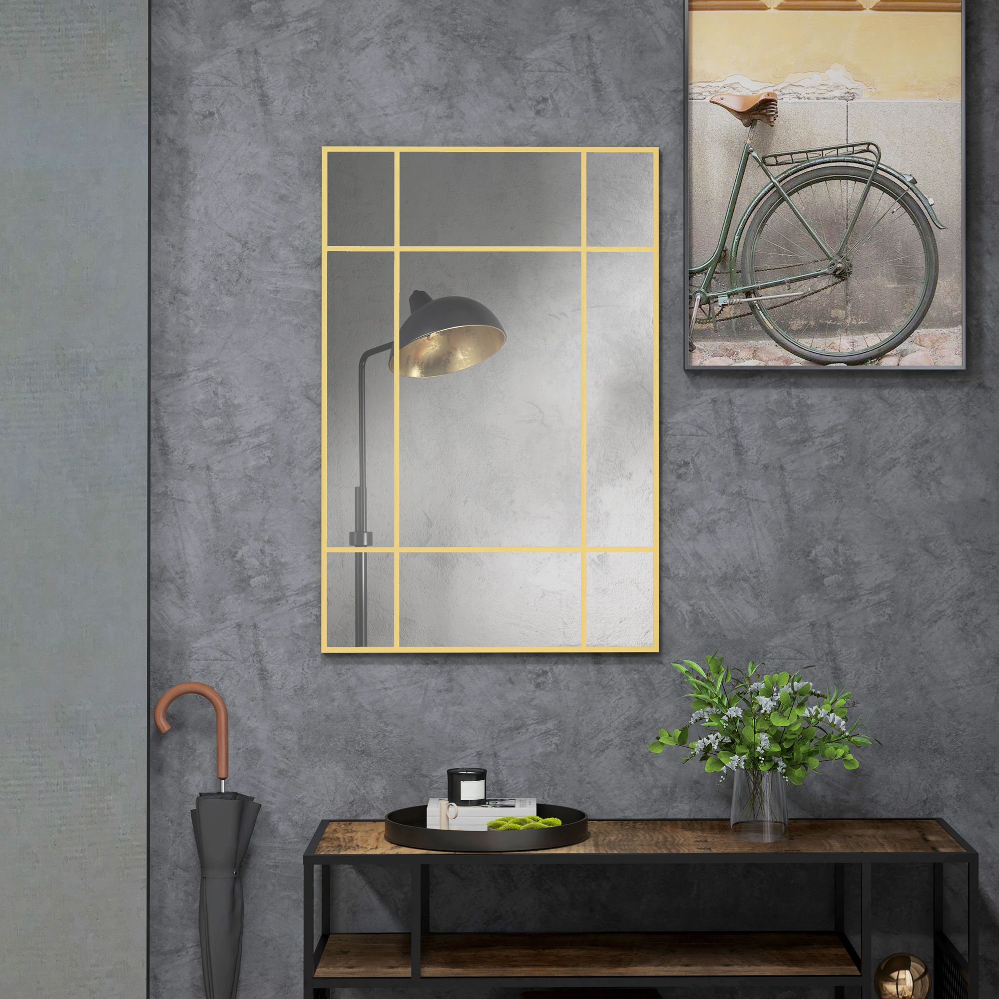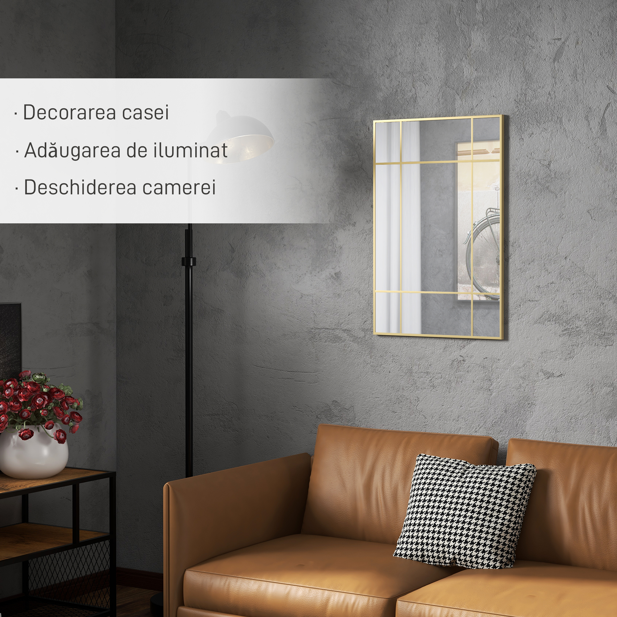 imbunatateste orice incapere cu oglinda de perete [BRAND NAME] cu design stil fereastra. Nu doar ca iti decoreaza spatiul, dar il lumineaza si creeaza un efect de marire a incaperii, fiind o completare perfecta pentru orice camera. Cu 4 carlige pe spate, oglinda poate fi agatata vertical sau orizontal, in functie de preferinte. Sticla groasa cu tratament anti-oxidare face ca aceasta oglinda sa fie o piesa durabila in decorul casei tale.