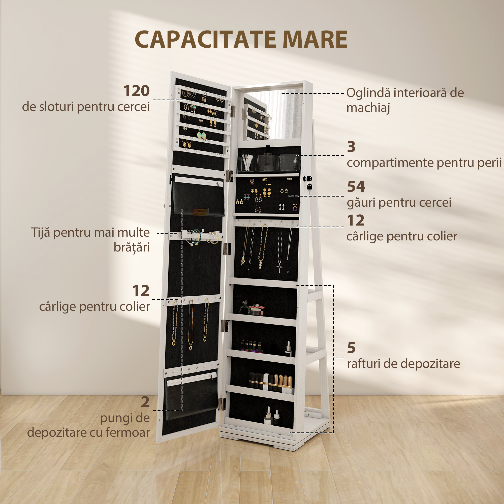 La suprafata pare a fi o simpla masuta de toaleta, dar in realitate contine o comoara pretioasa: a ta! Aceasta oglinda cutie pentru bijuterii [BRAND NAME] este conceputa pentru a pastra bijuteriile si machiajele intotdeauna ordonate. In interior are carlige pentru agatat colierele, fante pentru inele si etajere pe care le poti folosi pentru a aranja alte obiecte mici.
