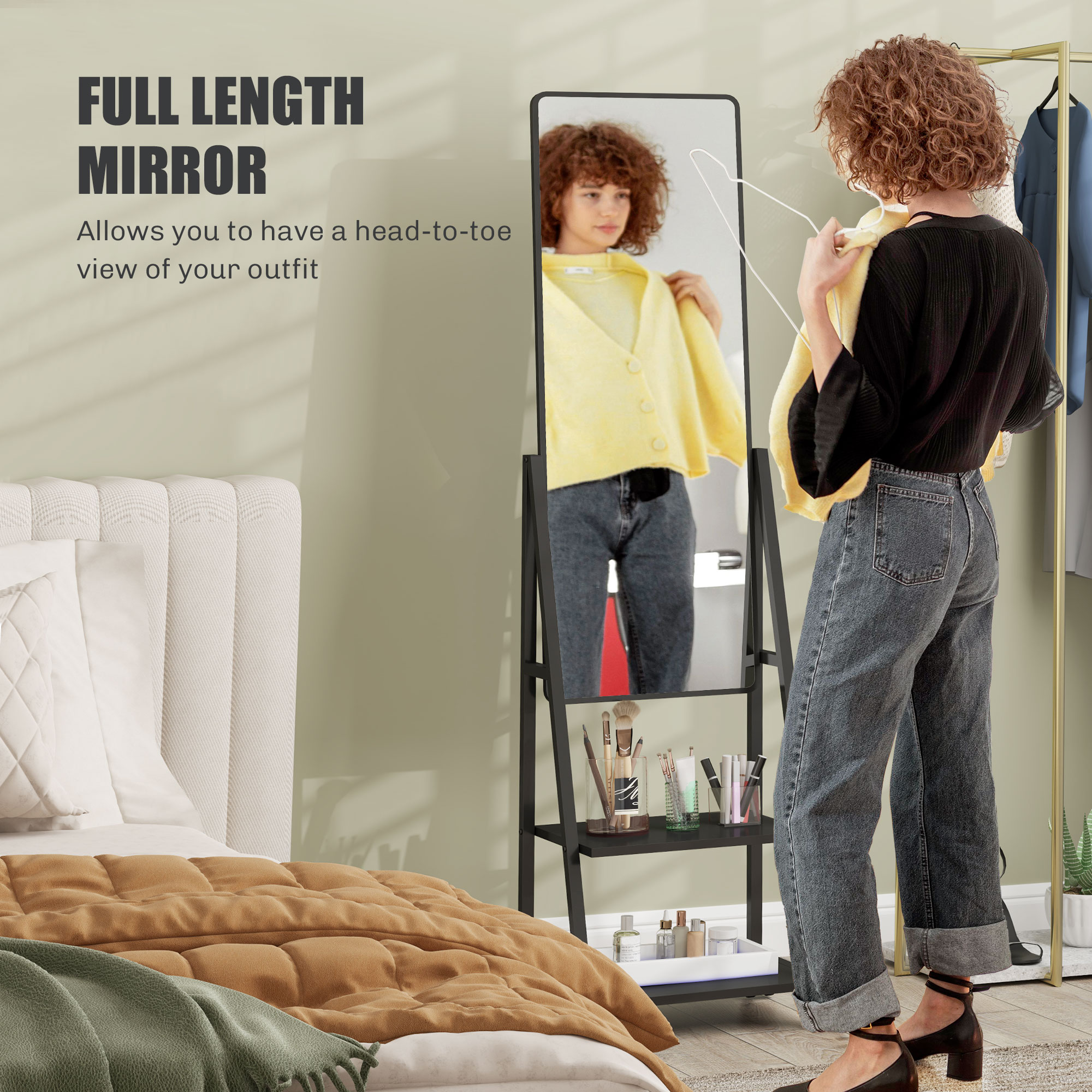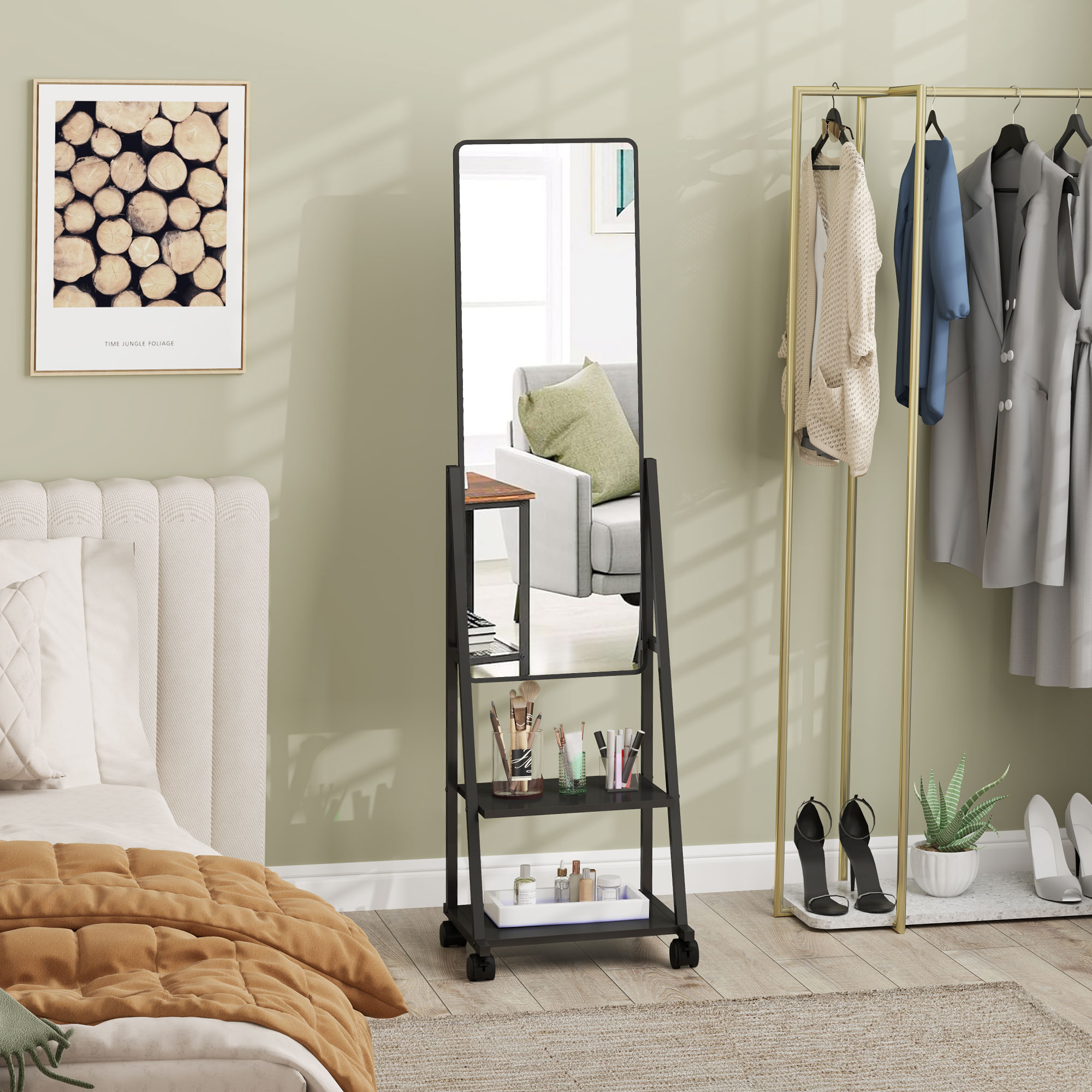 Finiseaza-ti look-ul de la cap la picioare cu oglinda noastra verticala [BRAND NAME]. Pe langa faptul ca iti arata intreaga tinuta, oglinda este prevazuta cu 2 rafturi practice pentru a-ti organiza toate accesoriile. Datorita celor 4 roti si a celor 2 frane incluse, mutarea structurii dintr-o camera in alta va fi o joaca de copii!