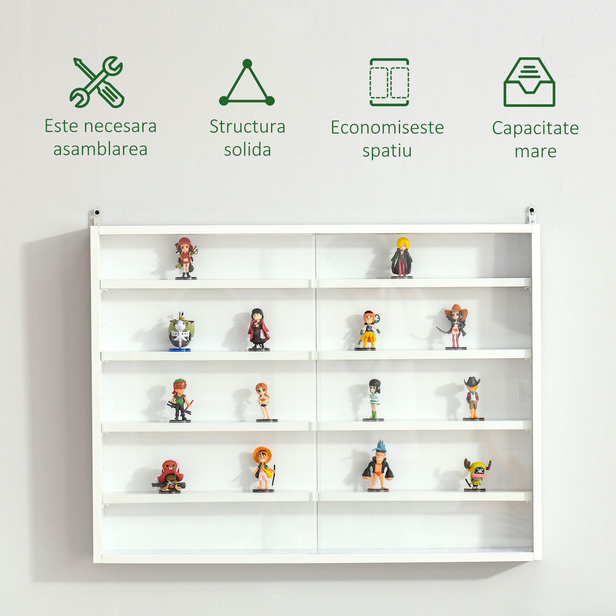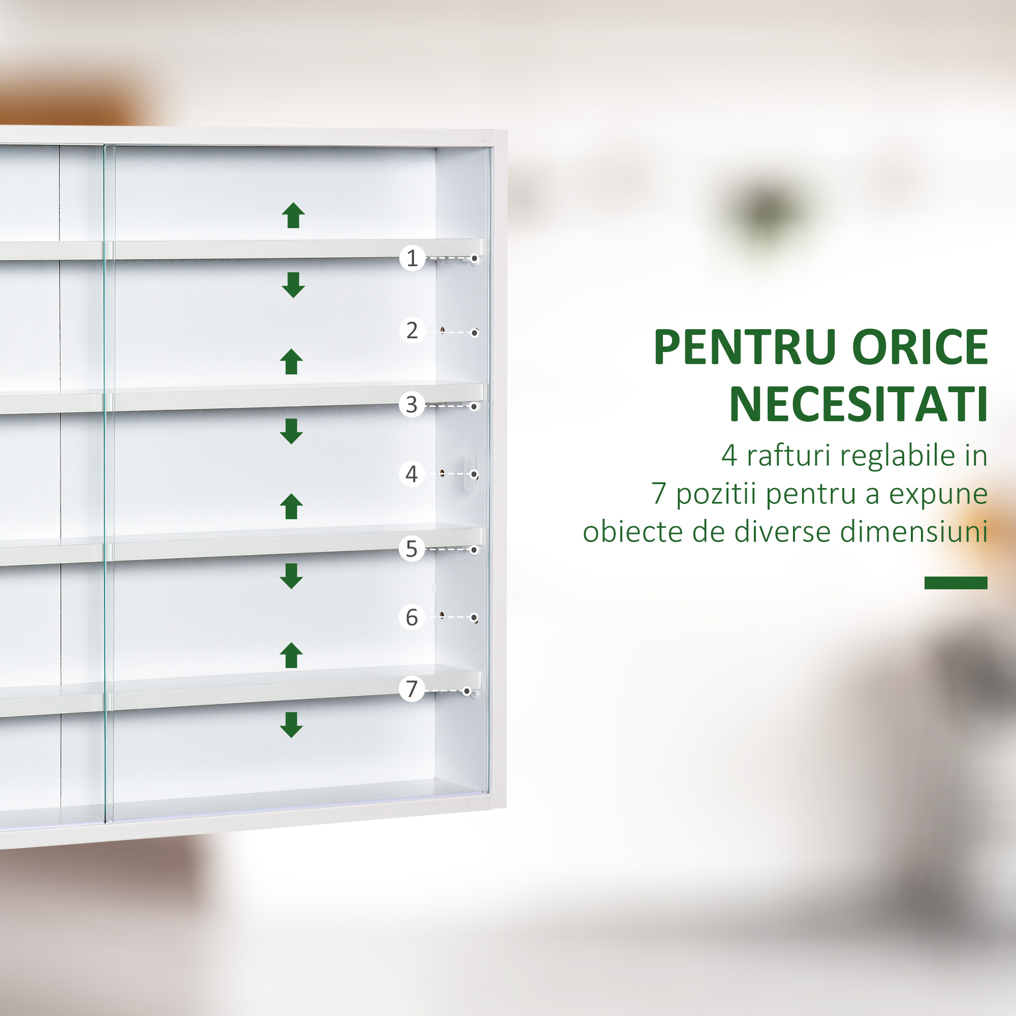 [BRAND NAME] panou cu 5 etajere, polite reglabile, 80x9.5x60cm, alb poate fi acel obiect ideal pentru cei care colectioneaza diverse obiecte sau care vor sa isi expuna intr-un loc special premiile. Este un panou ideal pentru o casa sau pentru un local deoarece aduce un plus estetic incaperii si este versatil. Etajerele pot fi asezate exact asa cum preferati, cum aveti nevoie. In functie de obiectele pe care le expuneti veti aseza si rafturile. [BRAND NAME] panou cu 5 etajere, polite reglabile, 80x9.5x60cm, alb are usi din sticla. Acestea protejeaza obiectele expuse de praf si de diverse accidente, plus ca arata mult mai elegant astfel. Acest produs poate fi prins pe perete in orice incapere. Este realizat din PAL, deci va rezista foarte bine in timp. Culoarea sa alba este potrivita pentru diverse incaperi si stiluri in ceea ce priveste designul de interior.