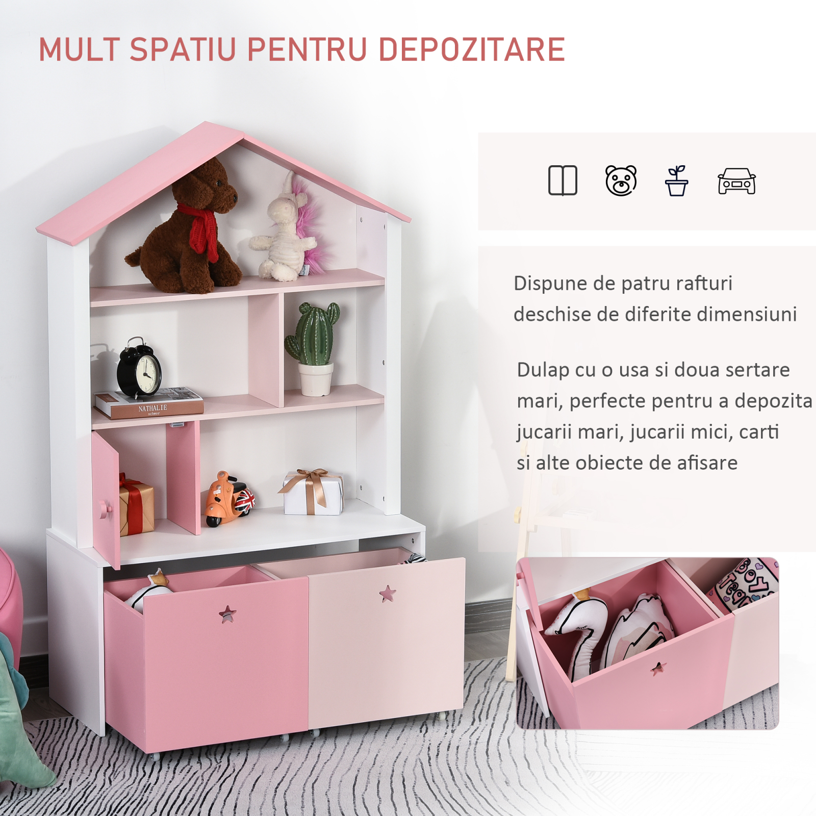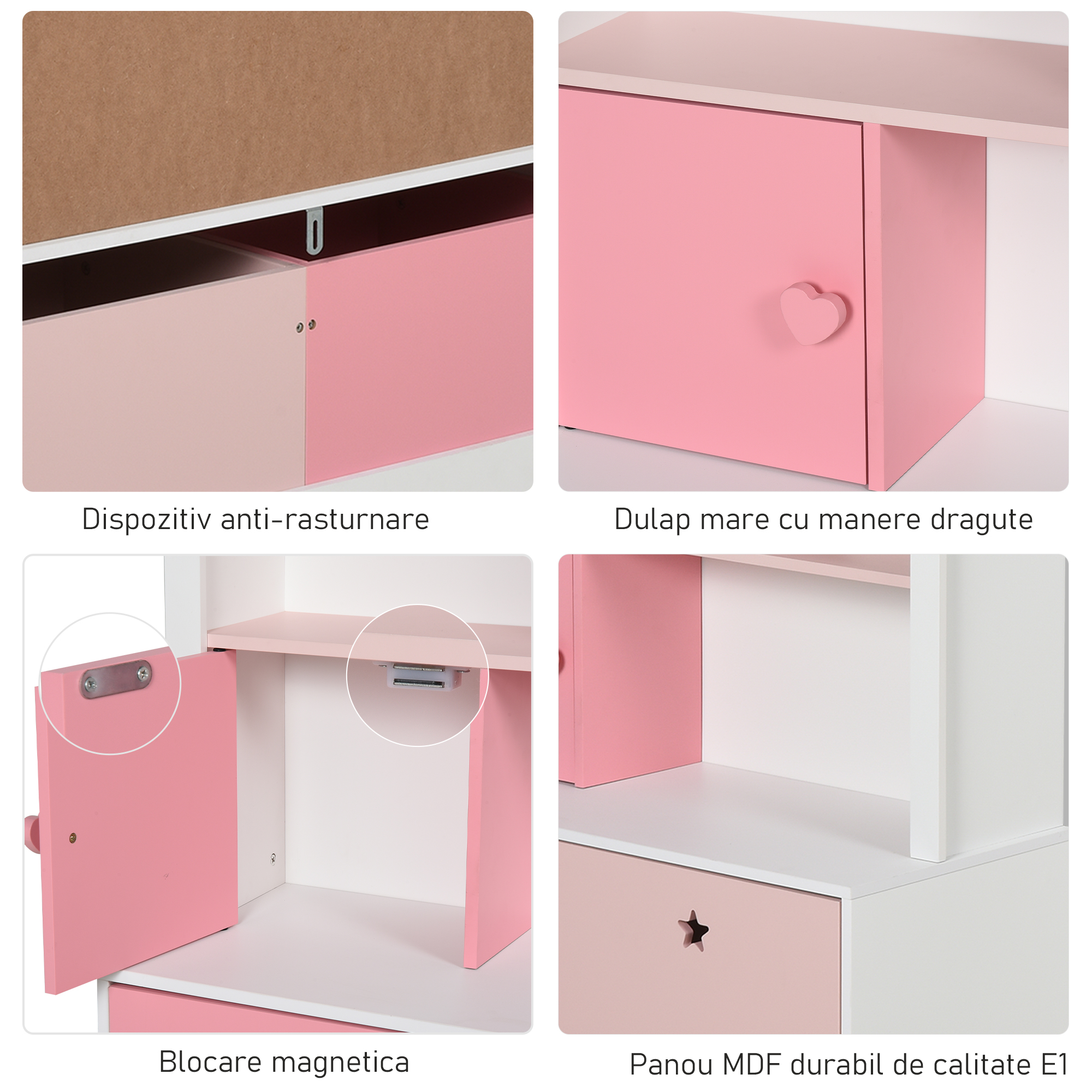 Cei mici trebuie sa invete sa tina lucrurile pe care le au in ordine, inca de la varste fragede. in acest sens de ajutor poate fi [BRAND NAME] dulap cu biblioteca, pentru copii, 80x34x130cm, roz. Poate fi acel obiect de mobilier pentru camera oricarei fete, avand in vedere culoarea sa roz. Dispune de diverse spatii de depozitare si poate fi acel plus estetic necesar din camera copiilor. [BRAND NAME] dulap cu biblioteca, pentru copii, 80x34x130cm, roz este realizat din materiale netoxice, deci nu dauneaza in niciun fel copiilor. Dispune de doua rafturi impartite in jumatate pentru a depozita diverse lucruri. Poate fi locul ideal in care copiii sa tina cartile pe care le au, alaturi de diverse jucarii sau orice alte obiecte. Are si un sertar ce poate fi deschis usor, ideal pentru diverse piese sau jucarii mai mari ce trebuie tinute la un loc.