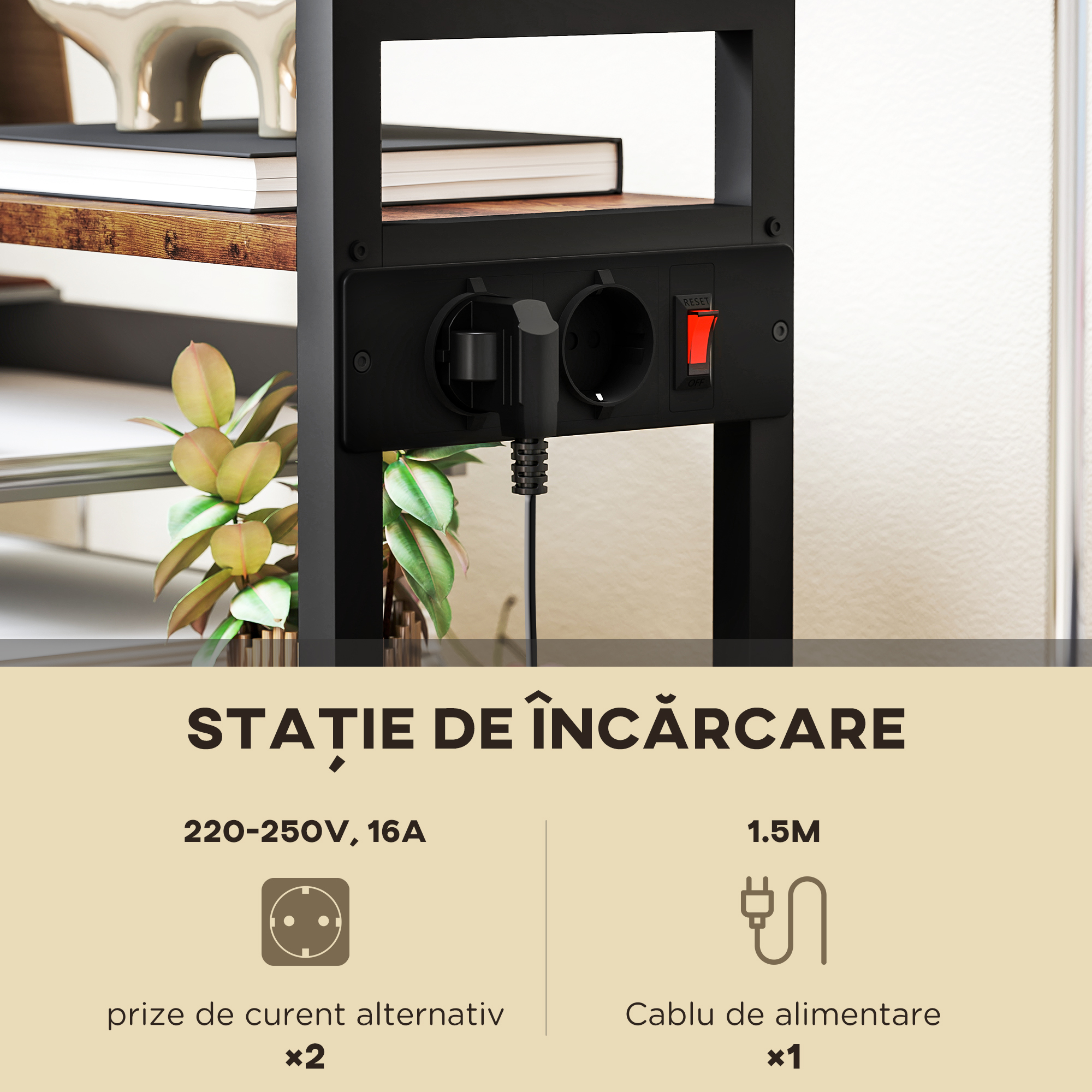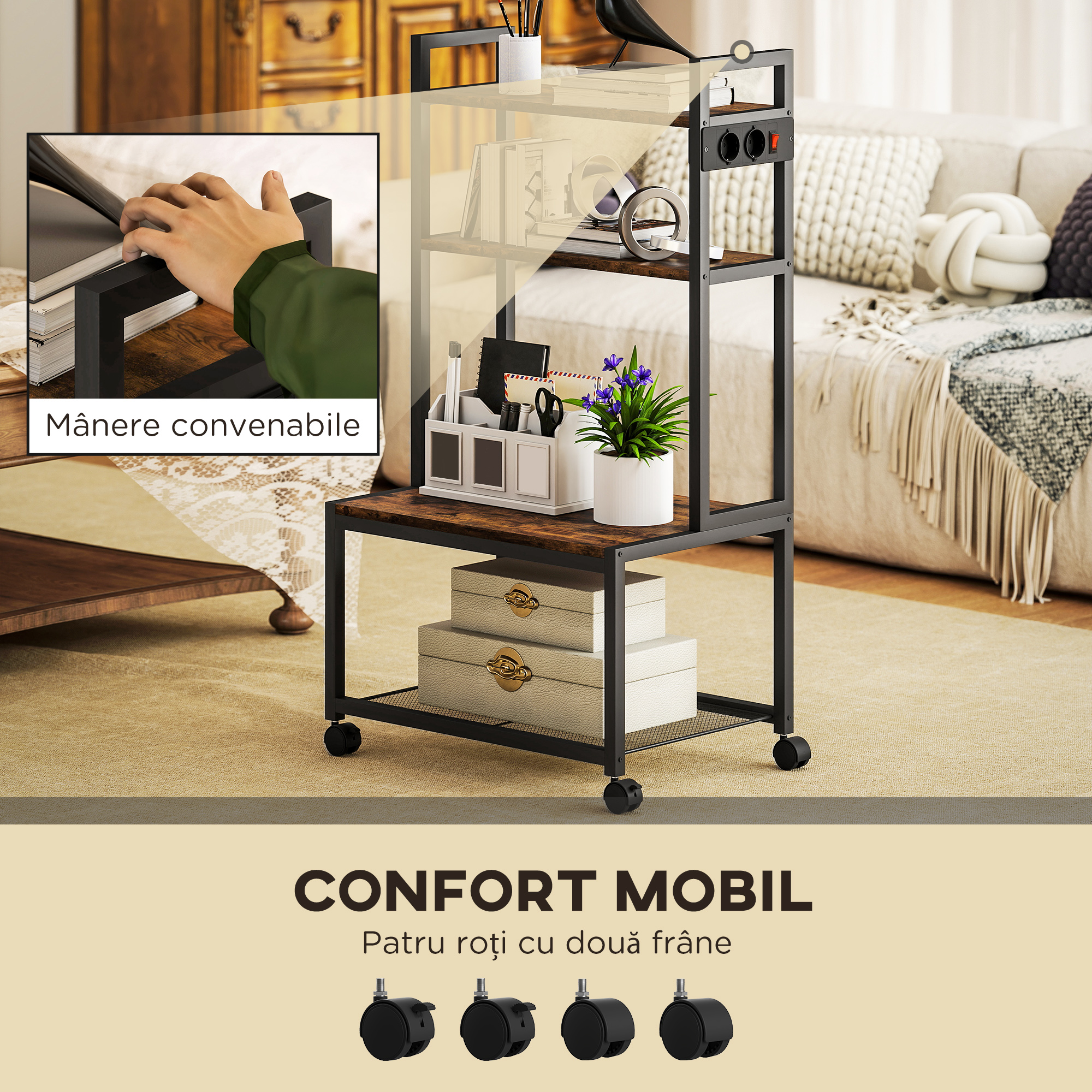 Modernizeaza-ti zona de lucru cu suportul pentru imprimanta [BRAND NAME] . Aceasta unitate de depozitare cu patru etaje include doua prize convenabile si un cablu de 1,5 m, facilitand conectarea rapida. Suportul din metal robust de pe nivelul inferior poarta greutati mari, iar rotile pivotante permit mutarea usoara a caruciorului, adaptandu-se oricarui spatiu de acasa.