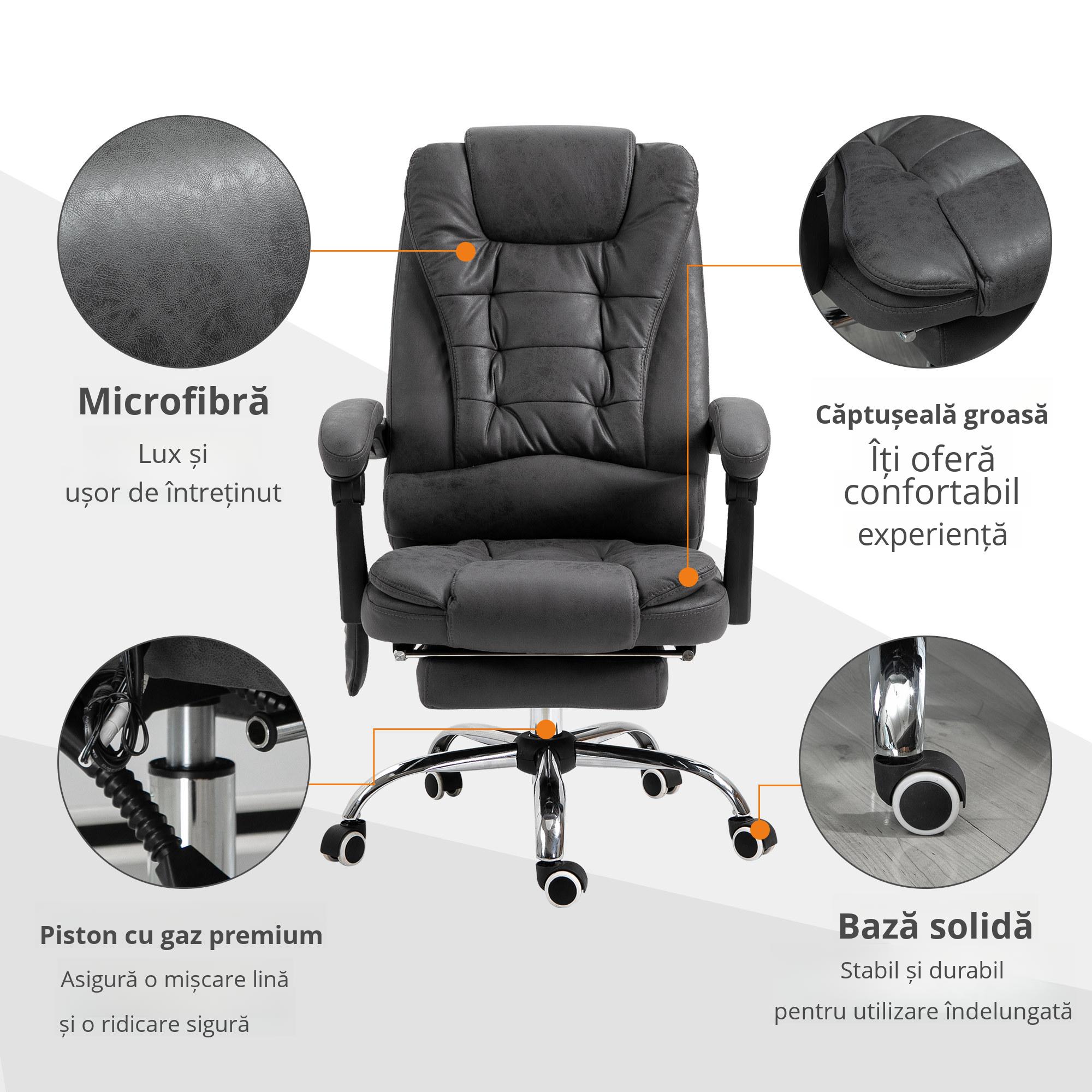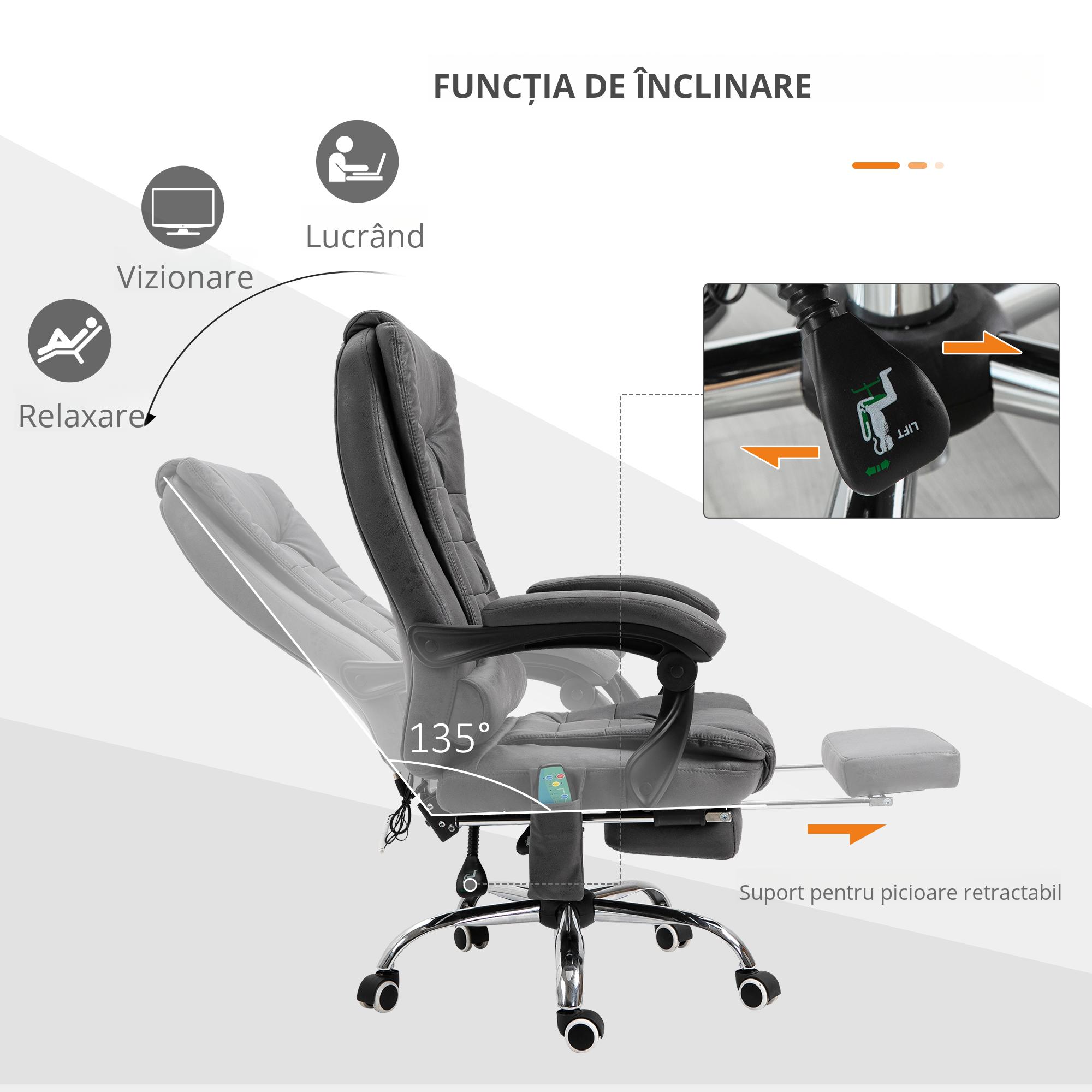 Alegeti scaunul cu masaj de birou [BRAND NAME] pentru a ameliora stresul de la locul de munca. Perfect atat ca scaun de birou cat si pentru momentele de relaxare acasa, este dotat cu incalzire lombara si 6 puncte de masaj: 4 distribuite pe spatar si 2 pe sezut. in plus, spatarul poate fi inclinat pana la 135 de grade si, pentru o relaxare completa, puteti folosi suportul practic detasabil pentru picioare. Captuseala din microfibra este moale si usor de curatat.