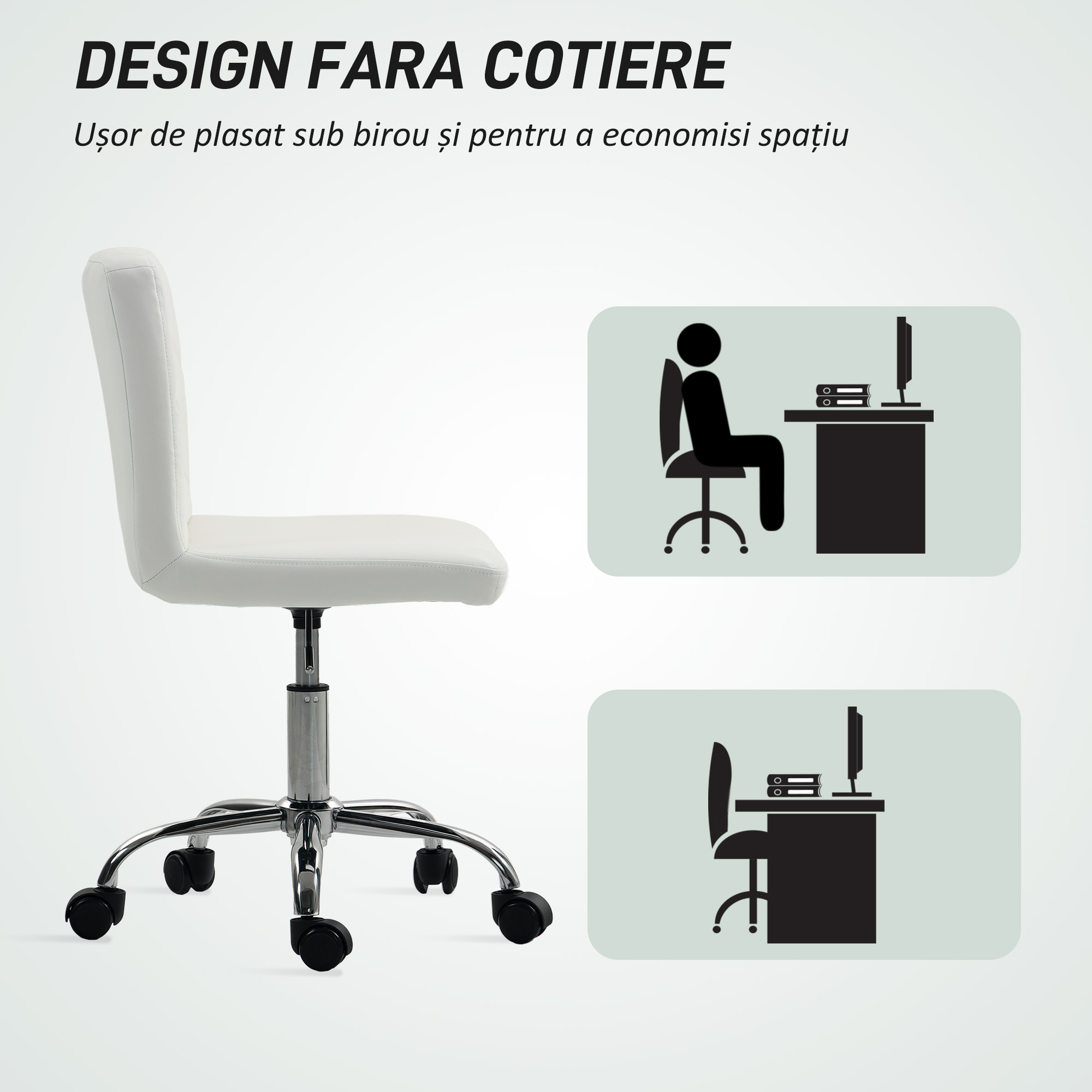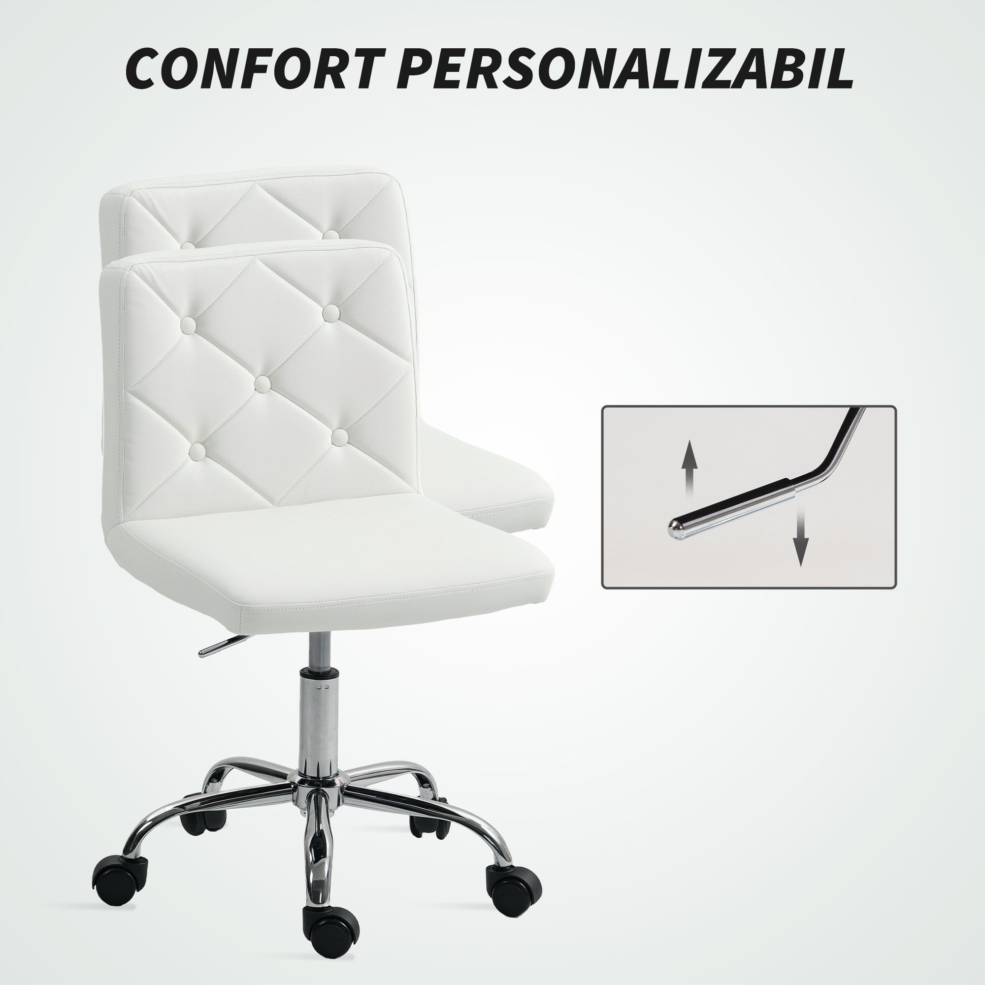 Exploreaza rafinamentul scaunului de birou [BRAND NAME], unde detaliile capitonate se combina armonios cu functionalitatea, perfect pentru biroul de acasa sau coltul de machiaj. Acest model fara brate, eficient spatial, prezinta un finisaj din piele PU ce simuleaza zgarieturi de pisica, oferind o textura distinctiva, simplu de intretinut si durabila. Regleaza-l cu usurinta datorita mecanismului sau de rotire lina si inaltime adaptabila, garantand confort si eleganta oriunde l-ai plasa.