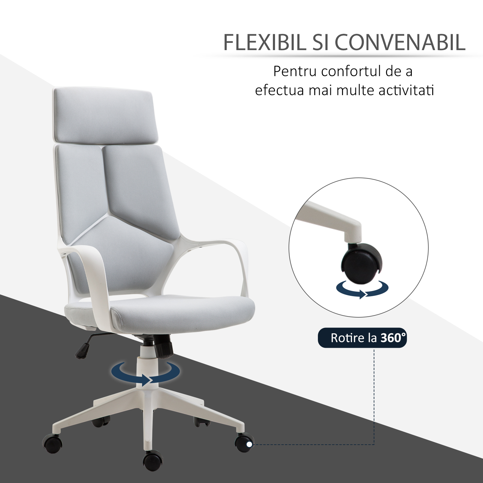 Lucreaza confortabil ore intregi cu scaunul ergonomic [BRAND NAME] din material respirabil mesh. Designul curbat sustine corect coloana vertebrala, reducand oboseala si tensiunea lombara. inaltimea reglabila si functia de pivotare la 360° ofera libertate de miscare si adaptabilitate maxima. Cadrul stabil cu roti silentioase permite deplasarea usoara. Ideal pentru birou, home-office sau spatii de studiu, imbina functionalitatea cu un stil modern si elegant.