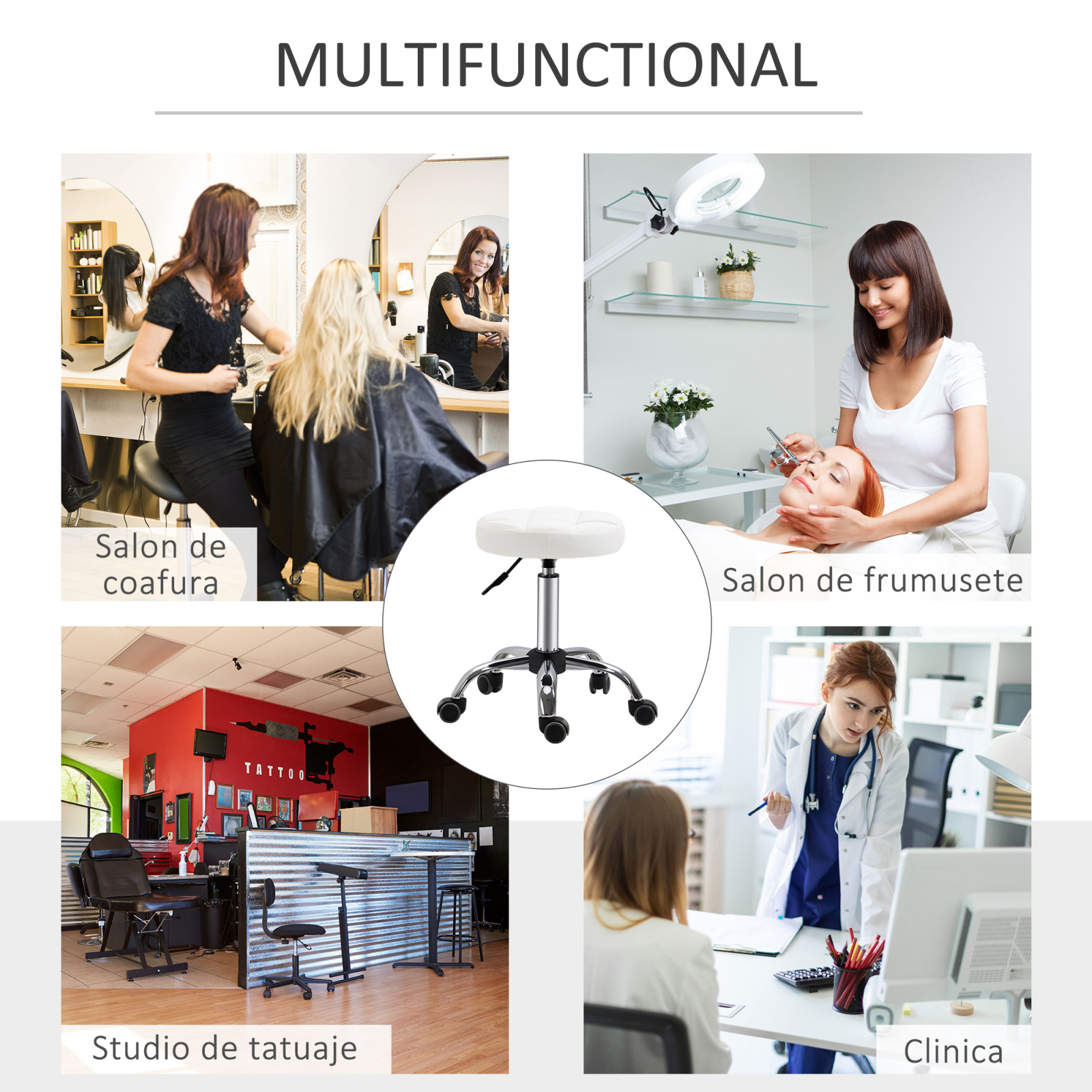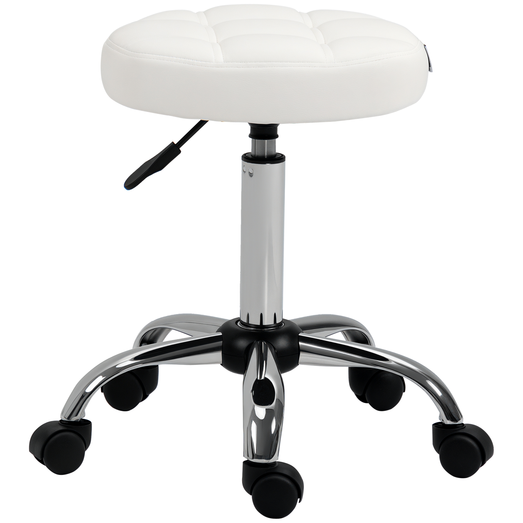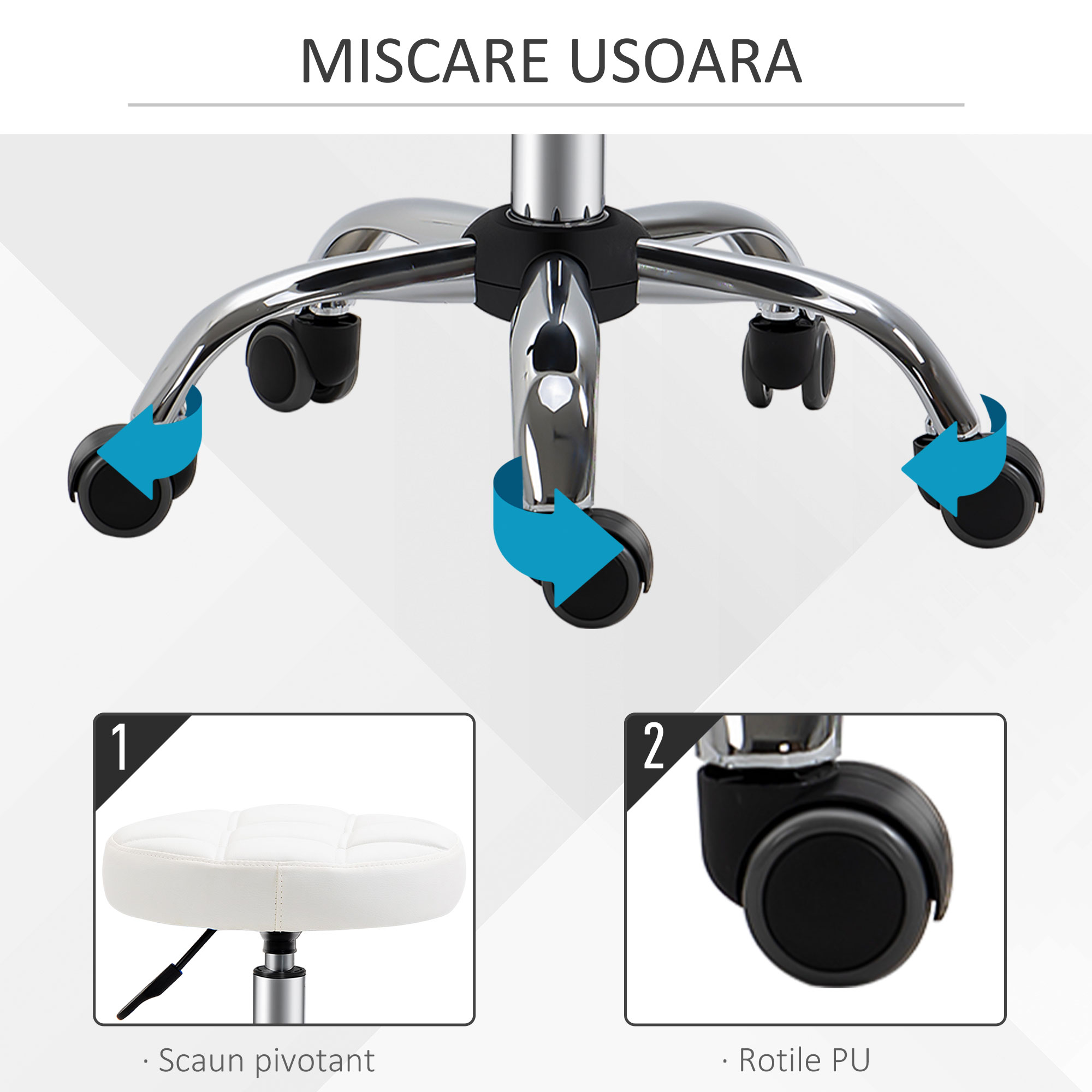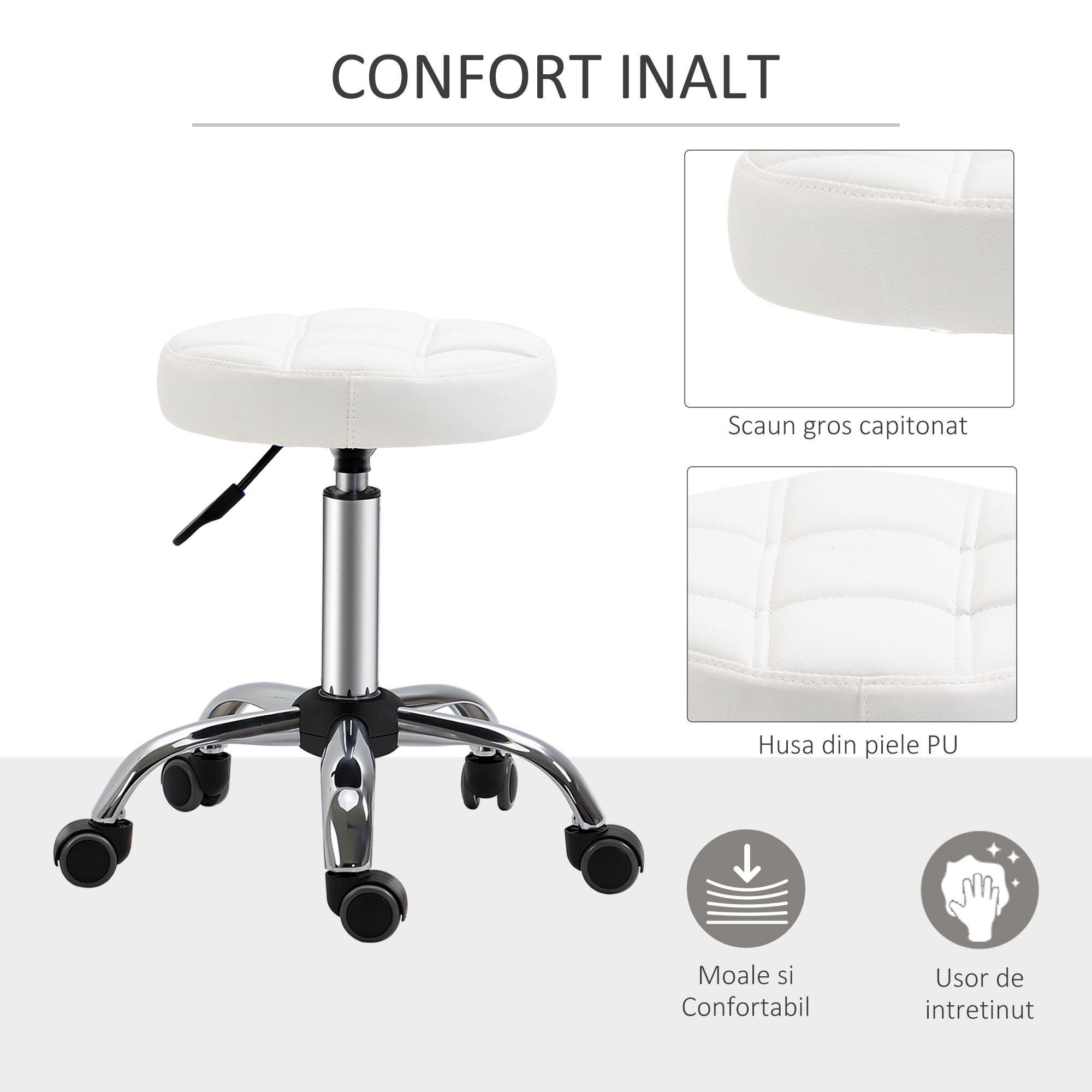 Cauti un scaun confortabil, compact si placut? Acest scaun de lucru reglabil pe inaltime de la [BRAND NAME] este solutia ideala. Designul fara brate si sezutul rotativ ofera libertate maxima de miscare si iti permite sa depozitezi scaunul cu roti sub masa pentru a economisi spatiu. Perna din piele ecologica este confortabila, iar sezutul are un design elegant cu cusaturi decorative.
