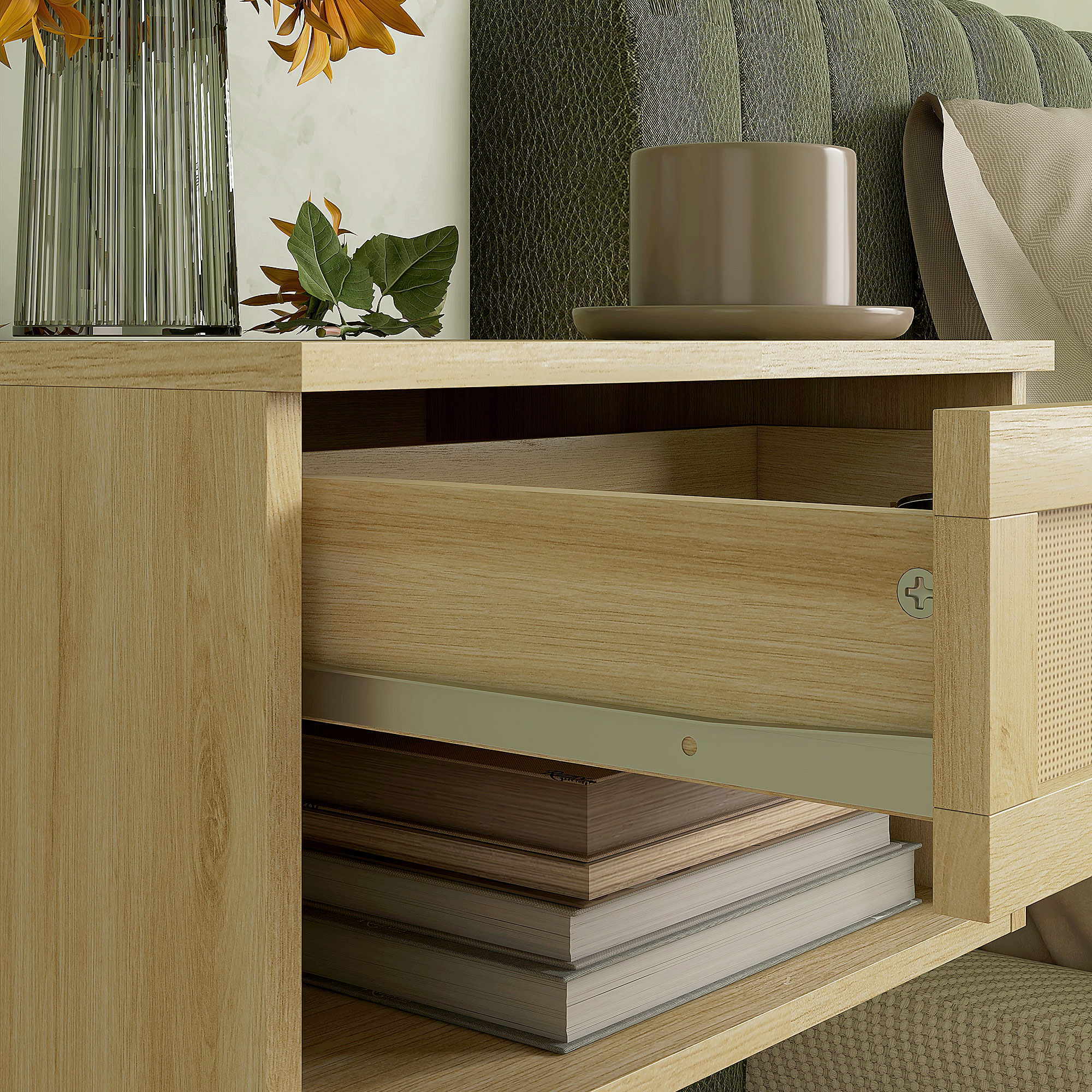 imbratiseaza farmecul stilului nordic cu acest set de 2 noptiere plutitoare [BRAND NAME], cu sertare din ratan pentru o nota de eleganta. Nu numai ca aceste noptiere ridica decorul dormitorului, dar ofera si o combinatie inteligenta de sertar si raft deschis pentru toate nevoile dvs. de depozitare. Realizate cu un cadru din PAL acoperit cu melamina, acestea se dubleaza ca mese de telefon sau noptiere sic.