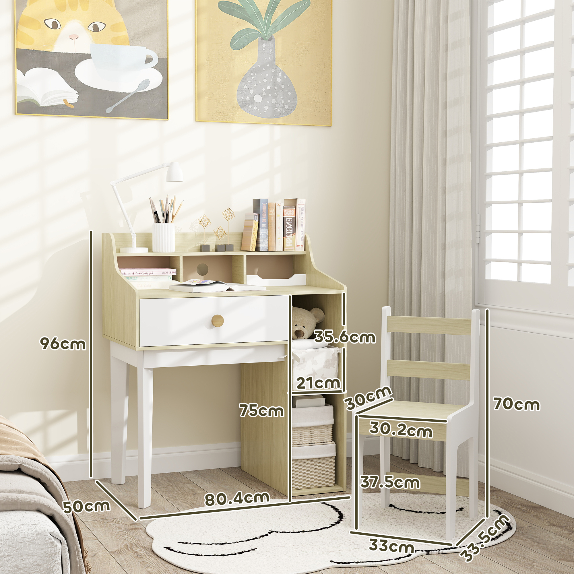 - DIMENSIUNI: Dimensiuni totale: Masa: 80,4 x 50 x 96 cm. Scaun: 33 x 33,5 x 70 cm. Capacitate de greutate: 15 kg (blatul mesei), 2,5 kg (sertar, rafturi), 35 kg (scaun). Certificari: EN71-1-2-3. Necesita asamblare