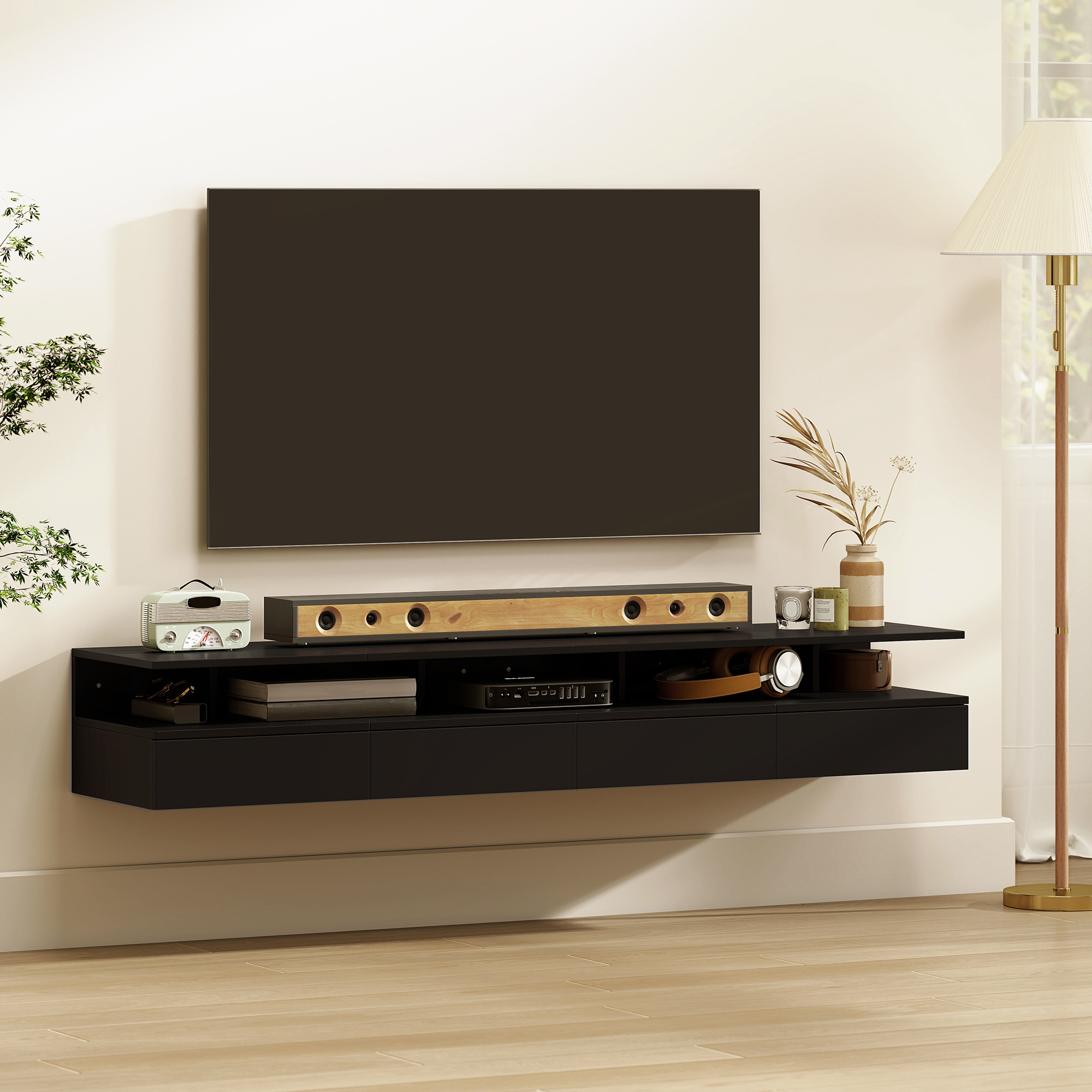 Adauga un strop de eleganta dormitorului tau cu acest set de 2 noptiere suspendate [BRAND NAME]. Echipate cu sertar, raft deschis si suprafata plata, aceste noptiere ofera spatiu pentru obiectele esentiale. Designul suspendat elibereaza spatiu pe podea, protejeaza de umiditate si pastreaza ordinea. Ideale pentru spatii mici sau pentru cei care doresc un stil modern si practic.