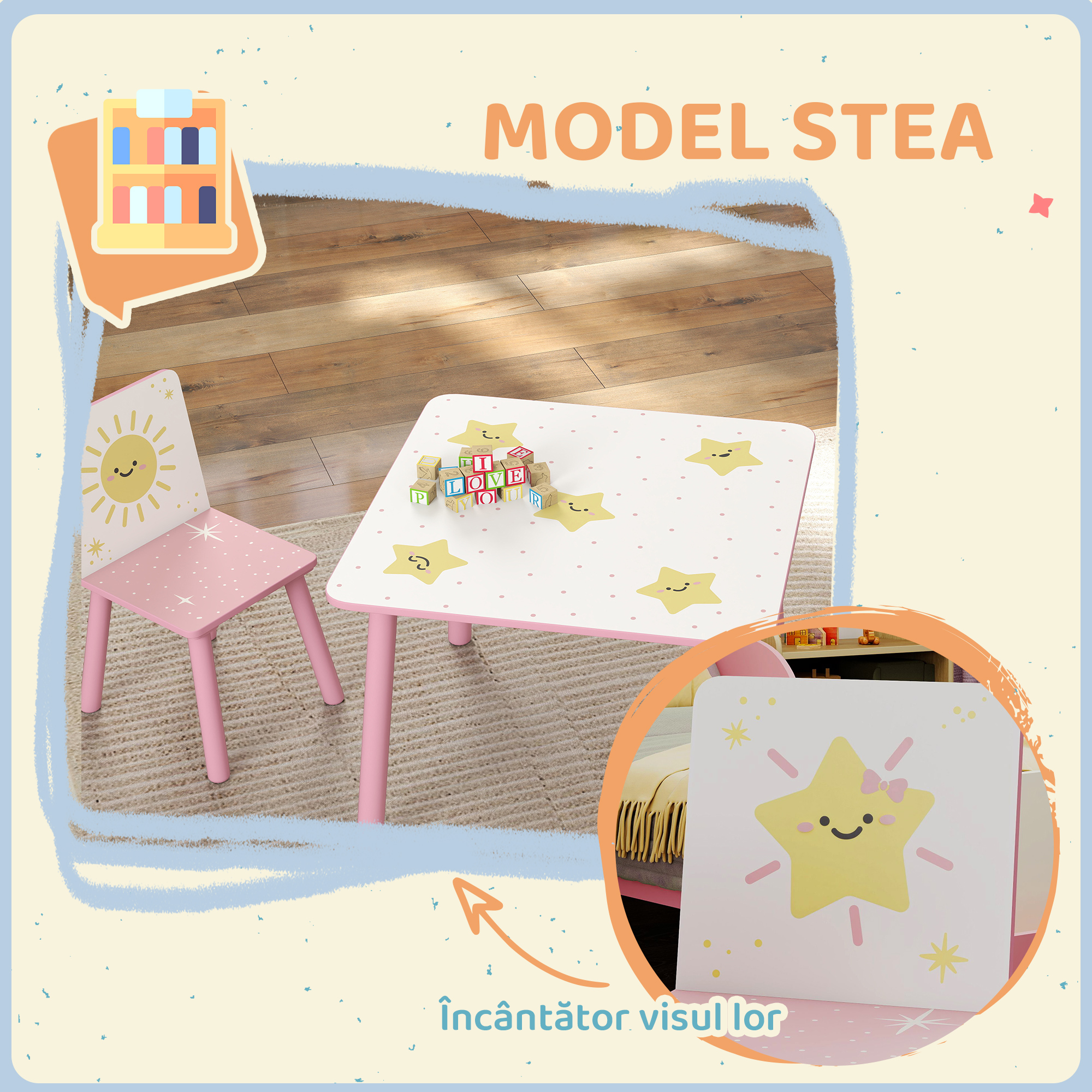 Fa fiecare zi a micutilor tai stralucitoare cu setul de masa si scaune pentru copii [BRAND NAME] de 3 piese, perfect pentru cei mici de la 3 ani in sus. Ideal pentru desenat, citit sau jucat, are o finisare roz cu decoratii stelare si margini rotunjite pentru a asigura siguranta si confortul. Usor de mutat, setul cu scaune si masa pentru copii se potriveste minunat in orice sala de jocuri sau camera de copii. Stimuleaza mintile tinere in fiecare zi!