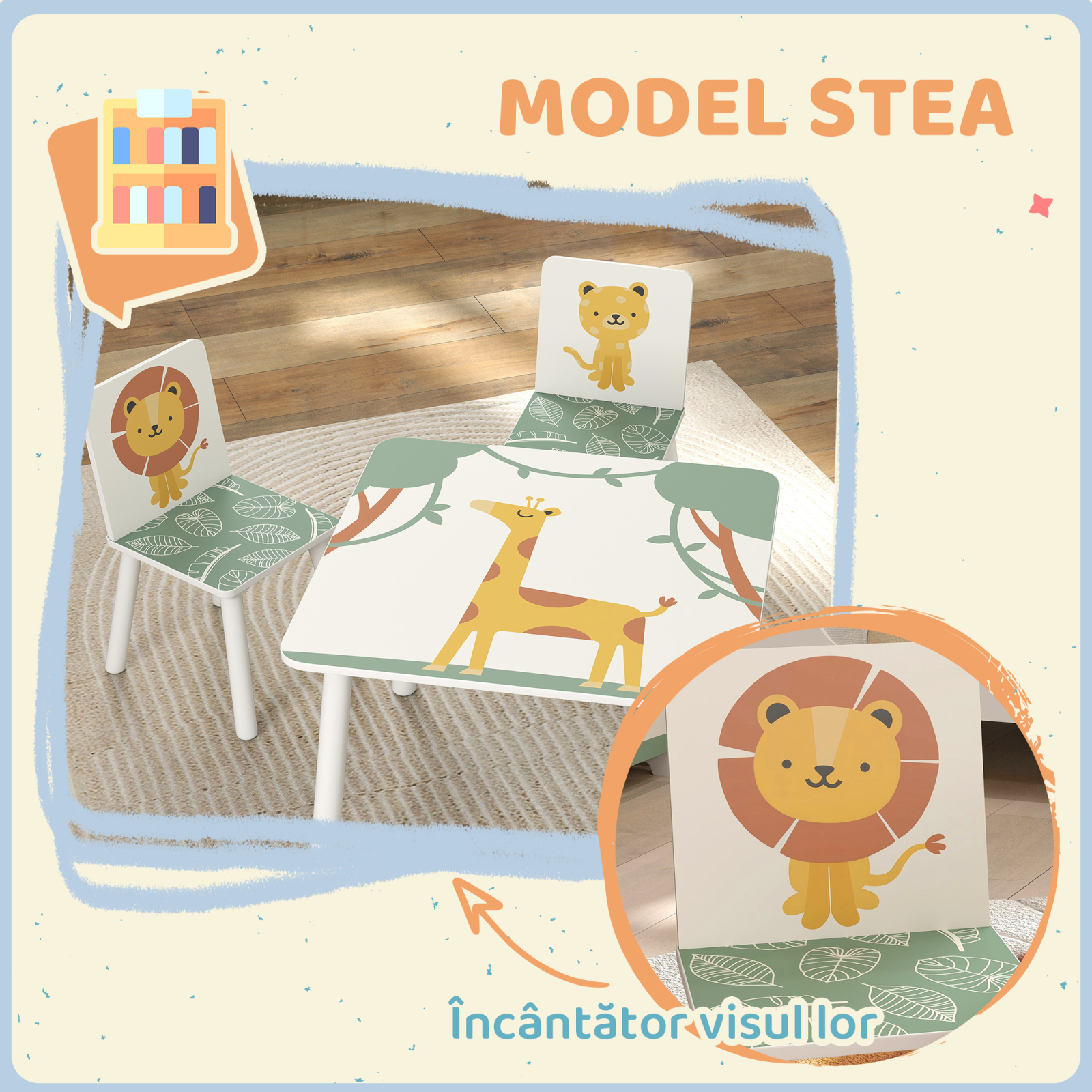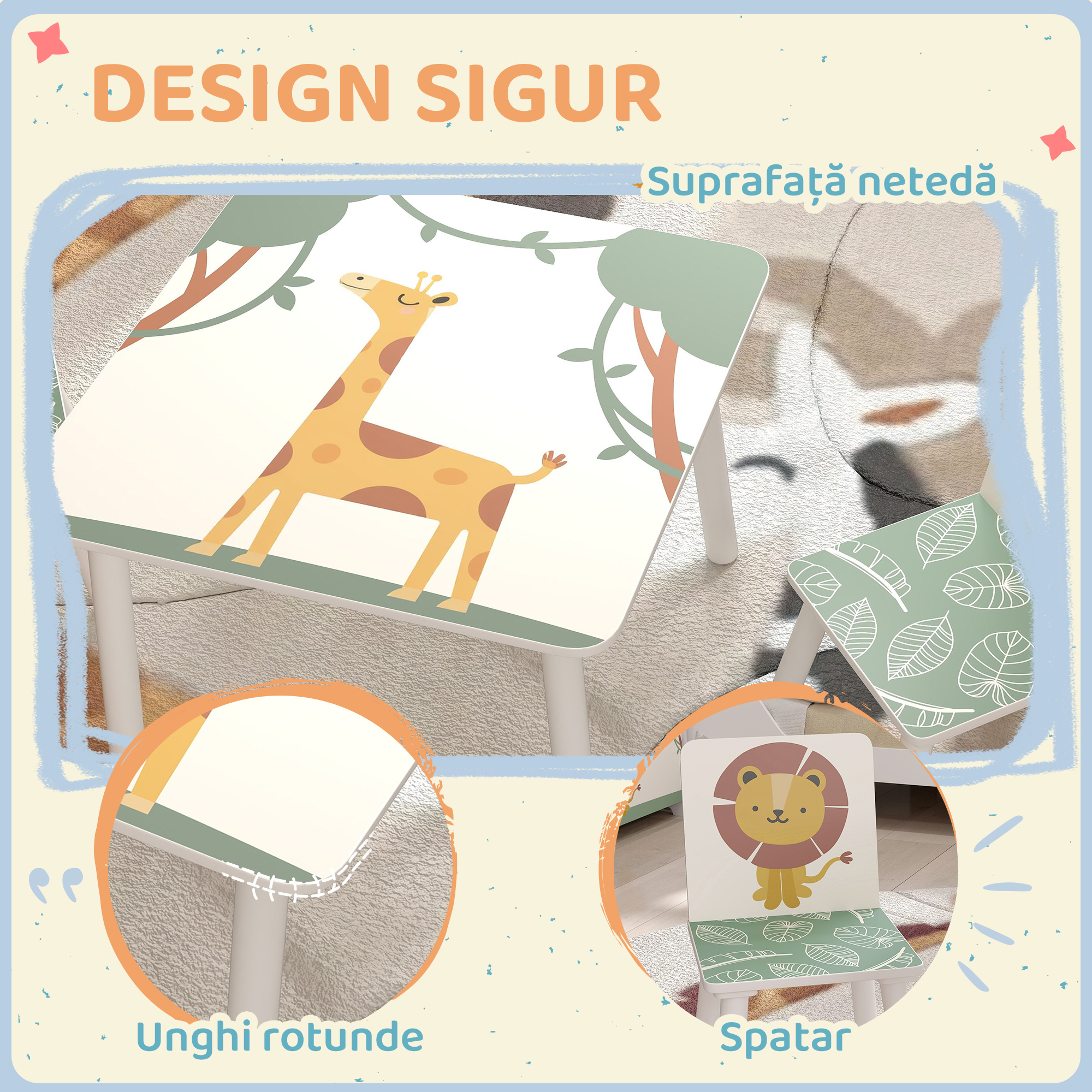 insenineaza fiecare zi a celor mici cu setul de masa si scaune pentru copii [BRAND NAME], format din 3 piese, perfect pentru copiii de 3 ani si peste. Ideal pentru desenat, citit sau jucat, are o finisare verde cu desene de animale si margini rotunjite pentru a asigura siguranta si confortul. Usor de mutat, setul cu scaune si masa pentru copii se potriveste minunat in orice sala de jocuri sau camera de copii. Stimuleaza mintile tinere in fiecare zi!