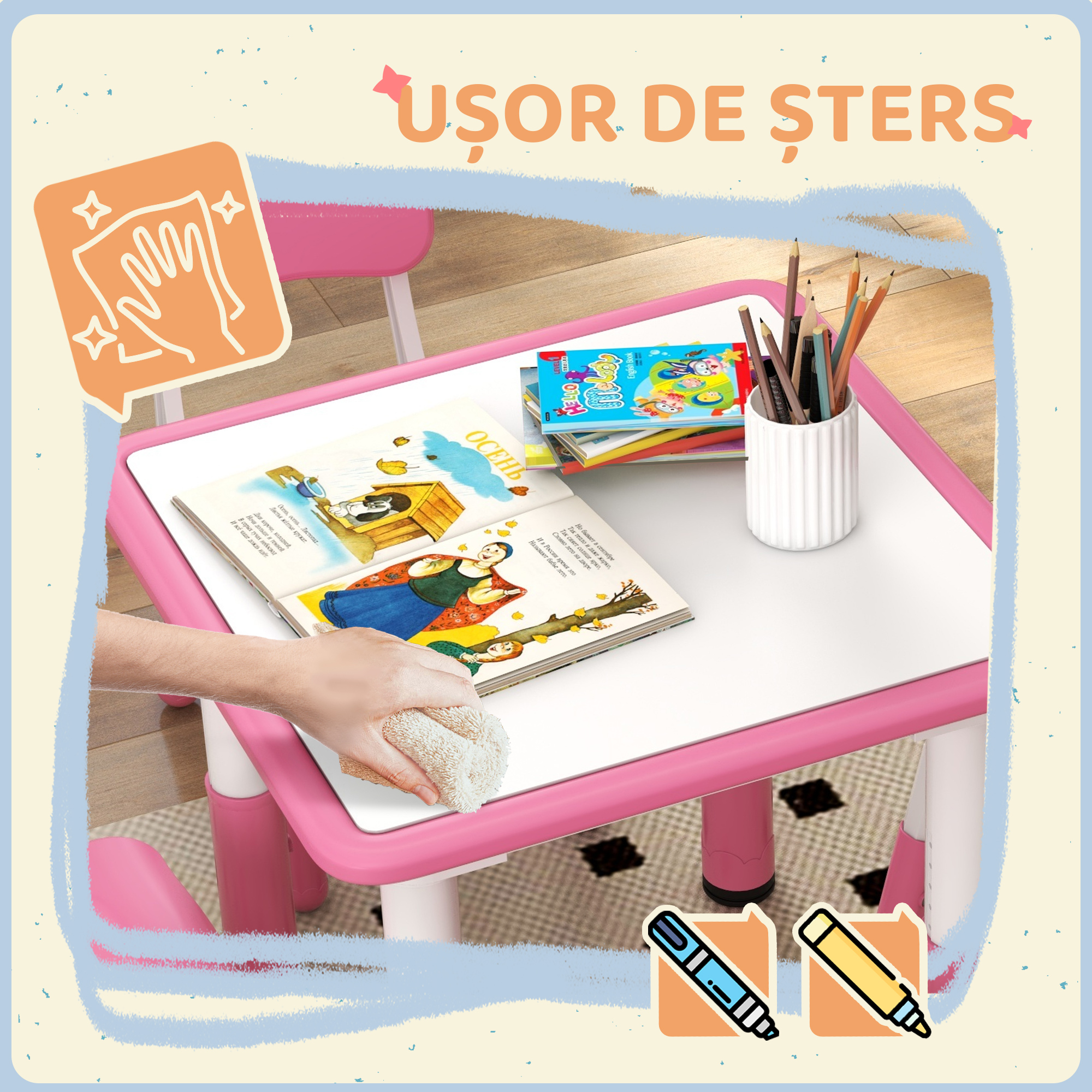 Creeaza un spatiu educativ si distractiv pentru cei mici cu setul [BRAND NAME], ideal pentru copii intre 18-60 luni. Masa cu inaltime reglabila si tabla de scris stimuleaza creativitatea, in timp ce scaunele ergonomice ofera confort. Designul roz atragator se potriveste in camera sau gradinita. Fabricat din materiale sigure si durabile, este perfect pentru desen, joaca sau invatare.