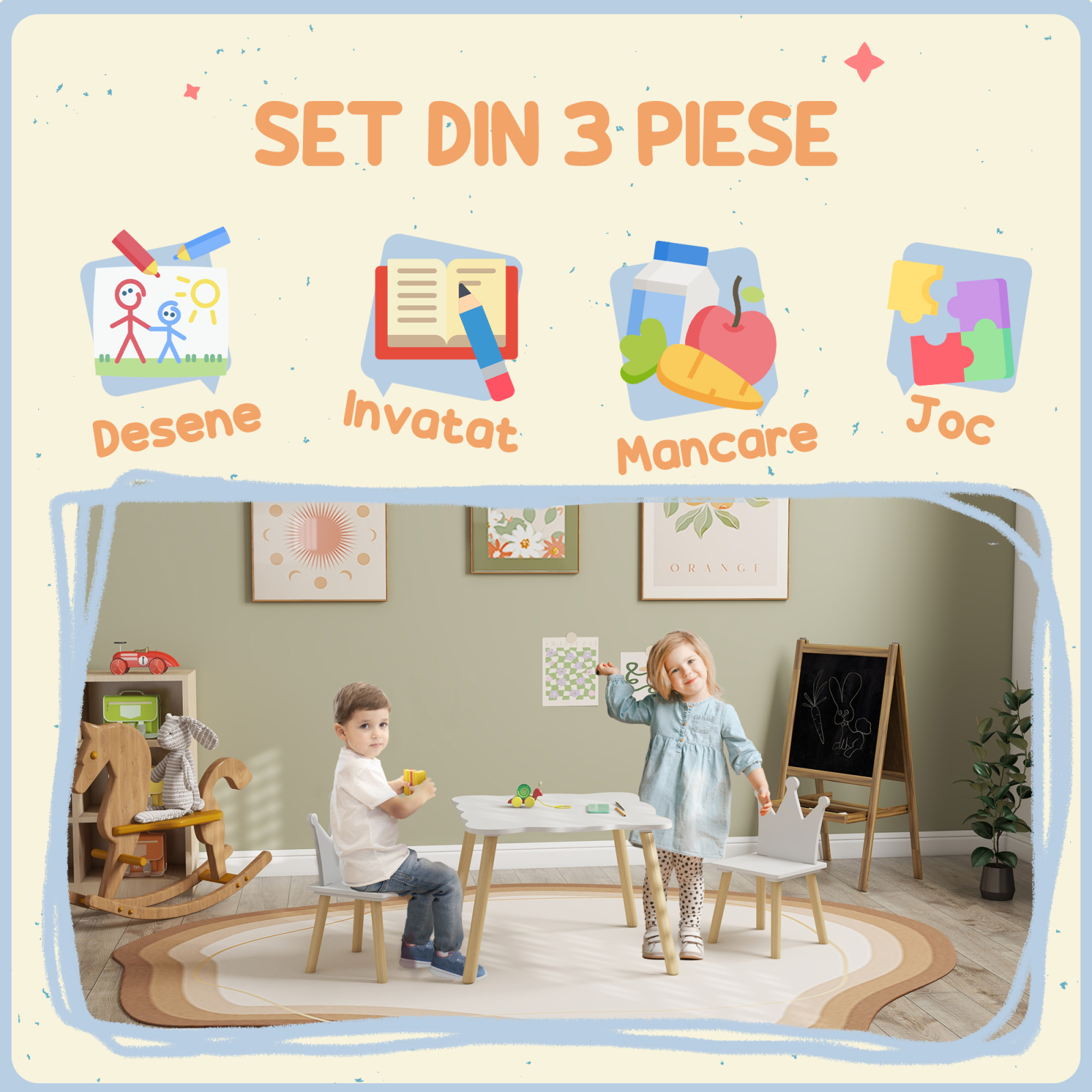 Lasati-va cucerit de setul masa si scaune pentru copii [BRAND NAME], o imbinare perfecta intre distractie si practicitate! Compus dintr-o masuta cu margini ondulate si scaune cu spatare in forma de coroana, este ideala pentru diversele activitati ale copiilor tai, cum ar fi cititul sau desenatul. Fabricat din MDF cu picioare din pin masiv, acest set de mobilier pentru copii imbogateste orice incapere.
