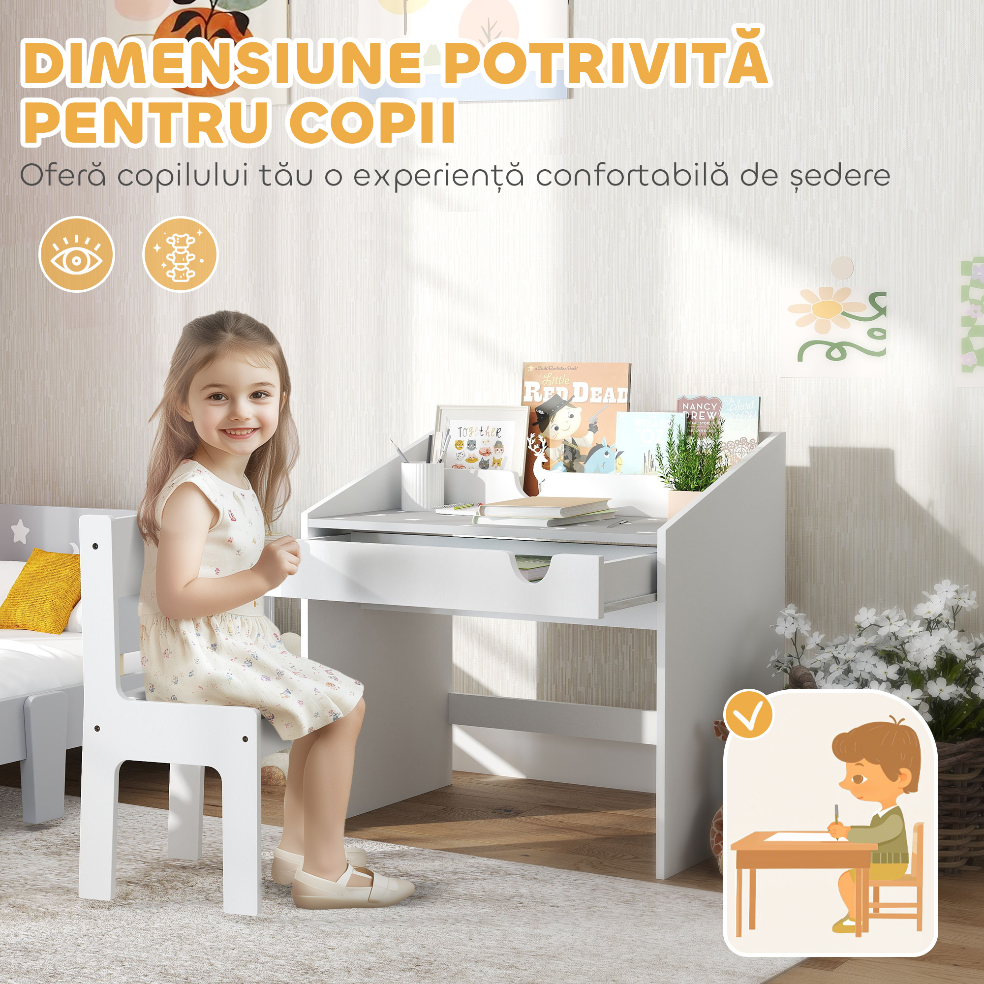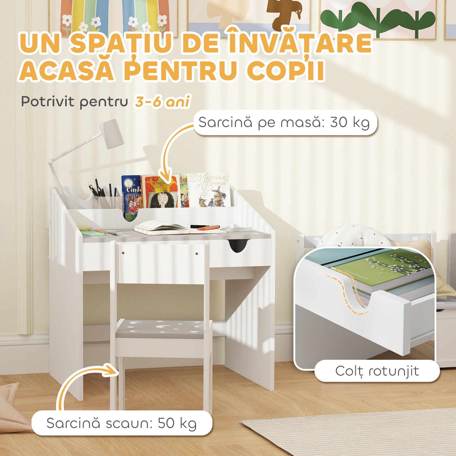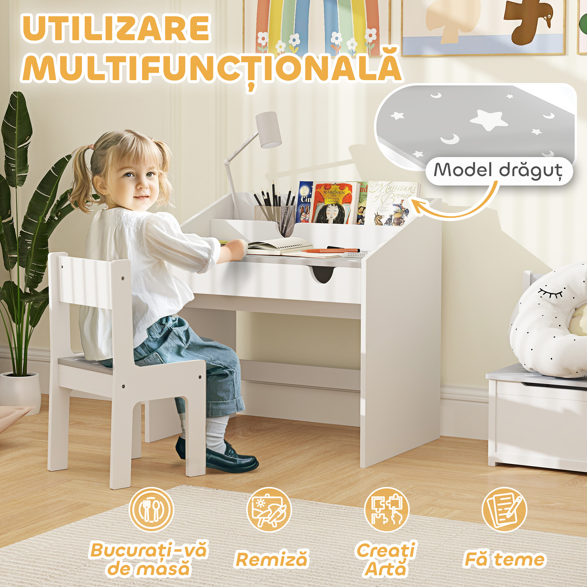 Oferiti celor mici un punct de referinta pentru invatare si creativitate cu acest set de scaun si masa pentru copii [BRAND NAME] cu design de stele si luna. Biroul va fi centrul creativitatii si ordinei datorita spatiilor sale generoase de depozitare, formate dintr-un sertar retractabil si un organizator de masa. Colturile rotunjite ofera o siguranta sporita in timp ce cei mici studiaza, se joaca, citesc sau mananca la masa.