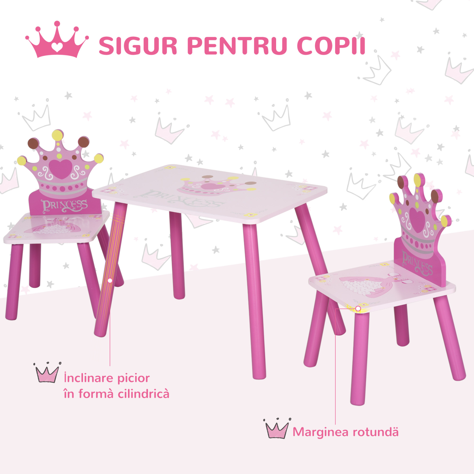 Creeaza un spatiu de joaca regal cu setul [BRAND NAME] pentru copii. Masa si cele doua scaune au un design adorabil de printesa, in forma de coroana, care inspira imaginatia celor mici. Structura solida din lemn asigura stabilitate si siguranta in utilizare zilnica. Perfect pentru activitati creative, desen sau gustari. Culorile vii si finisajele netede adauga veselie camerei copiilor. Ideal pentru micutele care viseaza la un colt de basm.