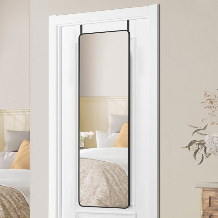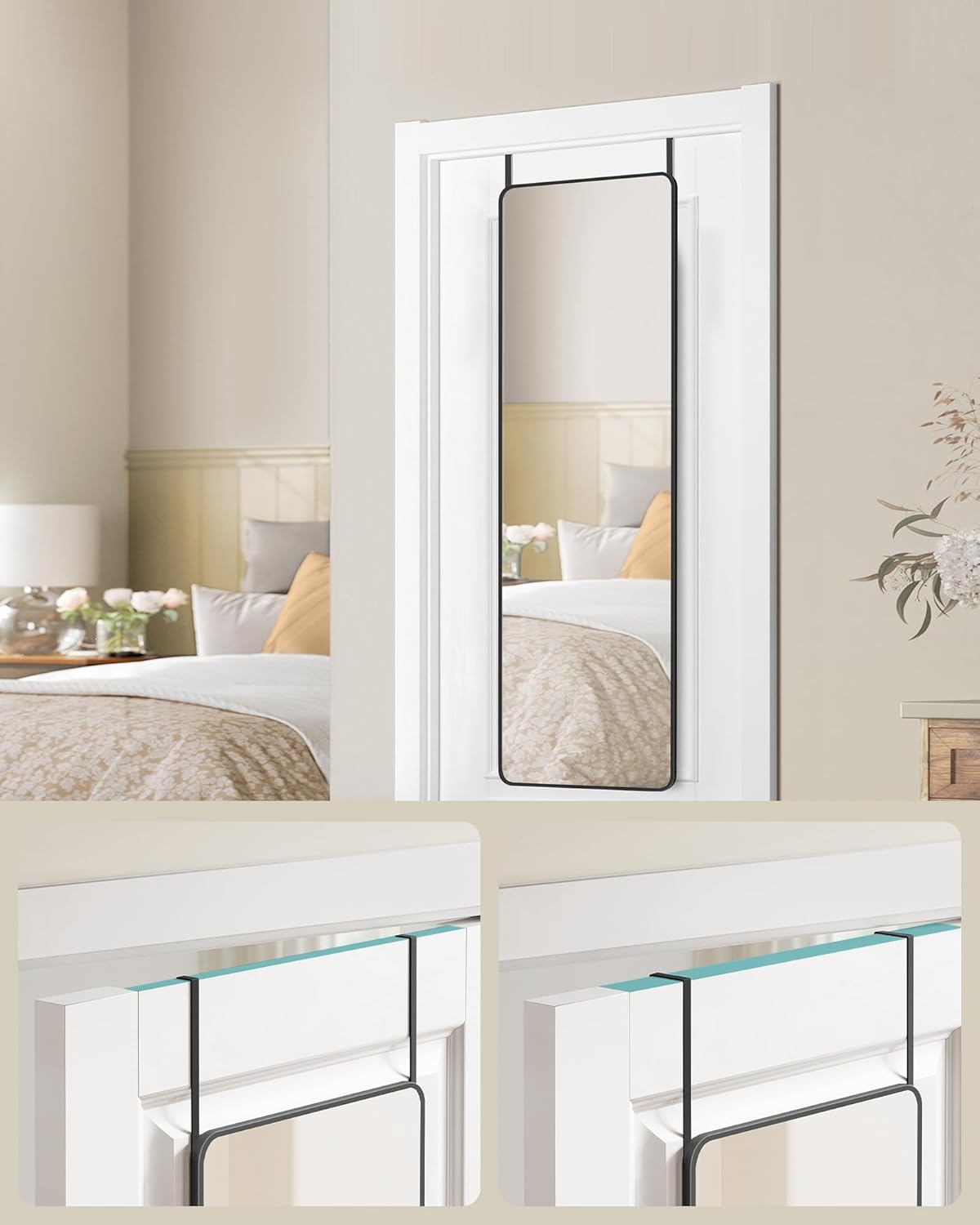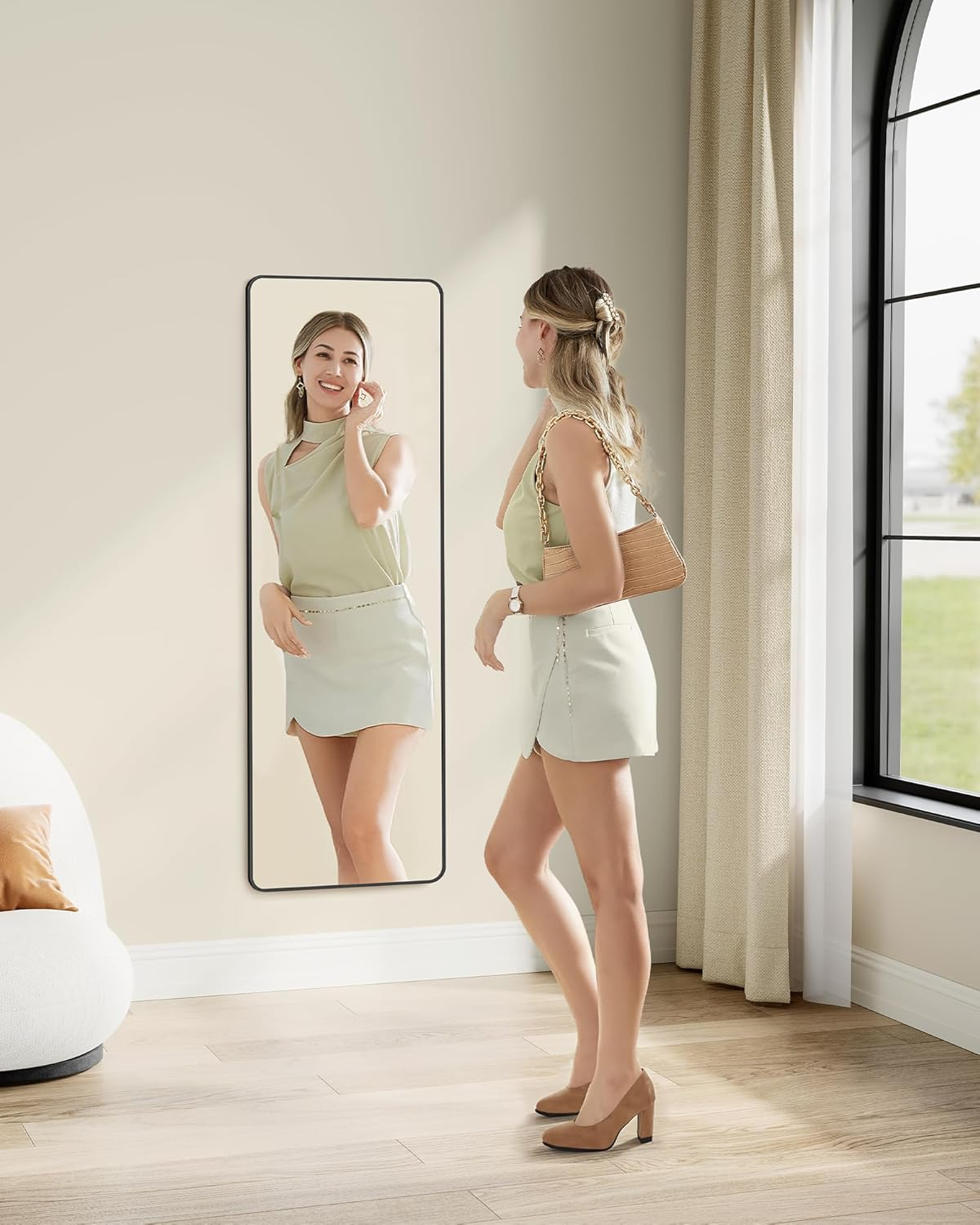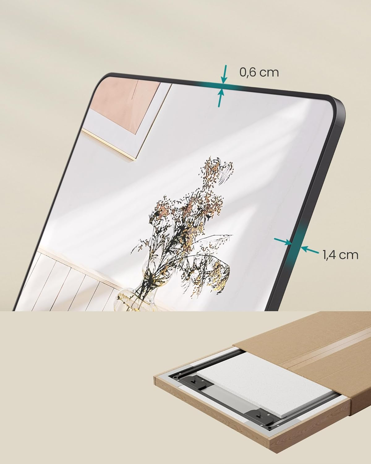 Oglinda SONGMICS de 120 x 40 cm ofera o imagine completa a tinutei si se potriveste perfect in dormitor, hol sau dressing. Designul minimalist cu rama din aluminiu negru adauga un aspect modern incaperii, iar sticla securizata ofera siguranta si durabilitate. Poate fi montata pe perete sau pe usa, fiind o solutie practica pentru economisirea spatiului.
