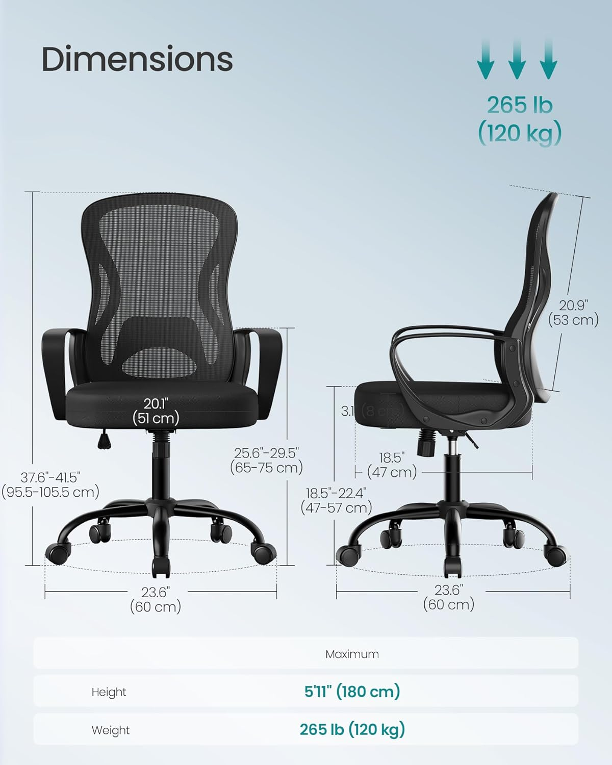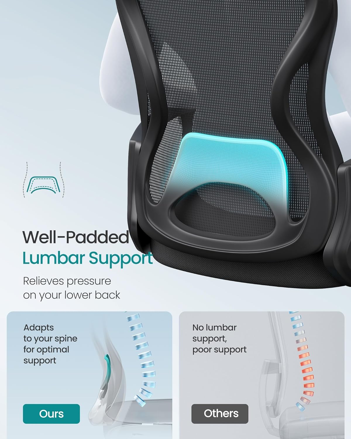 Scaunul de birou ergonomic SONGMICS imbina confortul zilnic cu un design modern si aerisit. Spatarul din mesh permite ventilatia optima, iar suportul lombar integrat ajuta la mentinerea unei pozitii corecte. Ideal pentru lucru, studiu sau utilizare zilnica acasa.