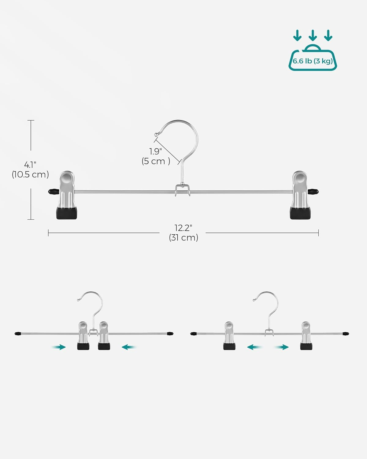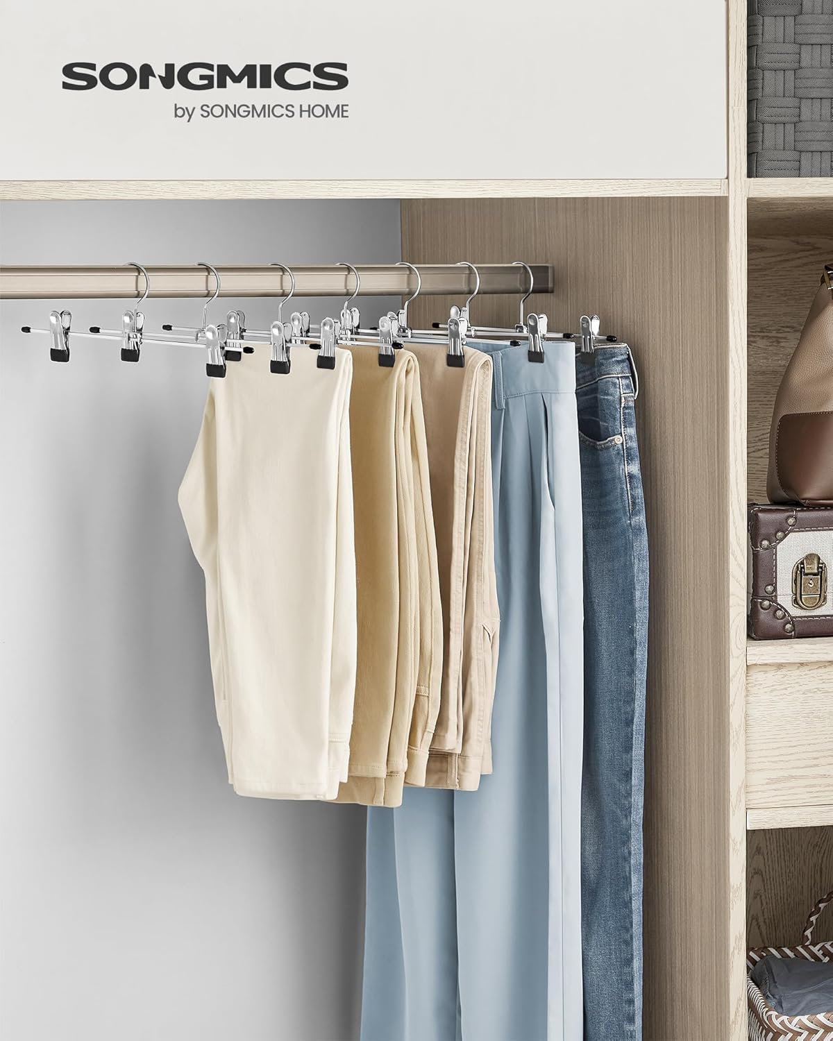 Organizeaza eficient pantalonii si fustele cu acest set de umerase metalice rezistente. Clemele reglabile si acoperite cu PVC protejeaza materialele si asigura fixare sigura fara urme.