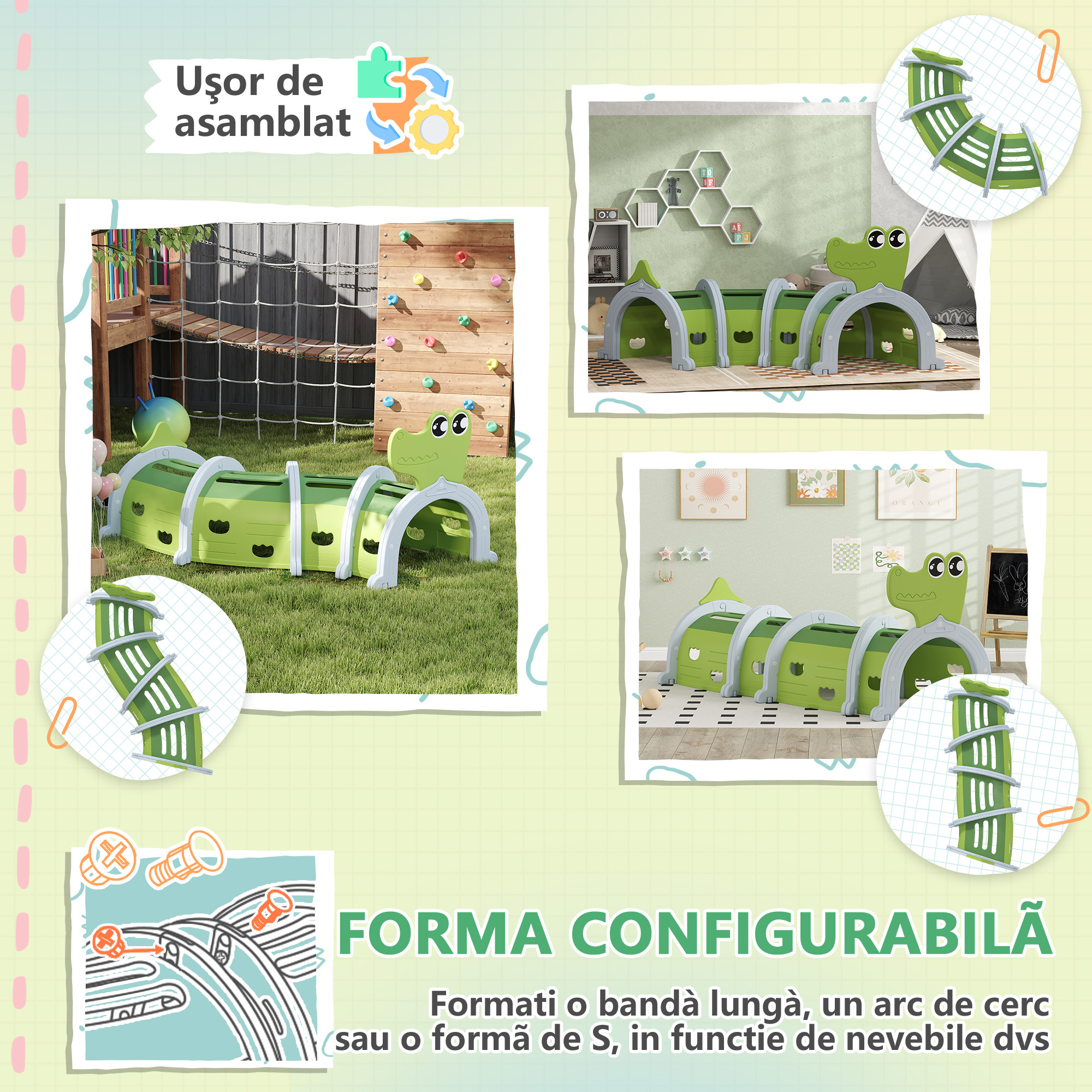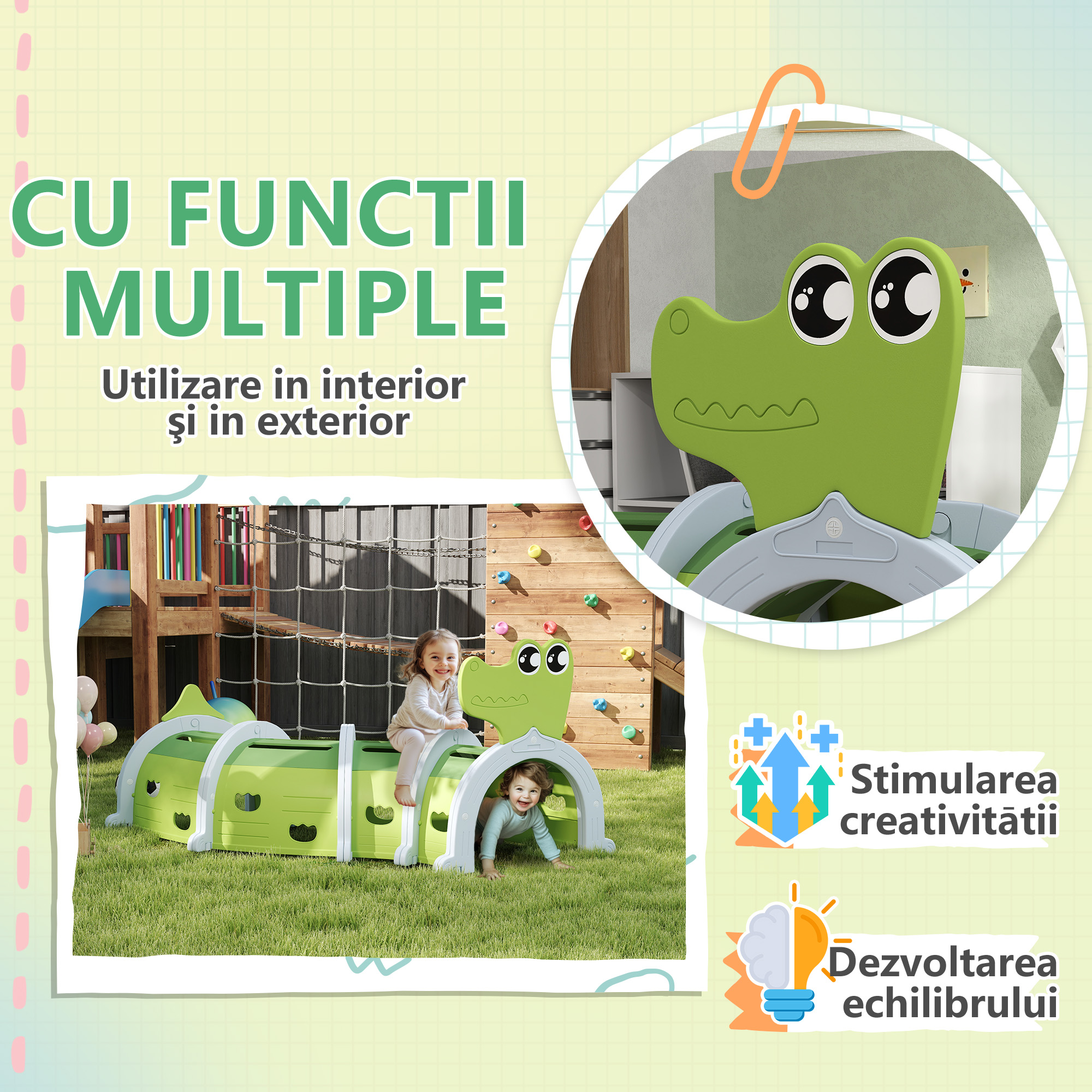Porneste intr-o calatorie vesela prin tunelul de joaca pentru copii de la [BRAND NAME], care are forma unui crocodil vesel! Creat pentru versatilitate, acesta se transforma intr-o banda lunga, un arc sau forma literei S pentru distractie nesfarsita. Fie ca acestia se tarasc sau se joaca de-a v-ati ascunselea, acest tunel pentru bebelusi duce timpul de joaca la urmatorul nivel. Materialul robust HDPE si cele cinci perechi de picioare asigura stabilitate atat pentru aventurile din interior, cat si pentru cele din aer liber, facandu-l o alegere ideala pentru fiecare inima jucausa.