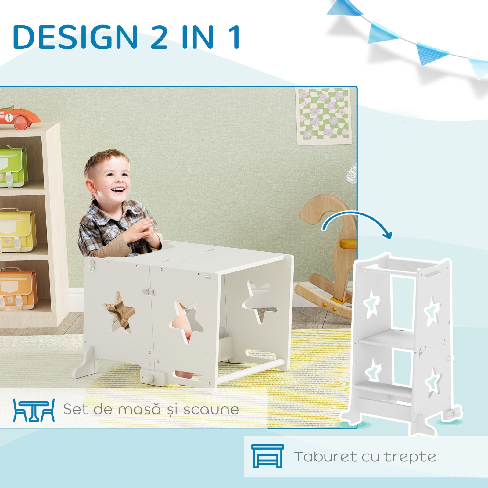 • • Se transforma intr-un set de masa si scaune pentru copii pentru a asigura o utilizare versatila