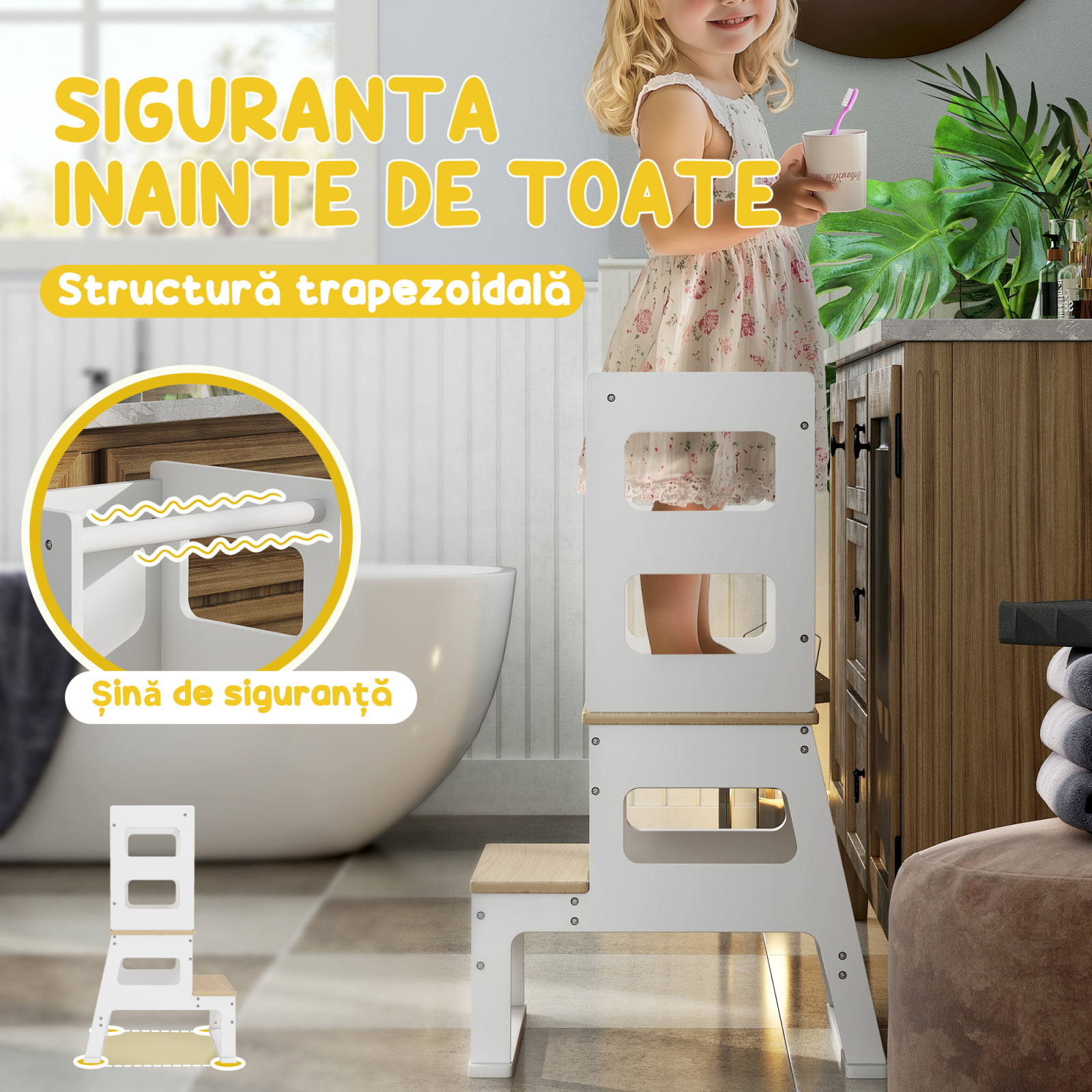 Trezeste placerea autonomiei celor mici de acasa cu turnul montessorian [BRAND NAME] pentru uz casnic. Structura favorizeaza cresterea lor, de la spalatul dintilor la ajutorul in bucatarie. Datorita prezentei unei table de scris integrate si a unei structuri trapezoidale sigure cu mana curenta, turnul se dovedeste util pentru momente de joaca si invatare acasa!