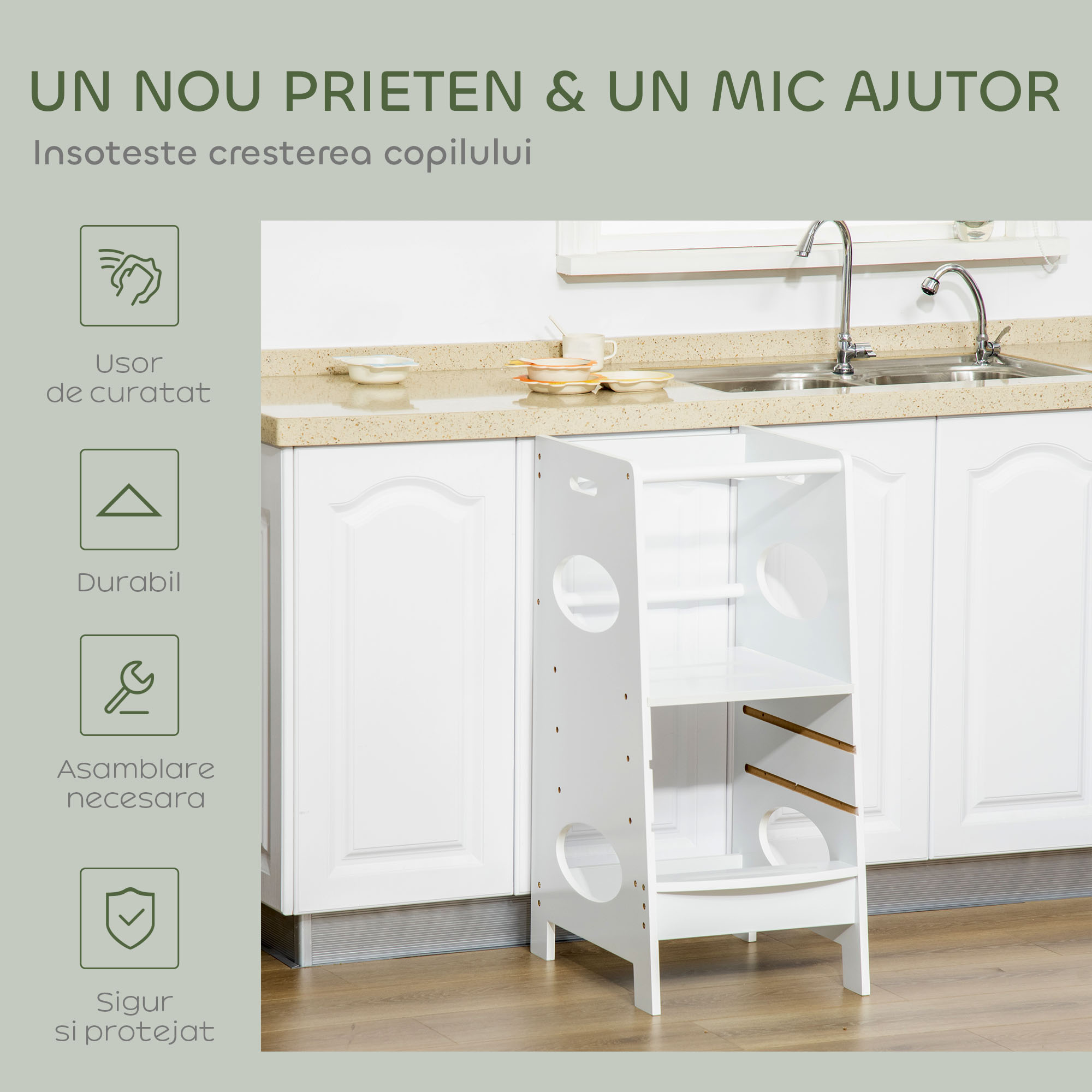 Un turn de invatare sigur si practic pentru copii, inspirat de filosofia Montessori: platforma reglabila pe inaltime, pereti laterali siguri si suport stabil din MDF. Permite implicarea copilului la activitati sigure, cum ar fi gatitul, desenul sau baie, fara a fi nevoie de ridicare de la adult. Finisajul alb si textura mata ofera estetica calma si prietenoasa cu mediul de joaca. Rolul lui este acela de a stimula autonomia si increderea copilului in medii casnice adaptate.