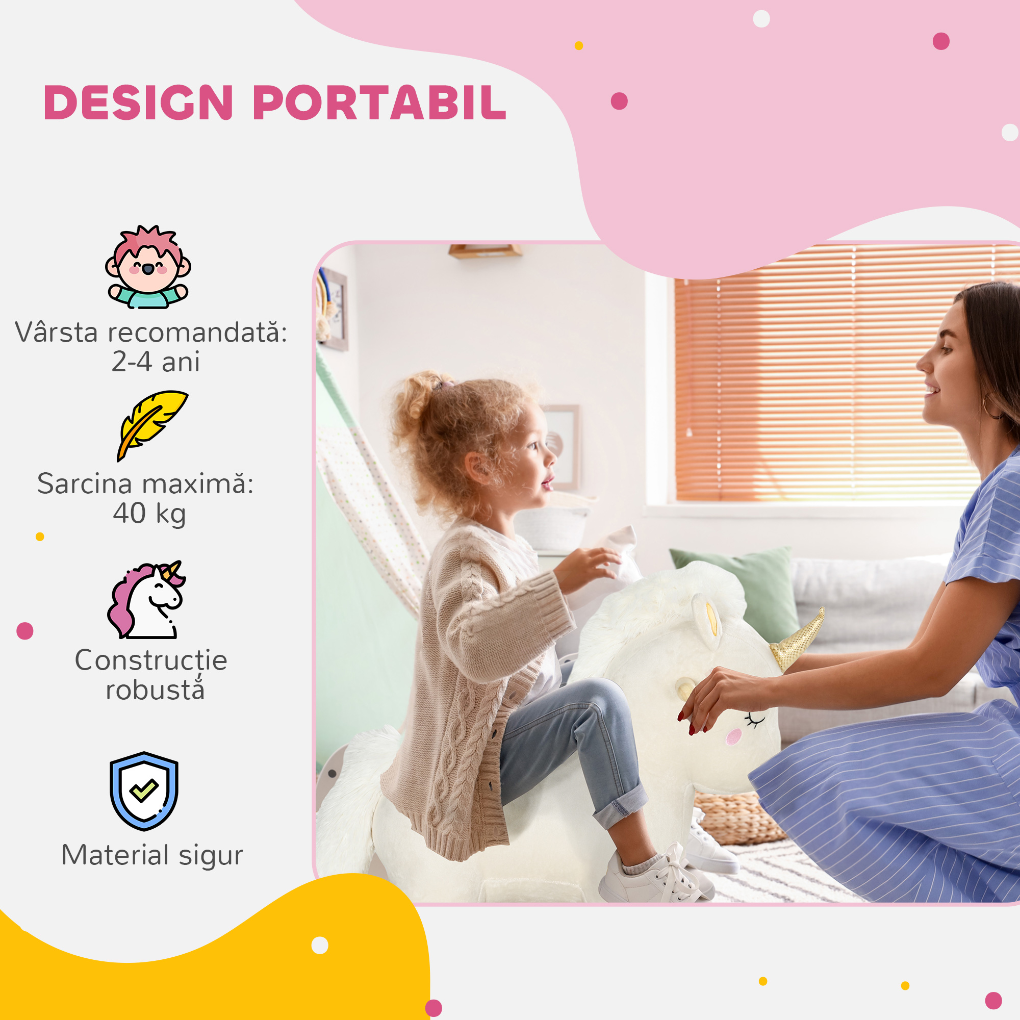 incanta-ti copilul cu un balansoar in forma de unicorn marca [BRAND NAME], destinat micutilor intre 2 si 4 ani. Realizat din materiale moi si sigure, cu o structura din lemn stabila, acest cal balansoar este prevazut cu manere laterale si emite sunete amuzante pentru o experienta interactiva. Perfect pentru joaca acasa, balansoarul unicorn stimuleaza echilibrul, imaginatia si coordonarea intr-un mod distractiv si sigur.