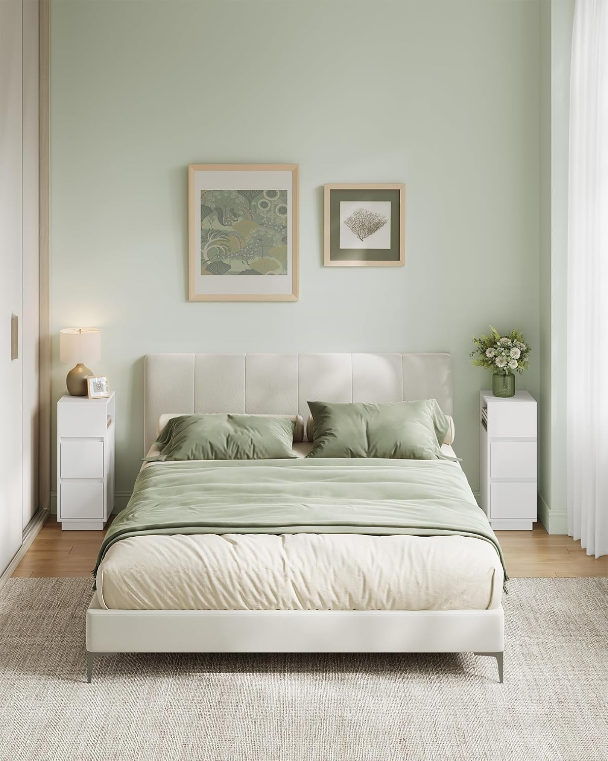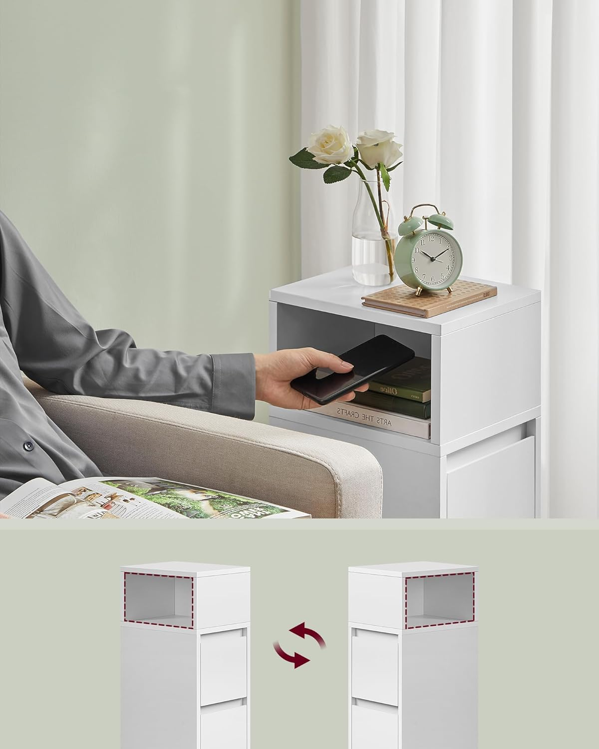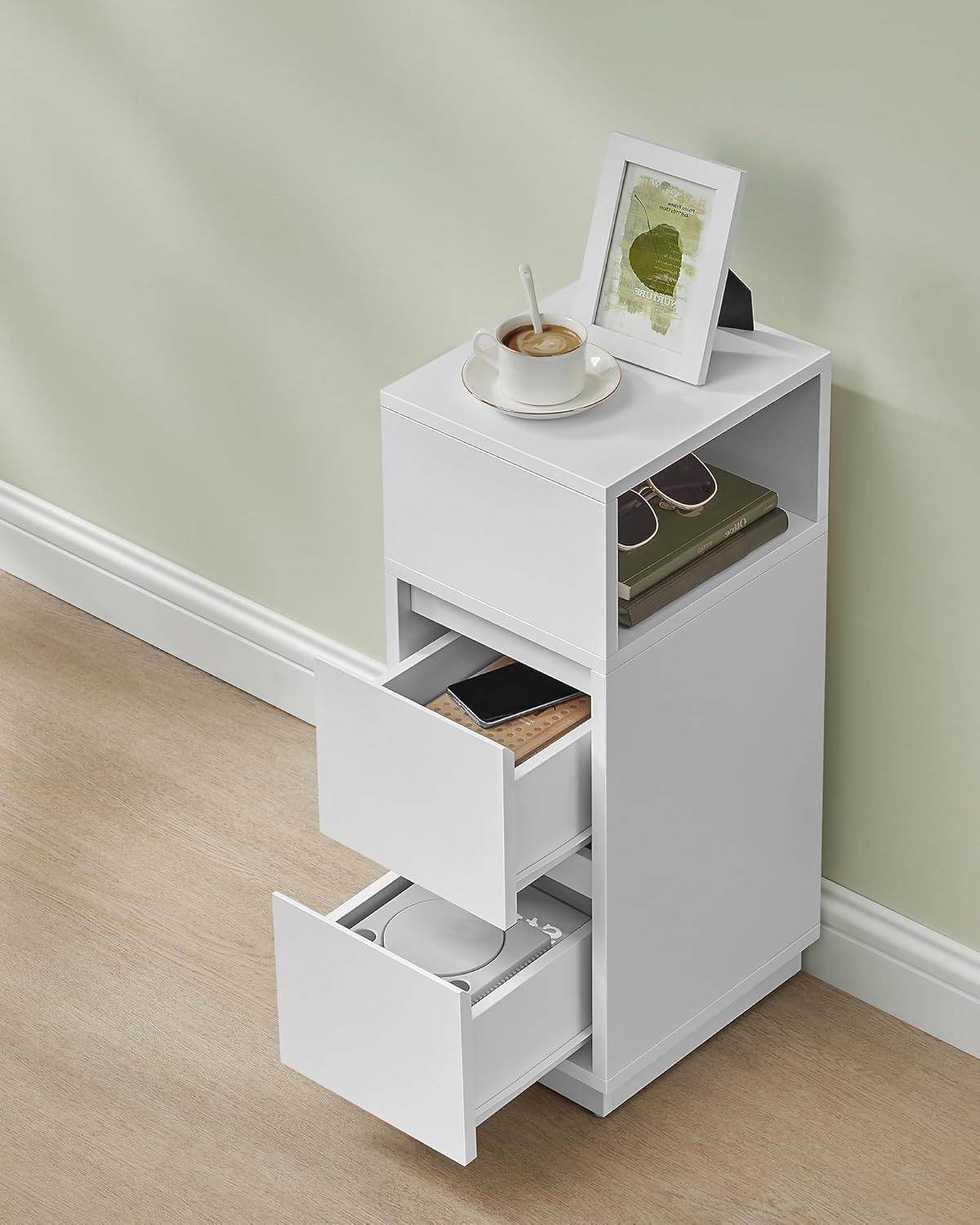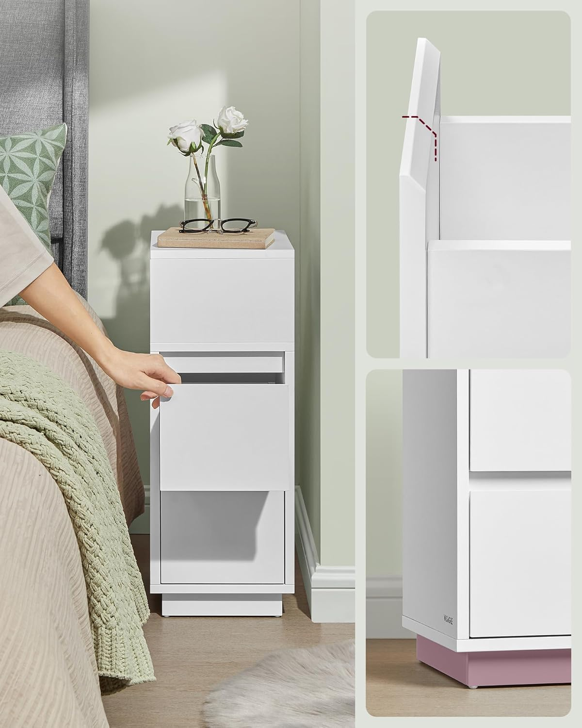 Set 2 noptiere inguste cu 2 sertare si compartiment deschis reversibil, PAL si MDF, 30x25x65 cm, alb
