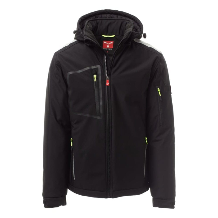 Jacheta softshell de iarna pentru barbati, cu gluga detasabila si reglabila cu snur. Este accesorizata cu elemente reflectorizante pe umeri, pe spate si pe gluga. Confectionata dintr-un amestec de 78% naylon si 22% elastan, confortabila si respirabila, asigura o protectie sporita impotriva vantului (windproof) si impotriva apei (waterproof - WP 8000 mm H₂O, WVT 5000 g/m² 24h). Captuseala moale interioara o face potrivita pentru vremea rece si friguroasa. Este echipata cu doua buzunare laterale cu fermoar, unul la piept si unul pe maneca stanga, inchise cu fermoar de culoare contrastanta si detaliu reflectorizant. Inchiderea frontala se face cu ajutorul unui fermoar metalic cu sistem de "semi-autoblocare"._x000D_\n_x000D_\n_x000D_\n_x000D_\n