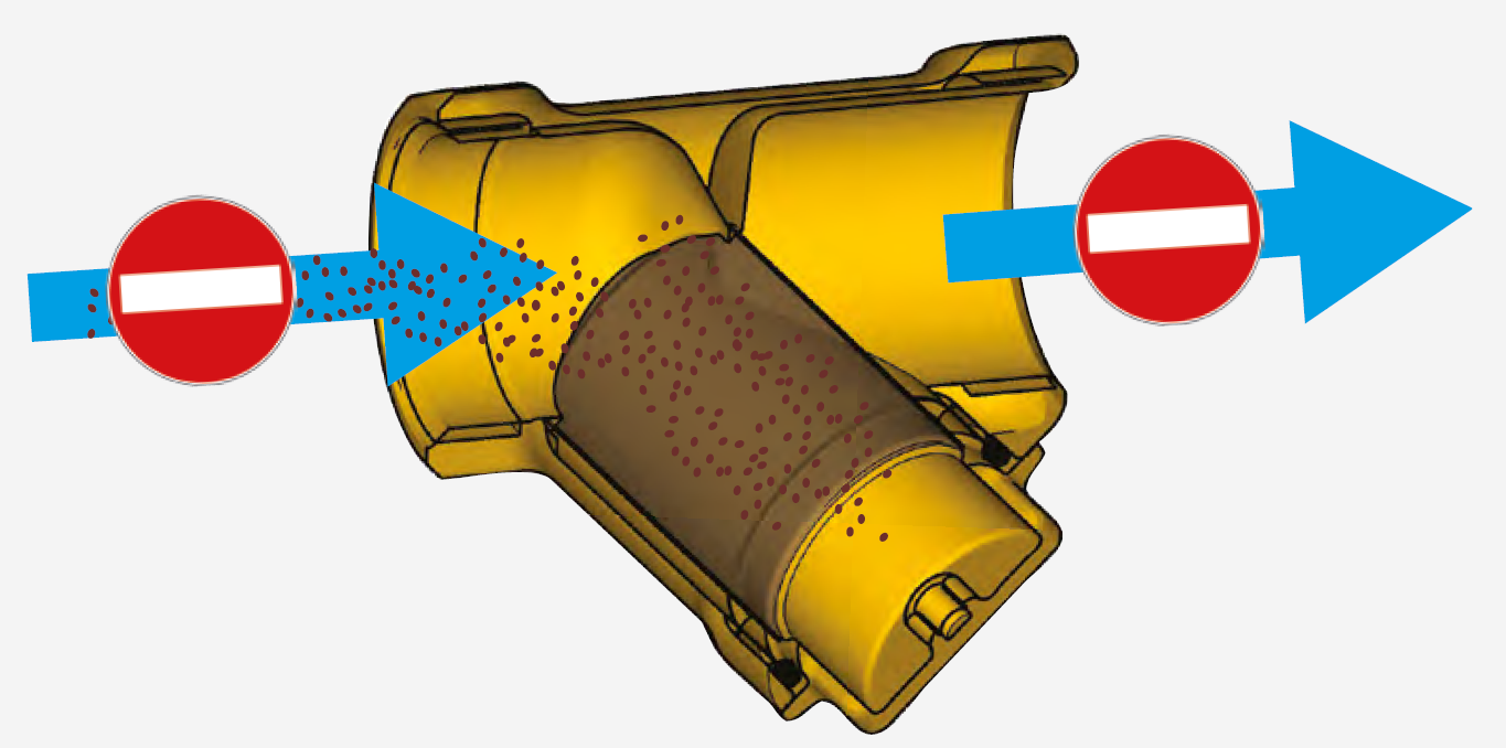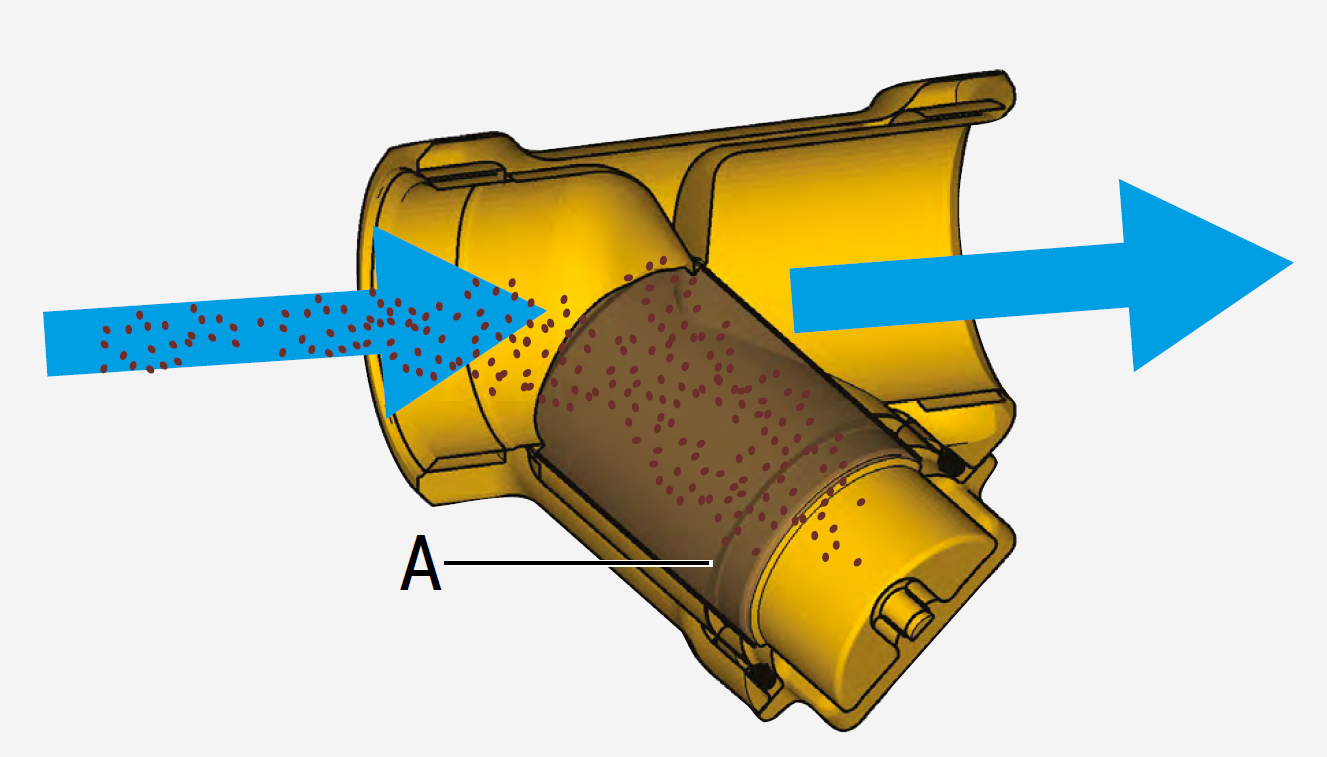 Fluxul de lichid patrunde in filtru si este incetinit, permitand separarea impuritatilor solide prezente in fluid. Impuritatile solide sunt retinute atunci cand intra in contact cu sita metalica (A), dupa care cad in partea inferioara a filtrului. Corpul filtrului este proiectat astfel incat sa utilizeze intreaga suprafata de filtrare, prelungind durata de functionare pana la murdarirea completa a sitei.