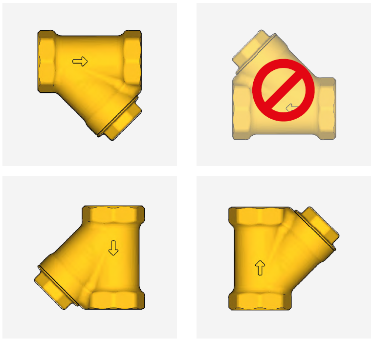 Pentru o eficienta mai mare in retinerea si depunerea impuritatilor solide, este recomandata montarea filtrului pe o conducta orizontala, cu capacul orientat in jos. Pentru o instalare corecta, verificati sensul de curgere indicat de sageata inscriptionata pe corpul filtrului.