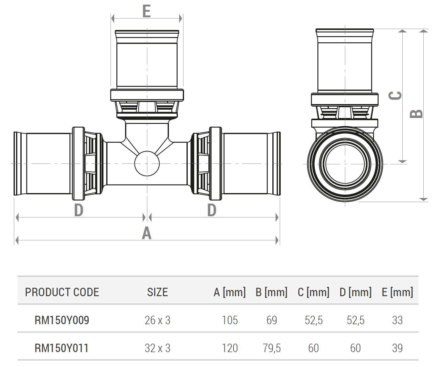 Teul de presare multiprofil Giacomini RM150Y009 este destinat instalatiilor de apa calda si rece, instalatiilor termice sau de racire, fiind compatibil cu tevi multistrat sau din plastic. Corpul este realizat din alama CW617N conform EN 12165, ceea ce asigura rezistenta ridicata la coroziune si durabilitate in timp. Elementele de etansare sunt formate din doua inele O-Ring negre din EPDM, conforme EN 681-1, potrivite pentru apa potabila si agent termic cu un continut maxim de glicol de pana la 50%.